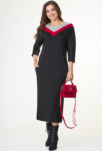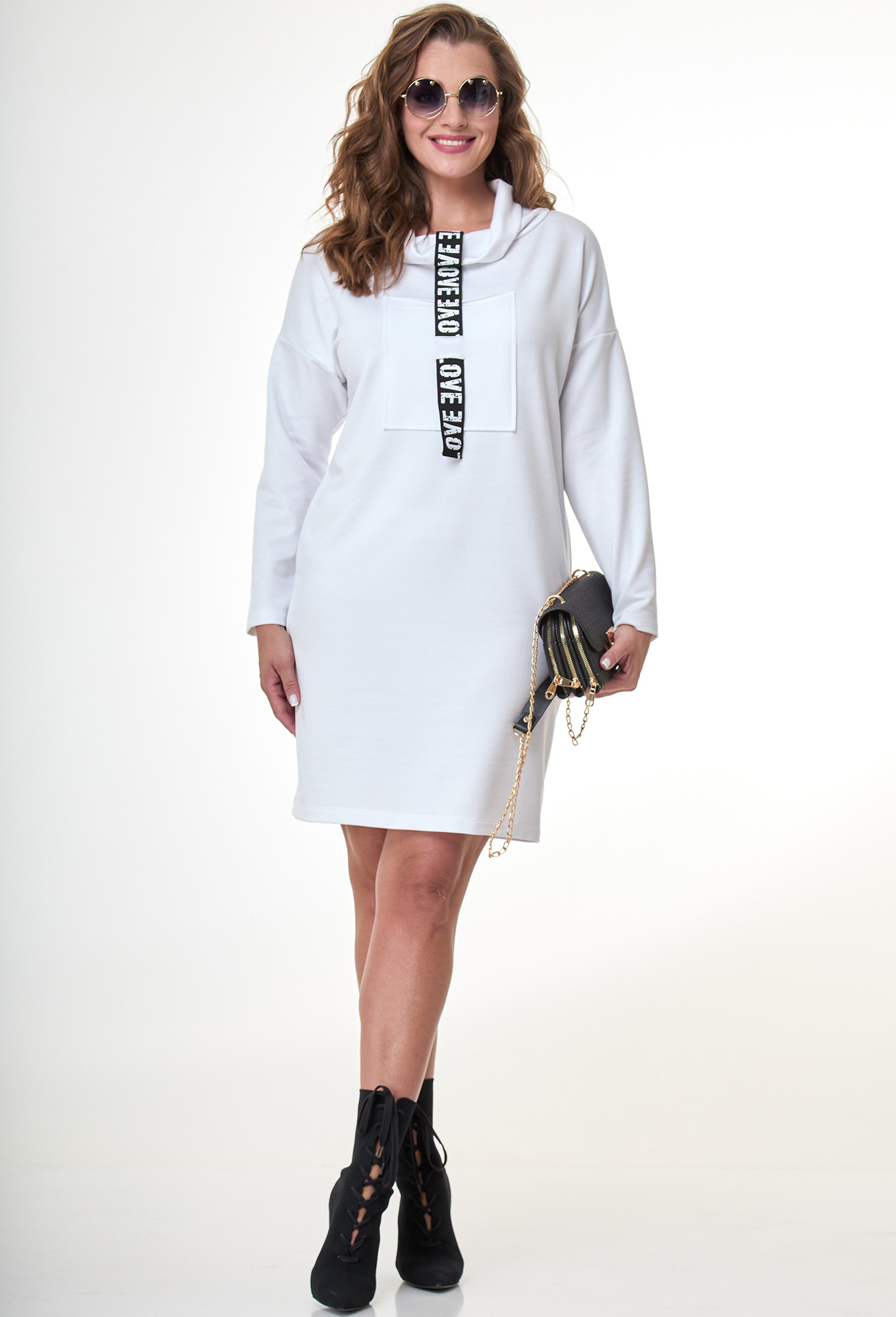 Хлопковое платье прямого силуэта, слегка зауженное книзу. Спереди интересный карман с отделочной деталью от горловины. Воротник «шалька».