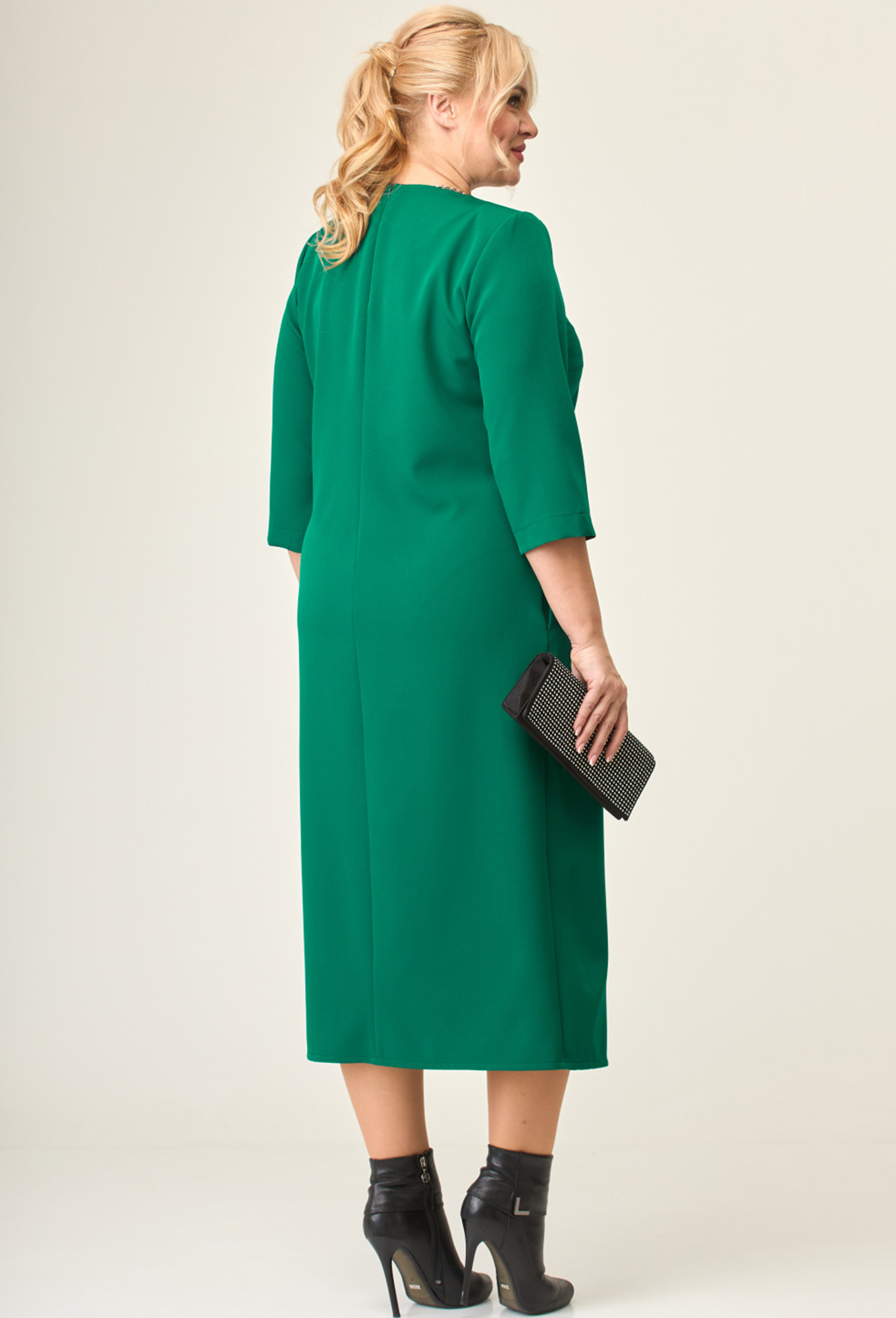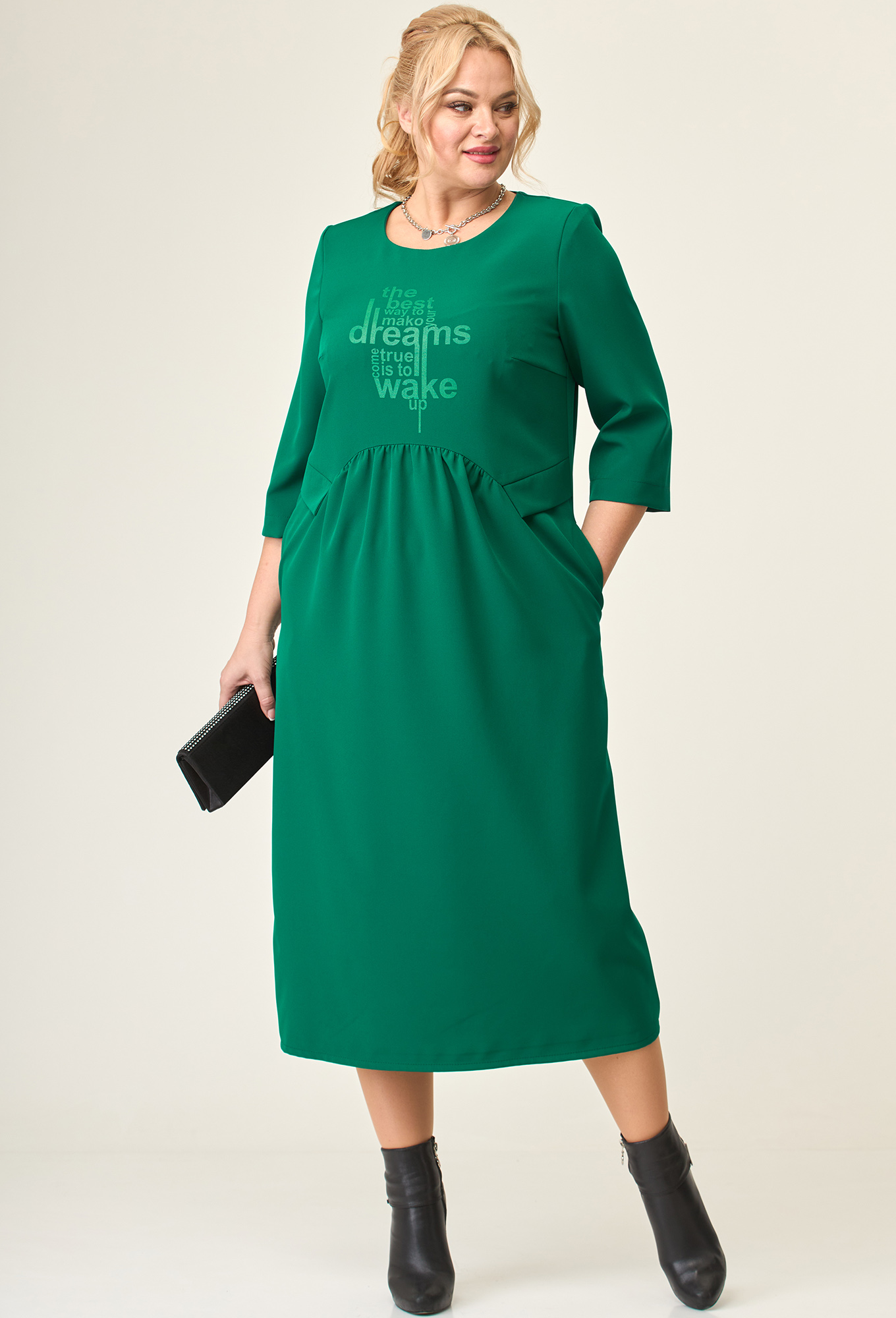 По переду отрезное, фигурной формы передняя часть, собранная в сборку, переходящая в клапаны. Сбоку платья функциональные карманы. По переду платья принт в цвет ткани. Сзади платье на молнии.
