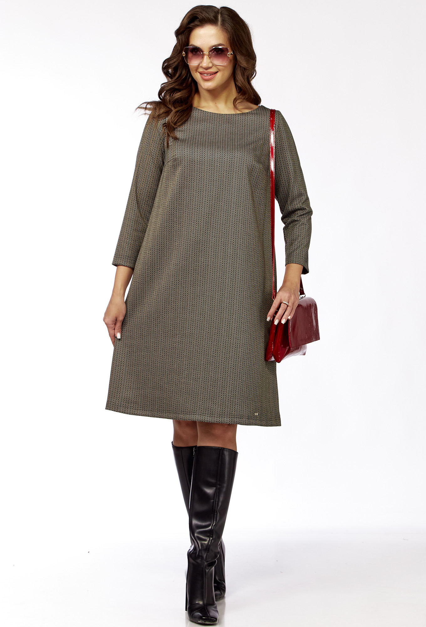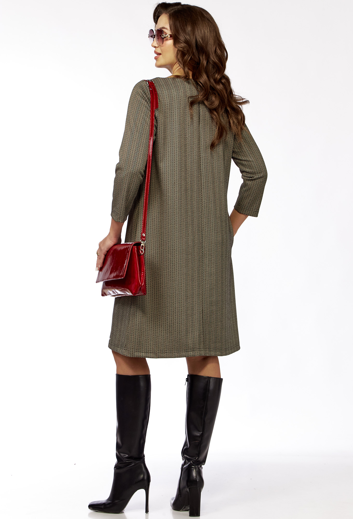Элегантное женское платье из трикотажной ткани хорошего качества. Платье трапеция с рукавом 7/8. Длина платья от плеча по спинке 102 см, рукава 51,5 см. Сзади платье на молнии и с разрезом по низу. Спереди украшение снизу платья.