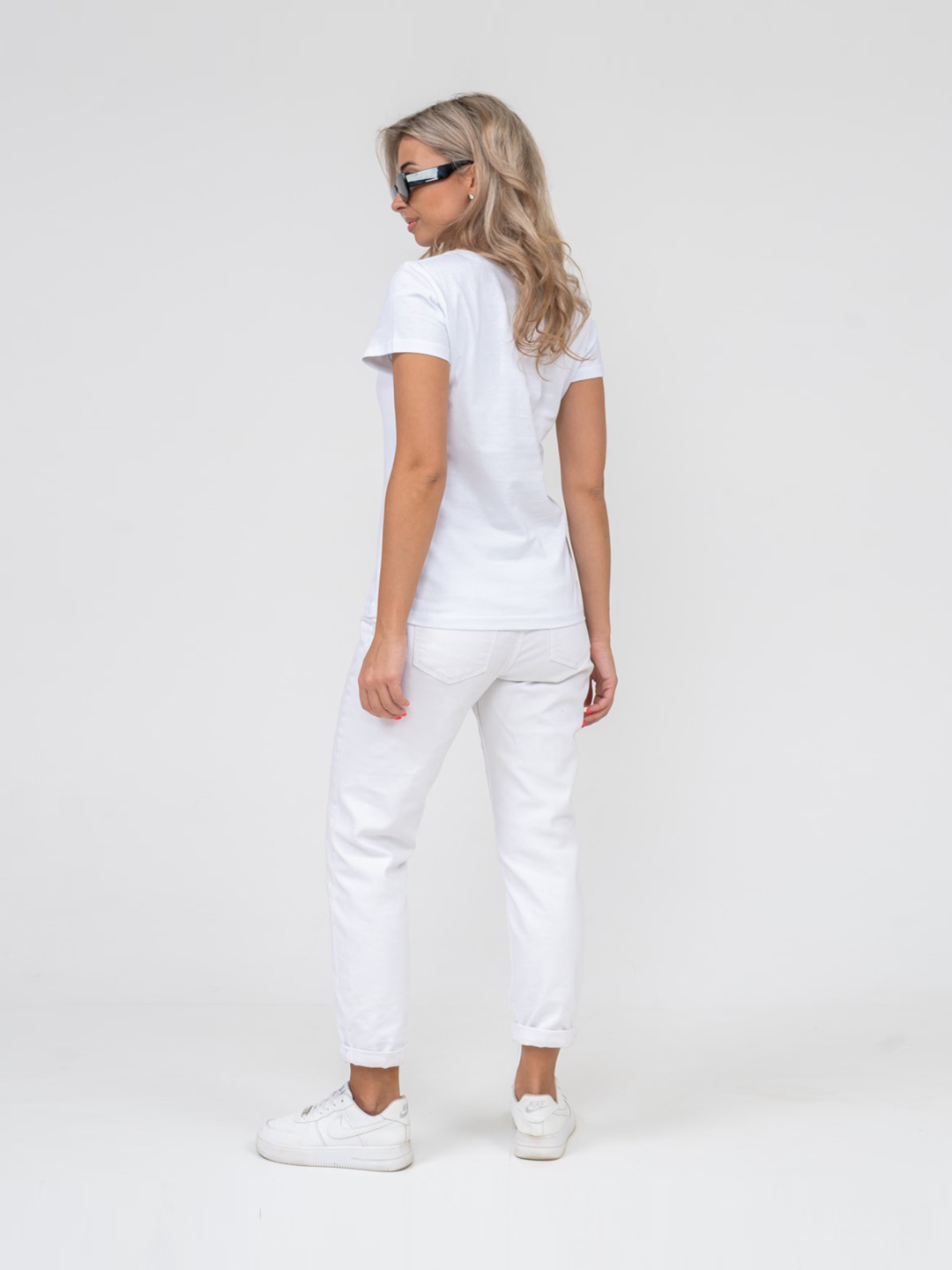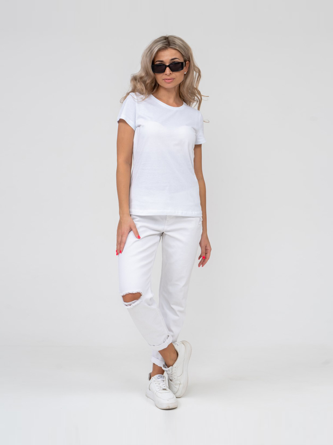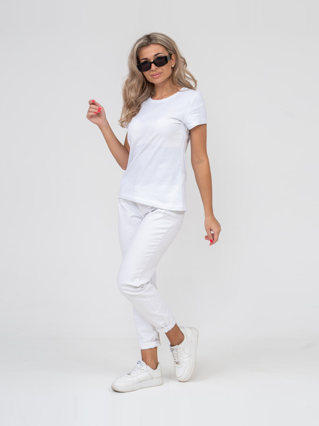 Футболка женская - базовая из натурального хлопкового полотна. Вырез горловины О-образный. Рукав втачной, базового кроя.