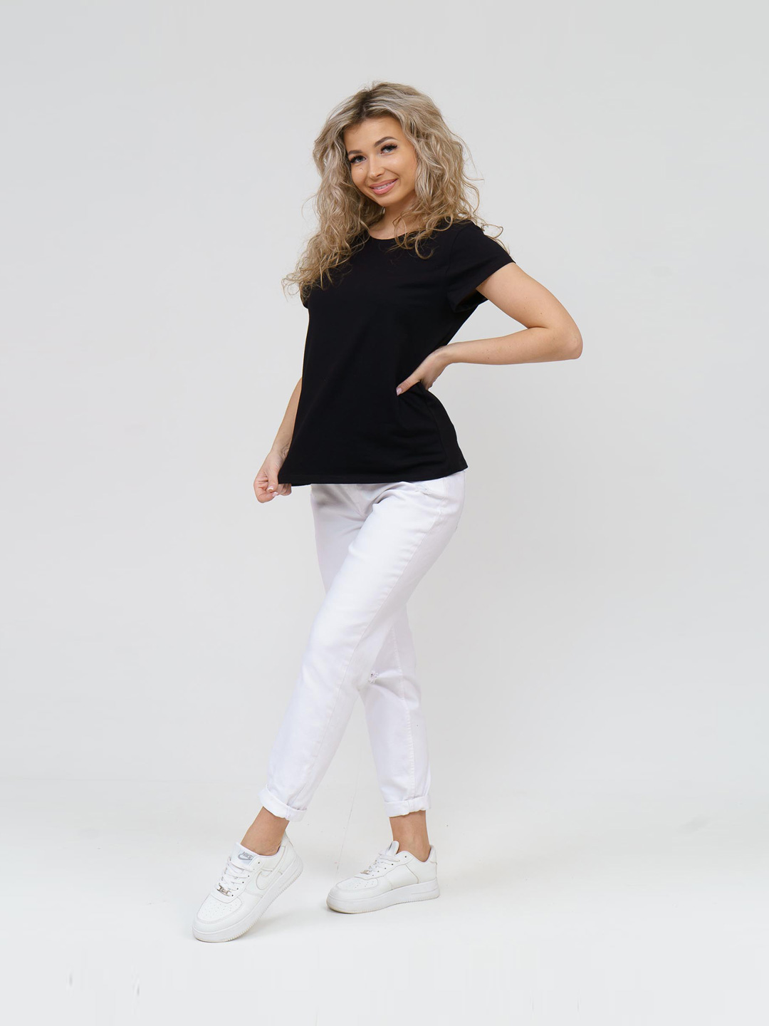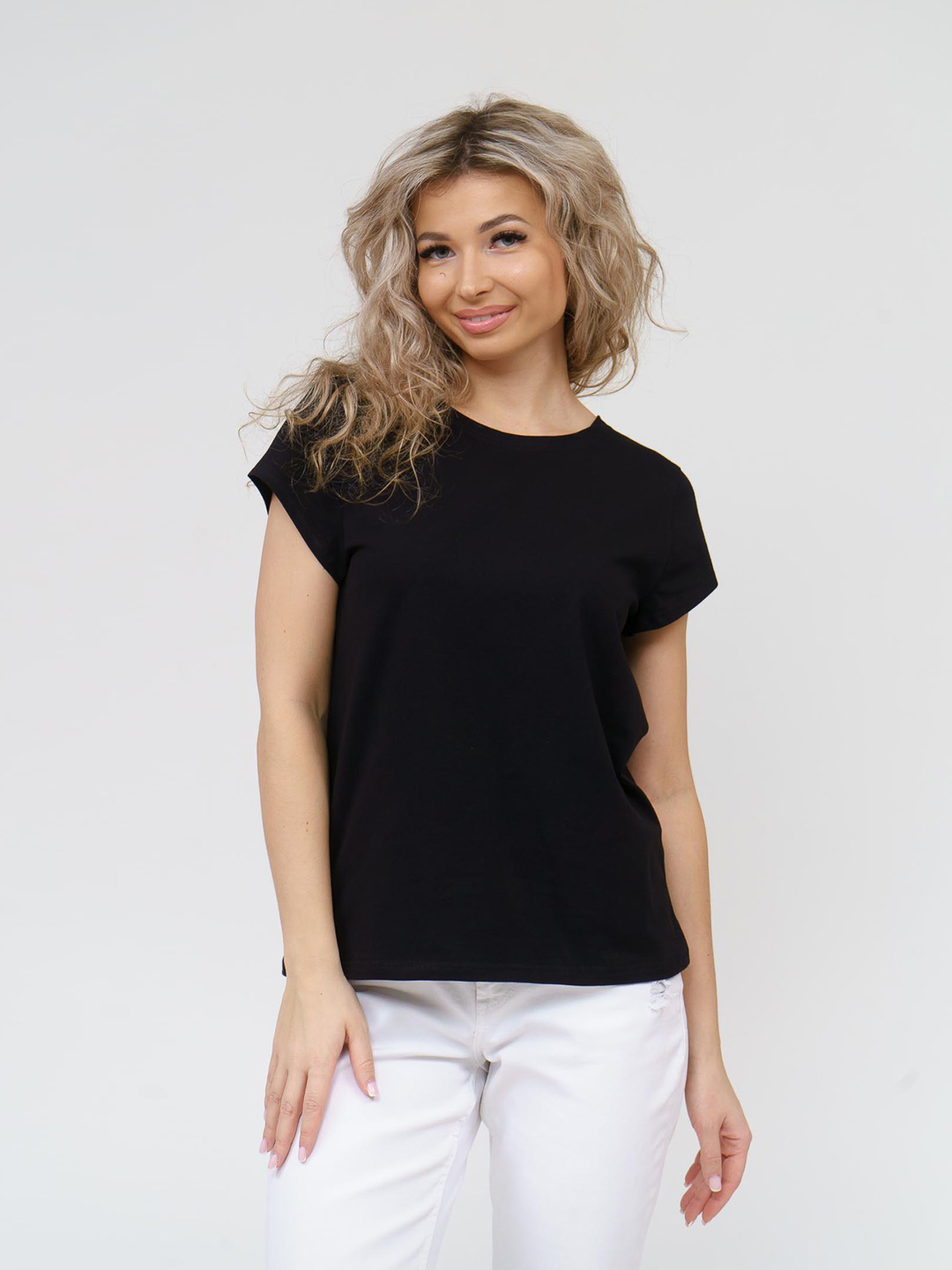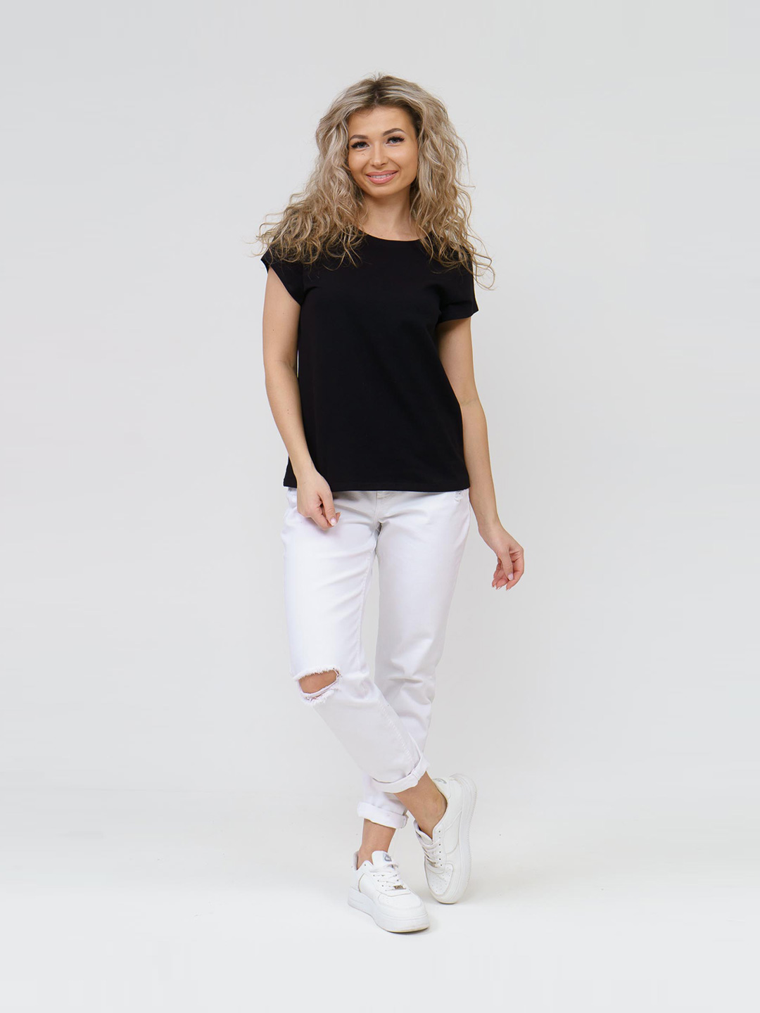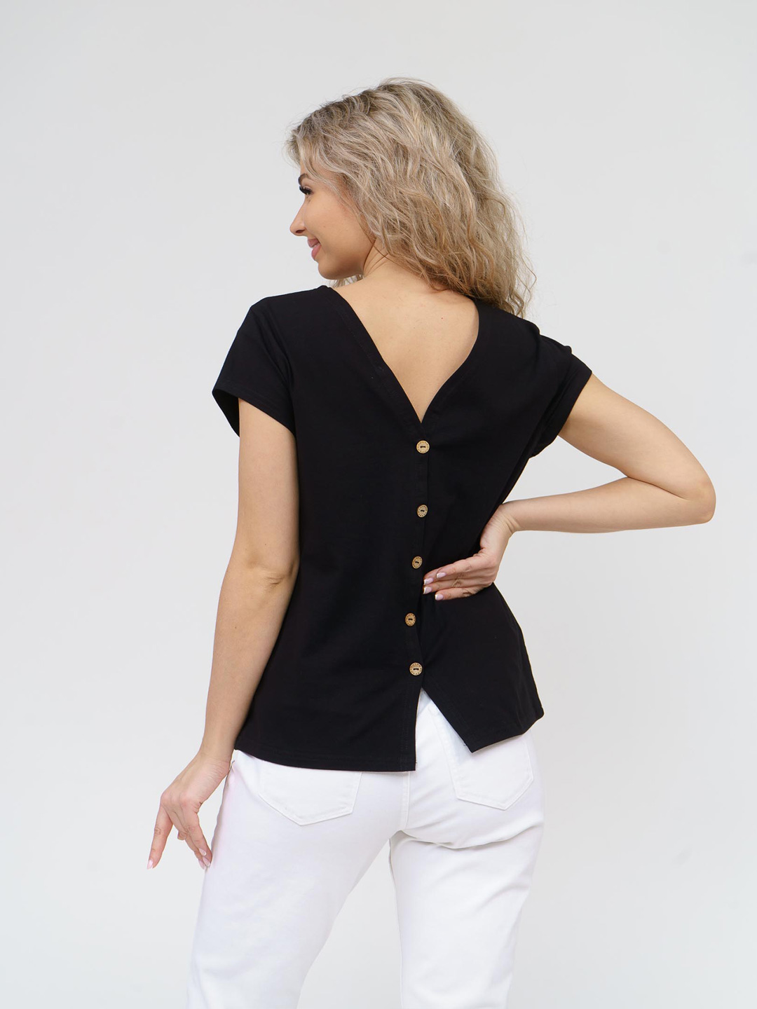 Футболка с оригинальным кроем, спинка выполнена на запах с фальшивой застежкой на пуговицы. Изделие представлено в нескольких базовых цветах.