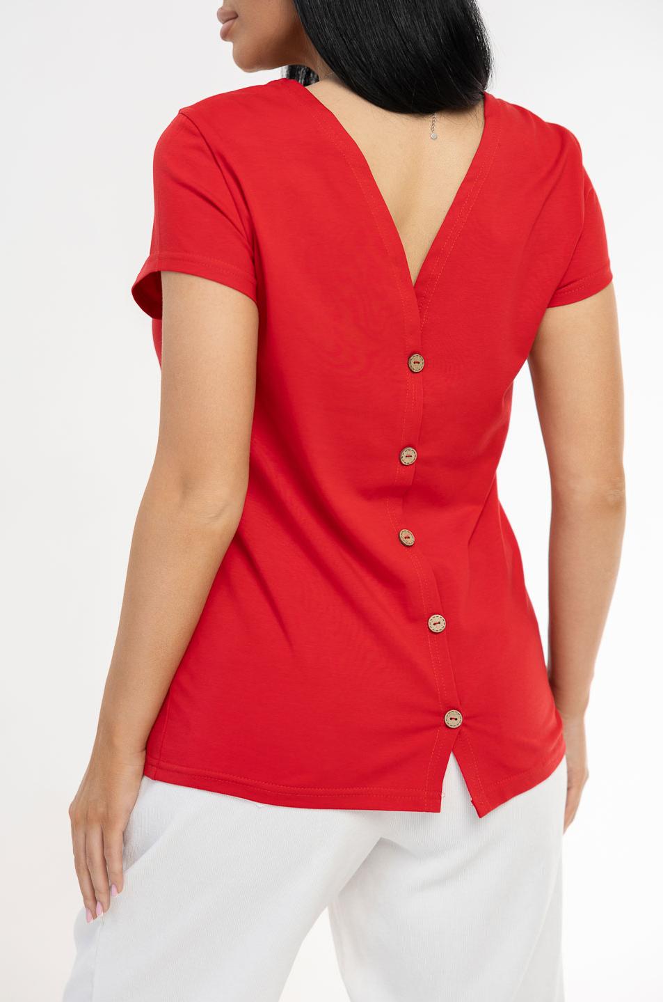 Футболка с оригинальным кроем, спинка выполнена на запах с фальшивой застежкой на пуговицы. Изделие представлено в нескольких базовых цветах.