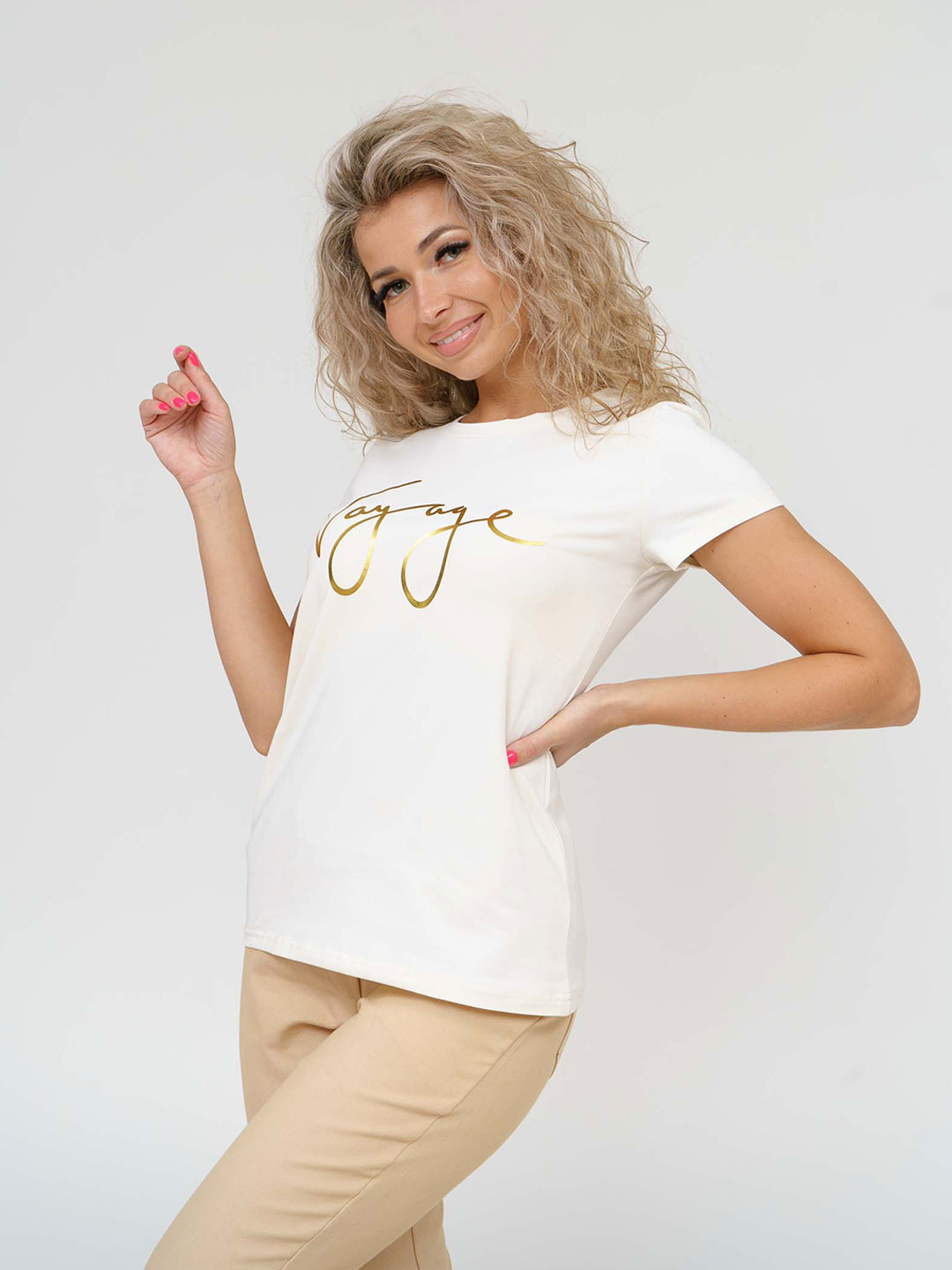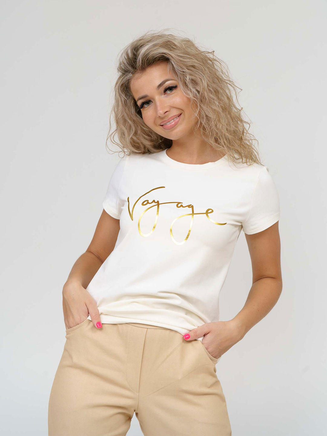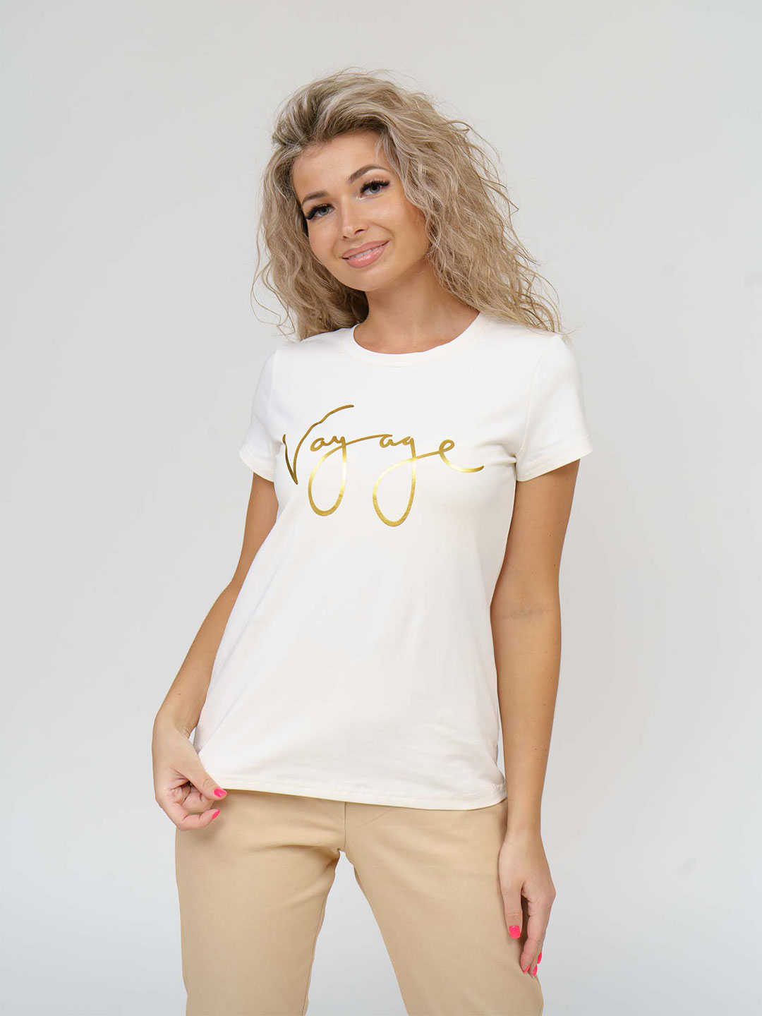 Базовая женская футболка, прямого силуэта, с О-образной горловиной и коротким рукавом. Представлена в 3 базовых цветах. Спереди печать на полочке.
