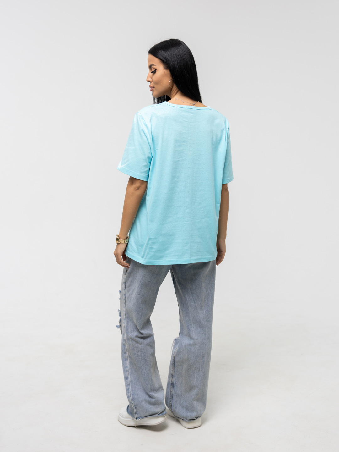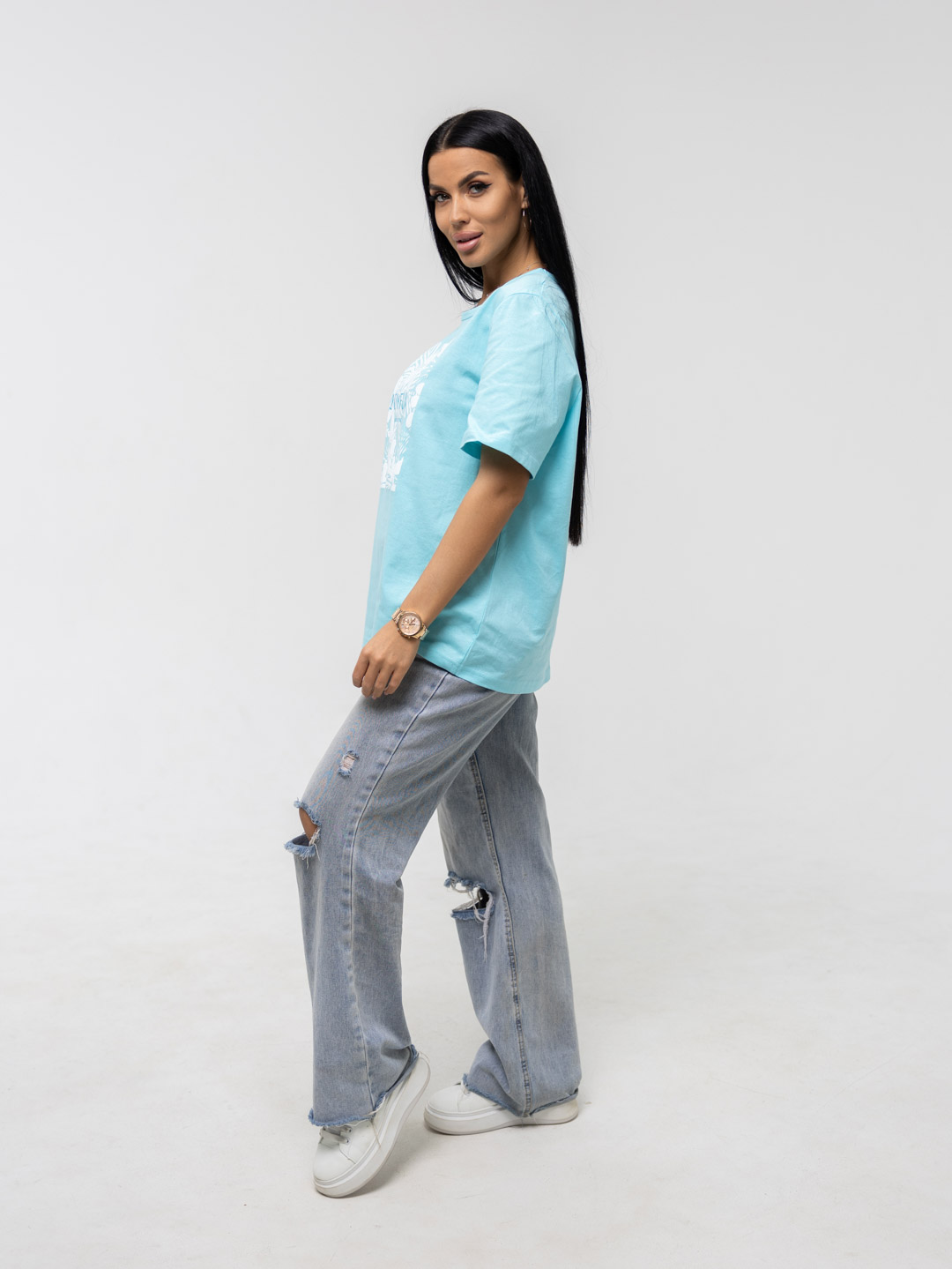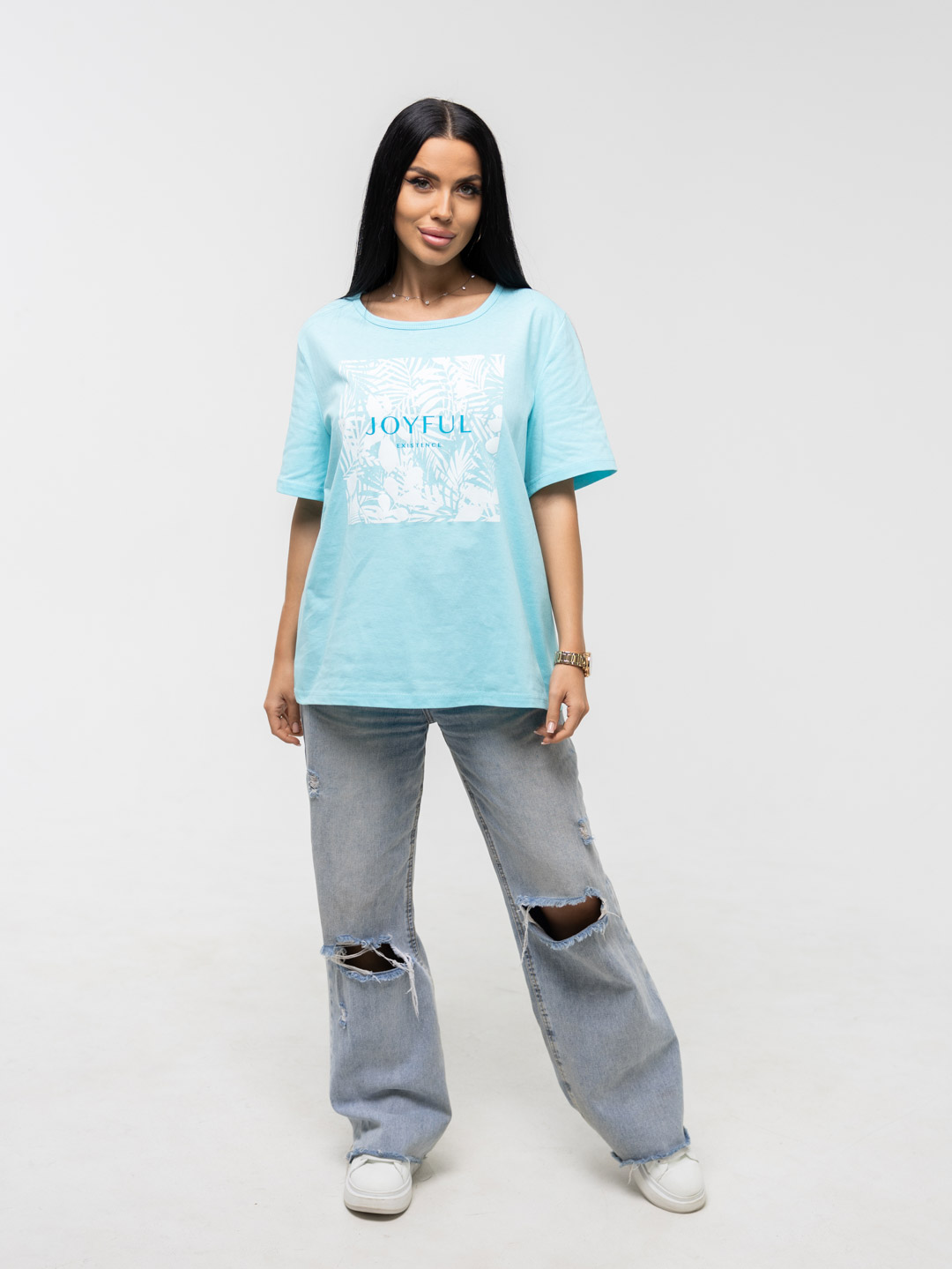 Футболка женская, прямого силуэта с принтом, О-образной горловиной. Рукав короткий, свободный. Футболка выполнена из трикотажного полотна 100% хлопка.