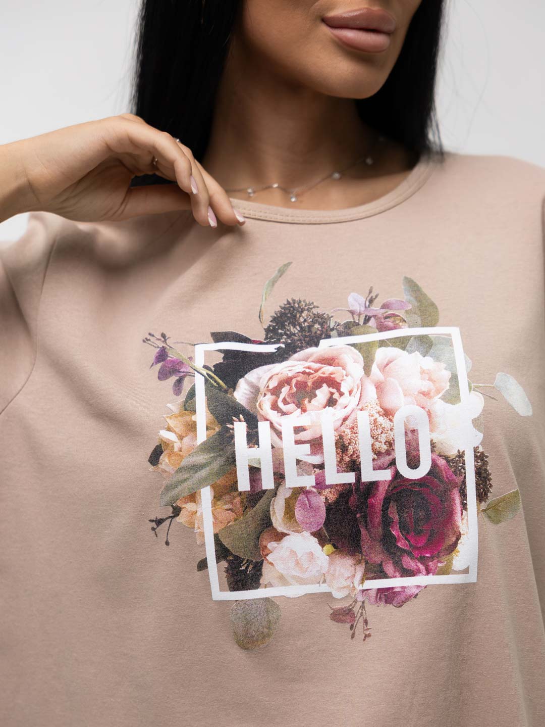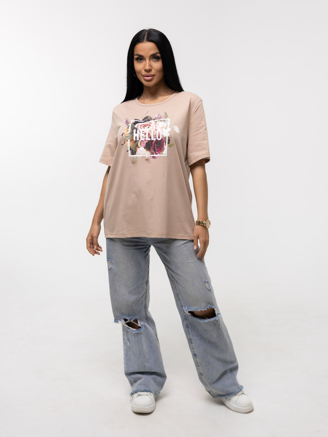 Футболка женская, прямого силуэта с принтом, О-образной горловиной. Рукав короткий, свободный. Футболка выполнена из трикотажного полотна 100% хлопка.