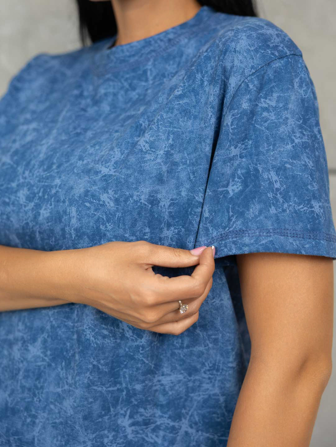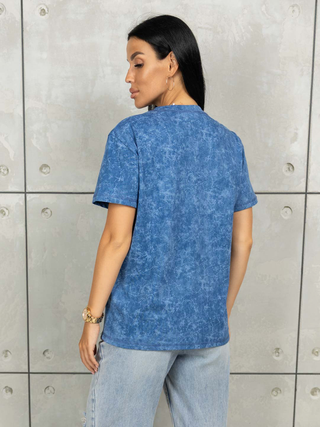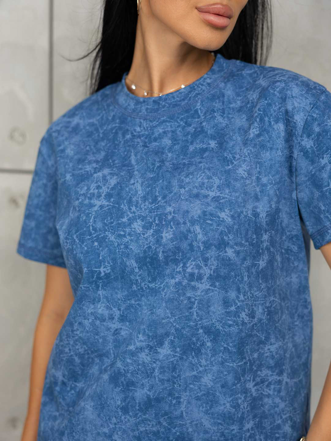 Футболка женская прямого кроя, с округлой горловиной и коротким спущенным рукавом. Материал футболки имеет яркий рисунок в стиле - варёнка.