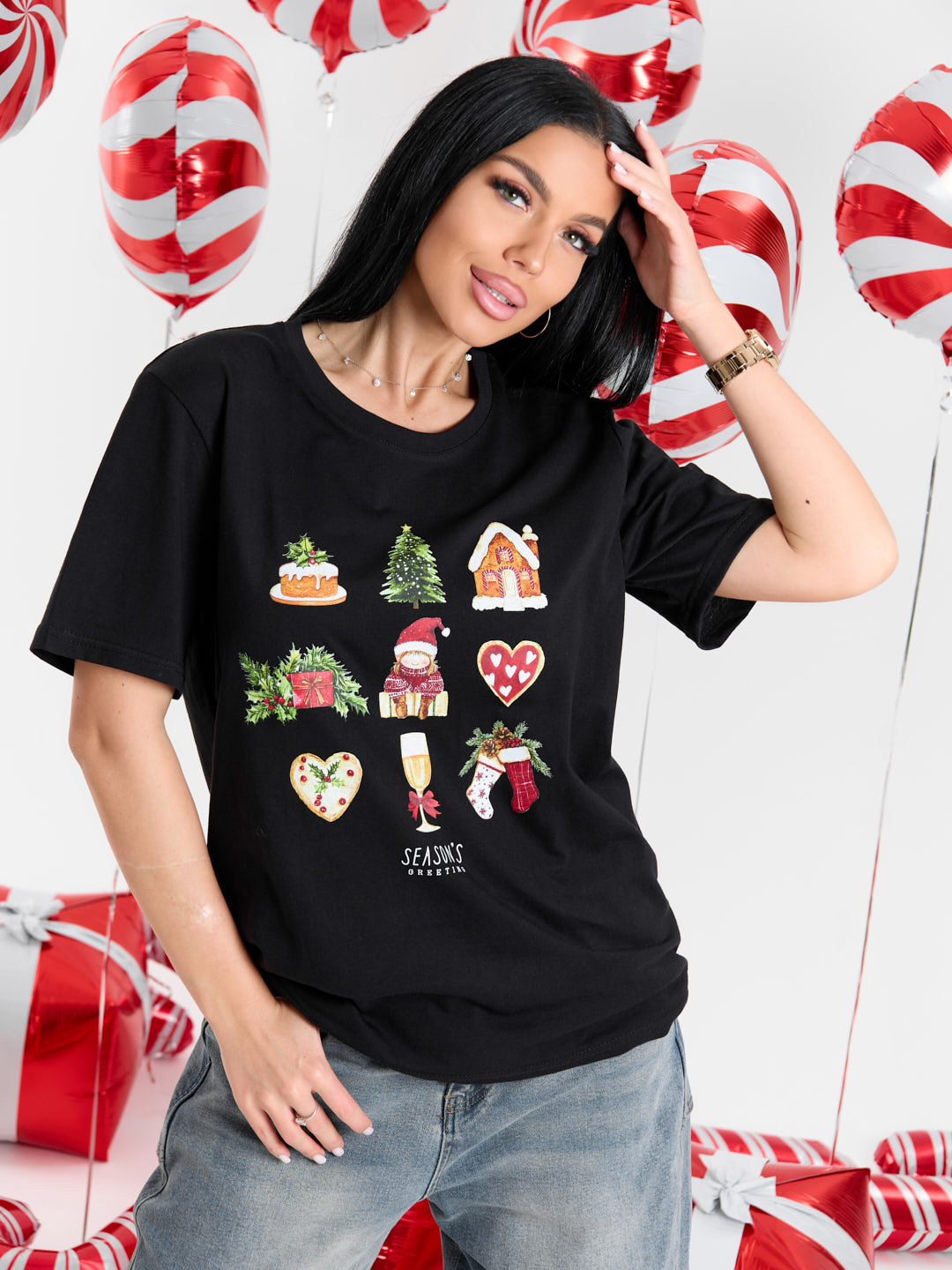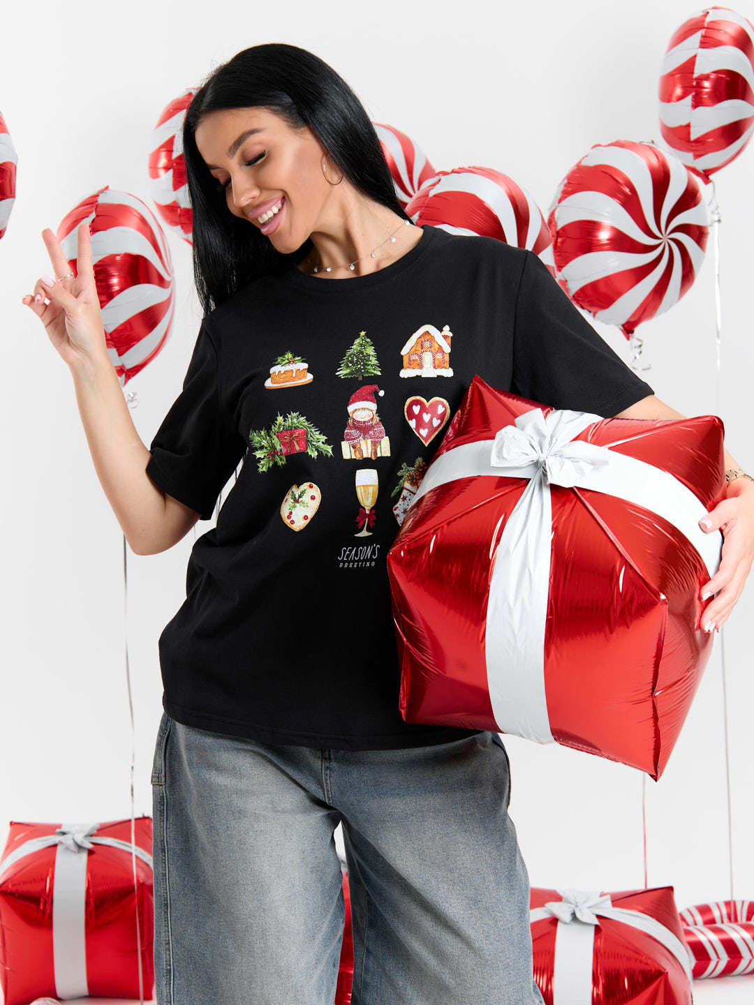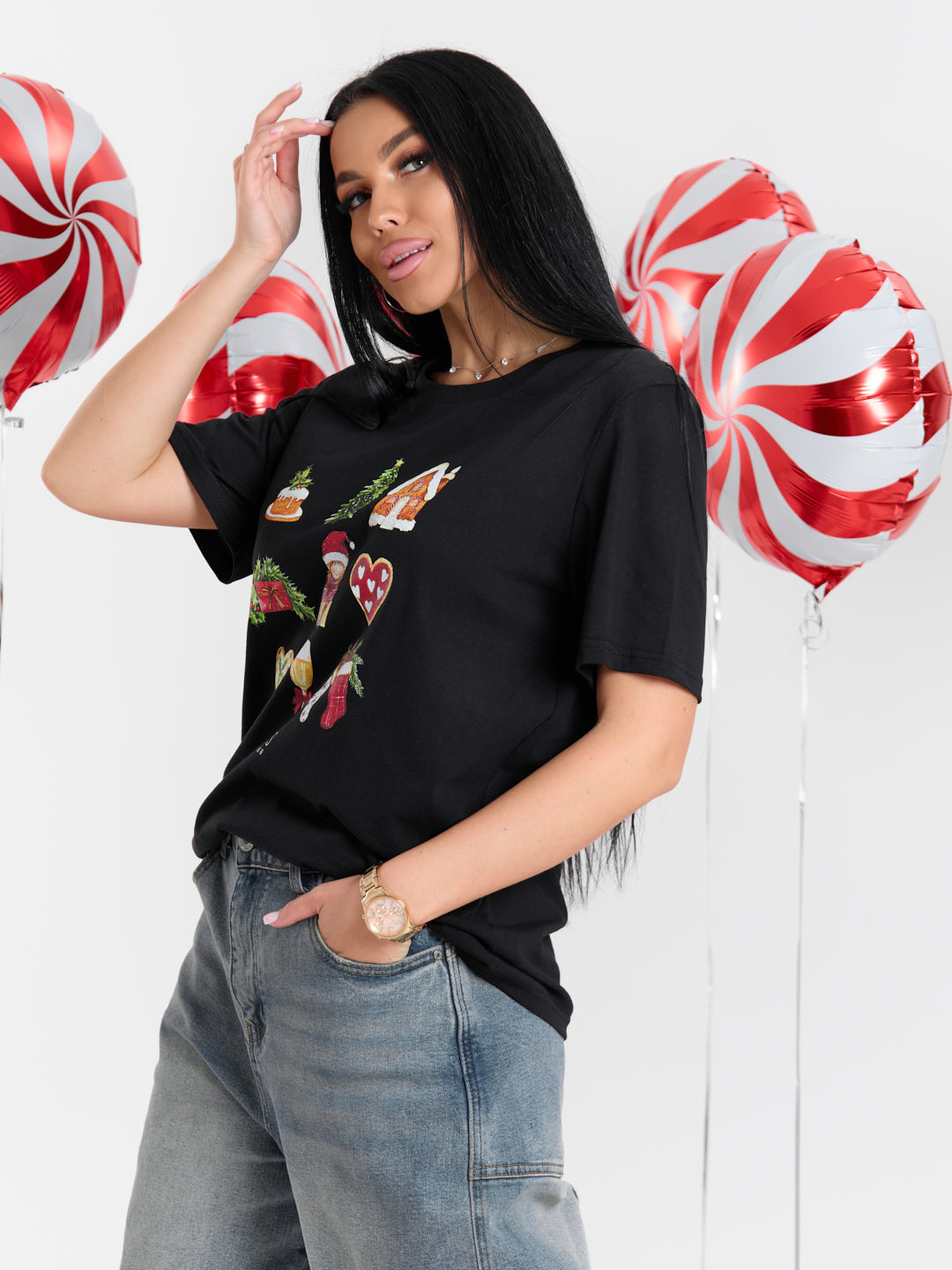 Эта футболка с новогодним принтом создана для тех, кто любит атмосферу зимних праздников. Яркие краски сразу вызывают ассоциации с тёплыми семейными вечерами, подарками под ёлкой и ароматом имбирного печенья. Классическая футболка с коротким рукавом и О-образной горловиной, будет отлично смотреться как за новогодним столом, так и в канун праздников.