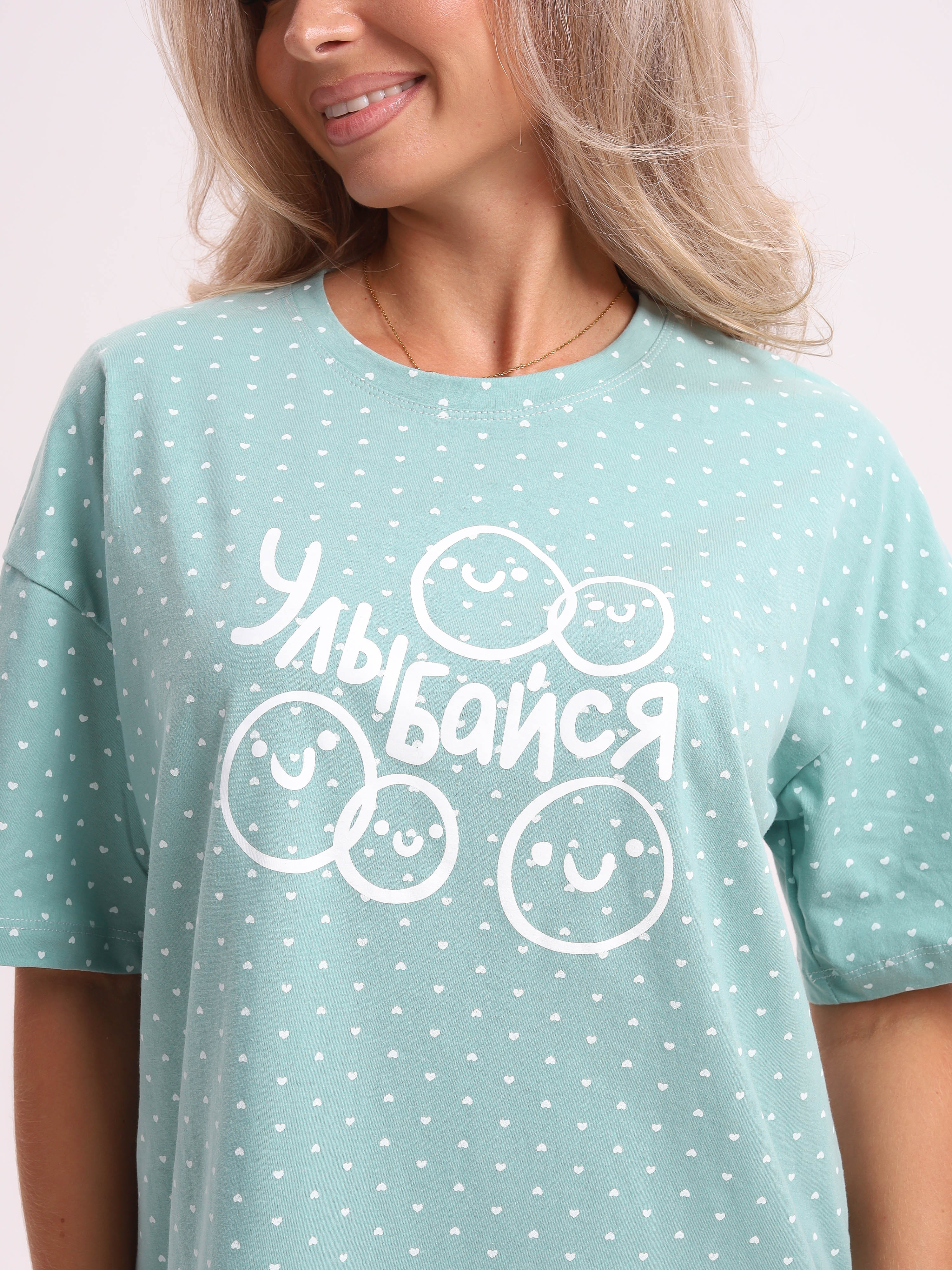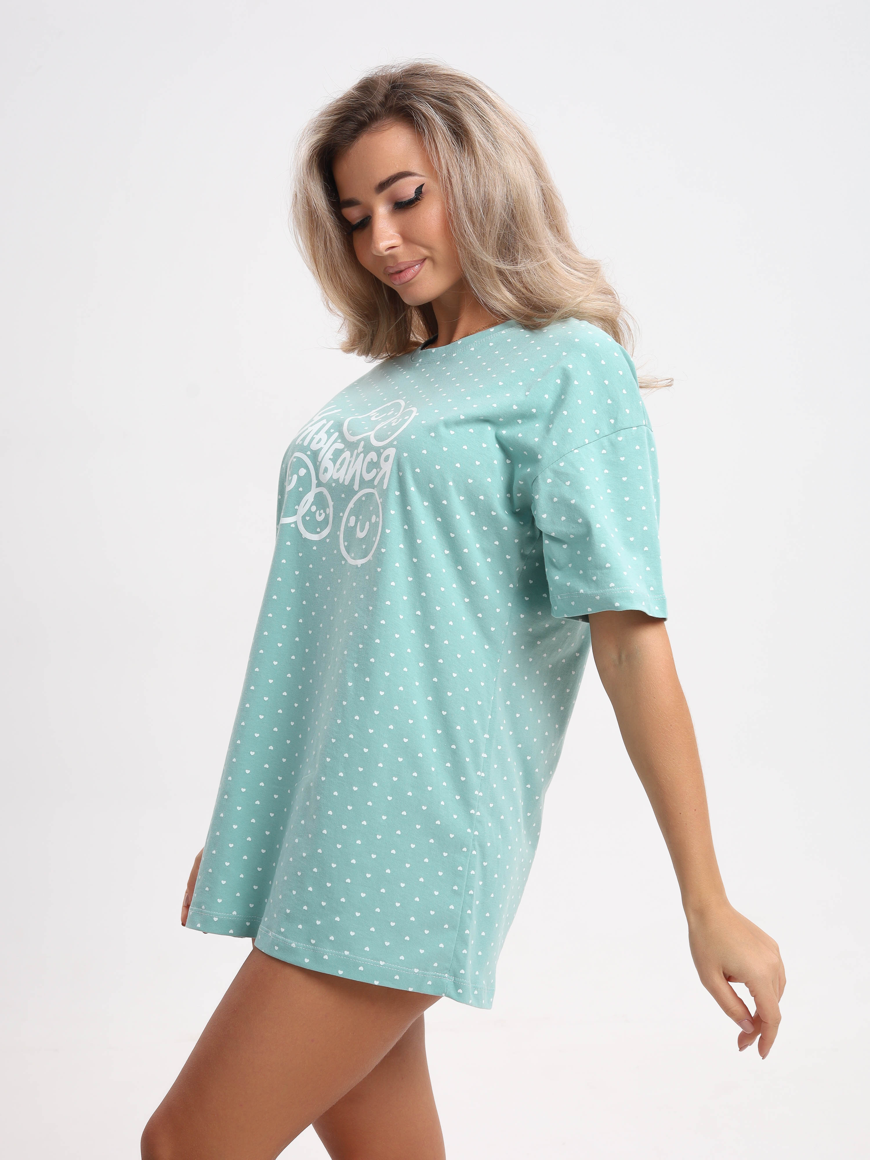 Футболка женская, удлиненная. Силуэт свободный. Данная модель имеет округлый вырез и спущенный рукав, что придает ей дополнительный неповторимый шарм. На полочке печатный рисунок в виде надписи.