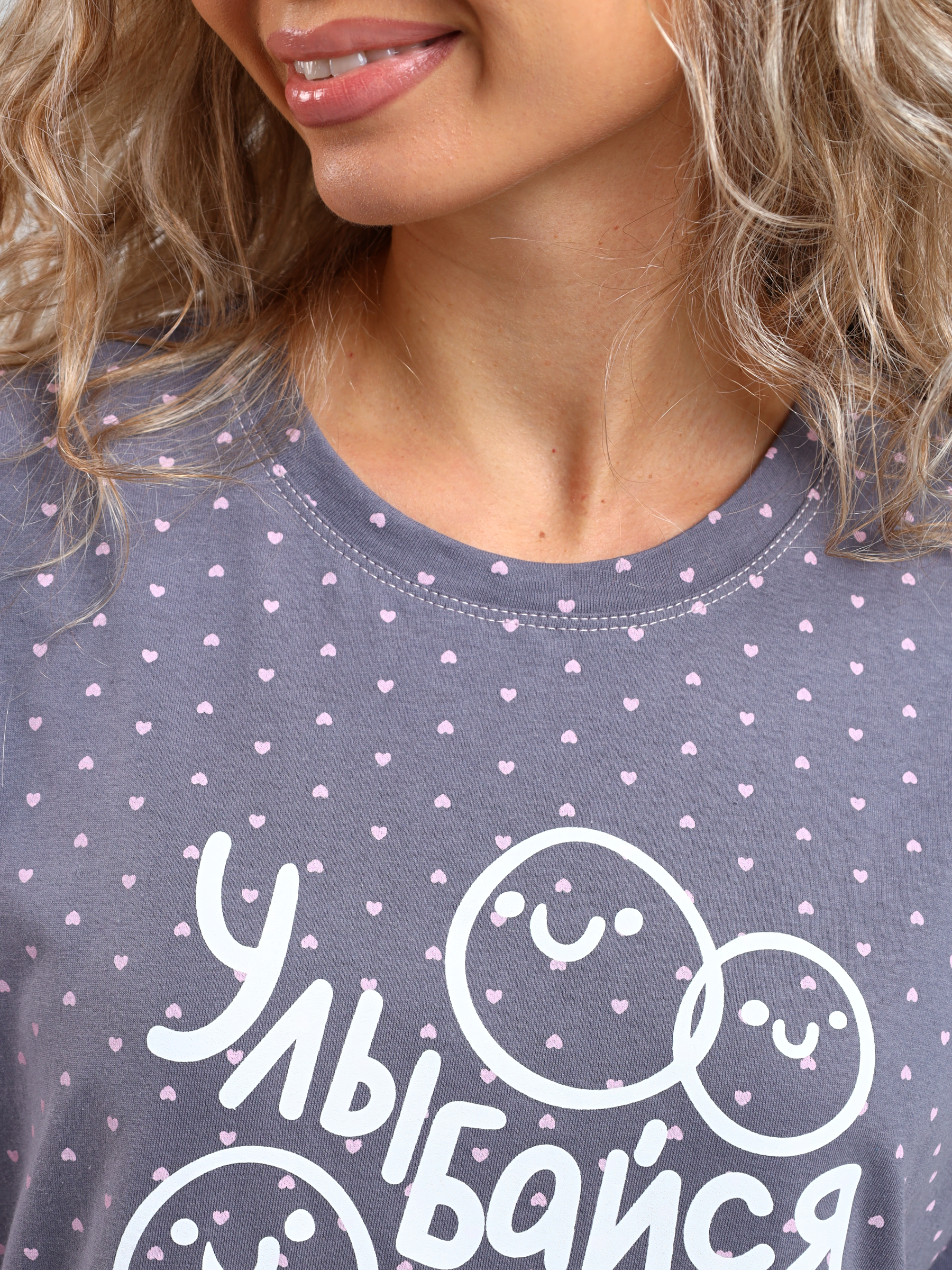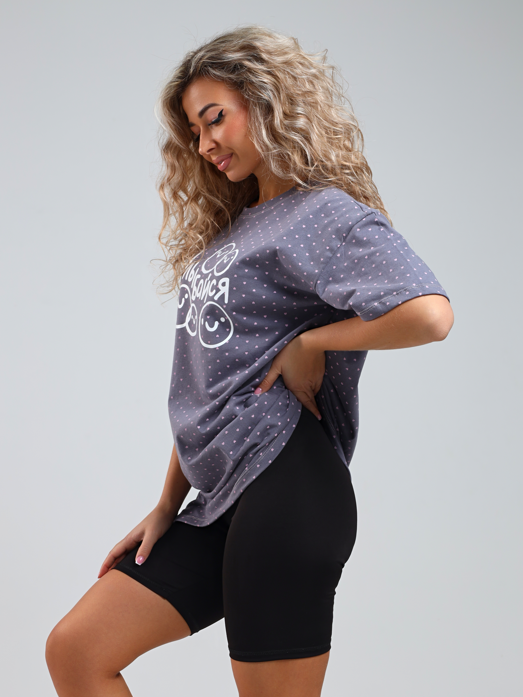 Футболка женская, удлиненная. Силуэт свободный. Данная модель имеет округлый вырез и спущенный рукав, что придает ей дополнительный неповторимый шарм. На полочке печатный рисунок в виде надписи.