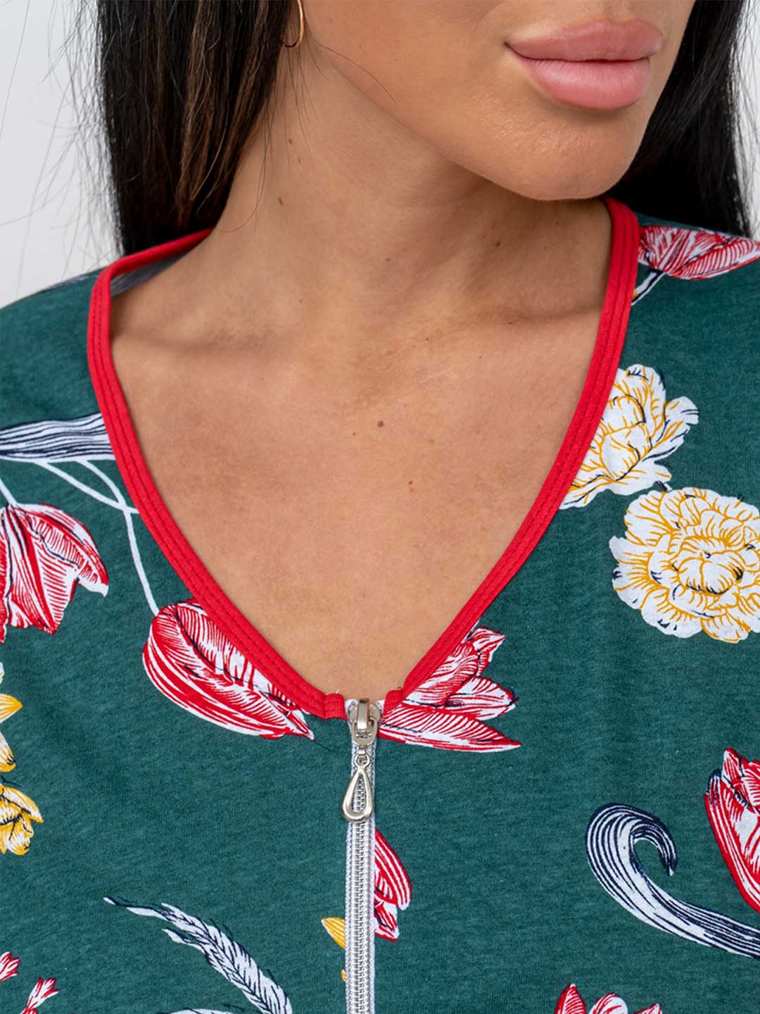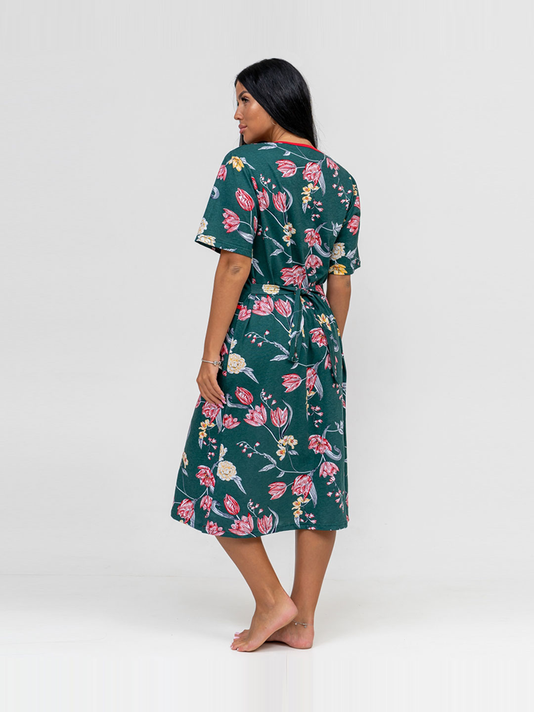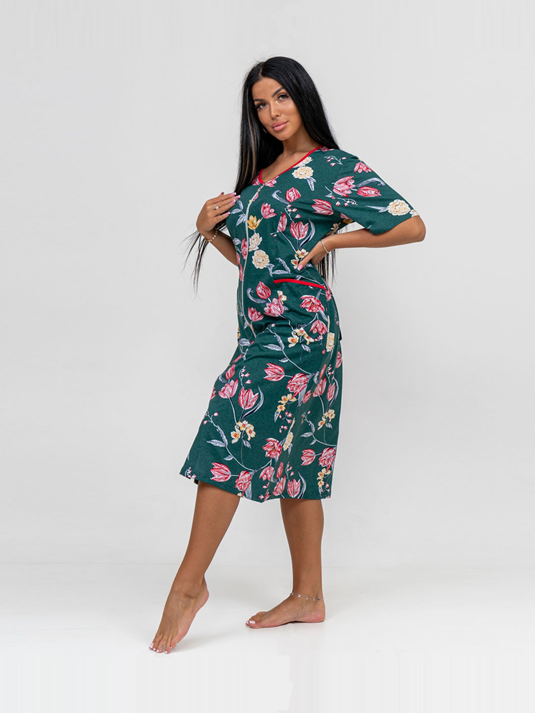 Халат женский из трикотажного полотна - кулирка, длиной ниже колена, прямого силуэта. Полочка с рельефами и карманами в них. Рукав втачной базового покроя длиной до линии локтевого сгиба.
