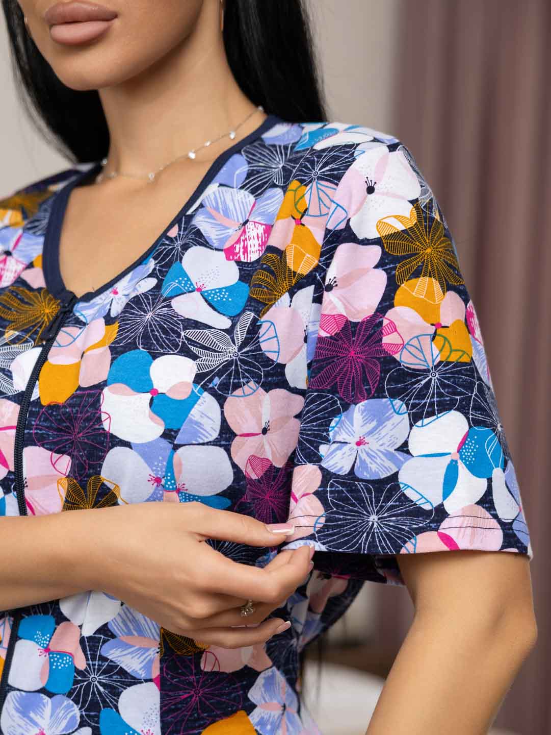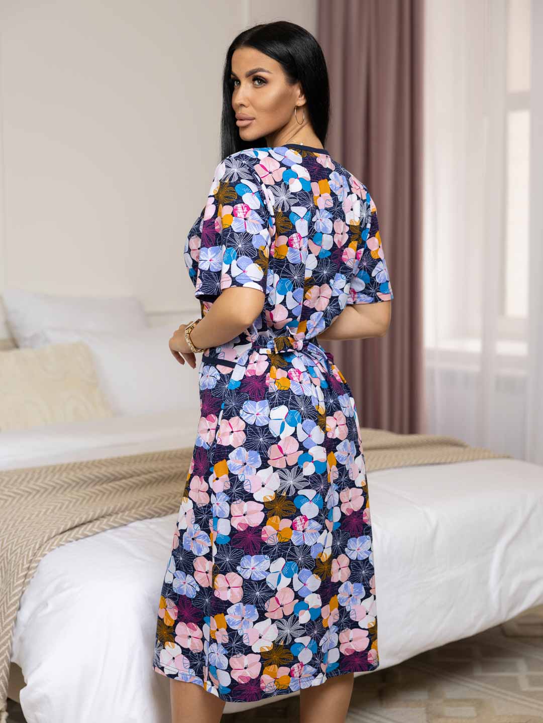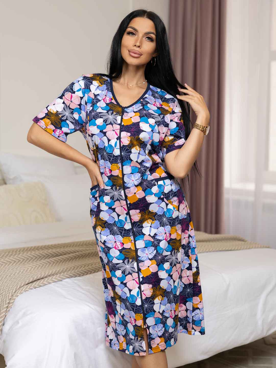 Халат женский из трикотажного полотна - кулирка, длиной ниже колена, прямого силуэта. Полочка с рельефами и карманами в них. Рукав втачной базового покроя длиной до линии локтевого сгиба.