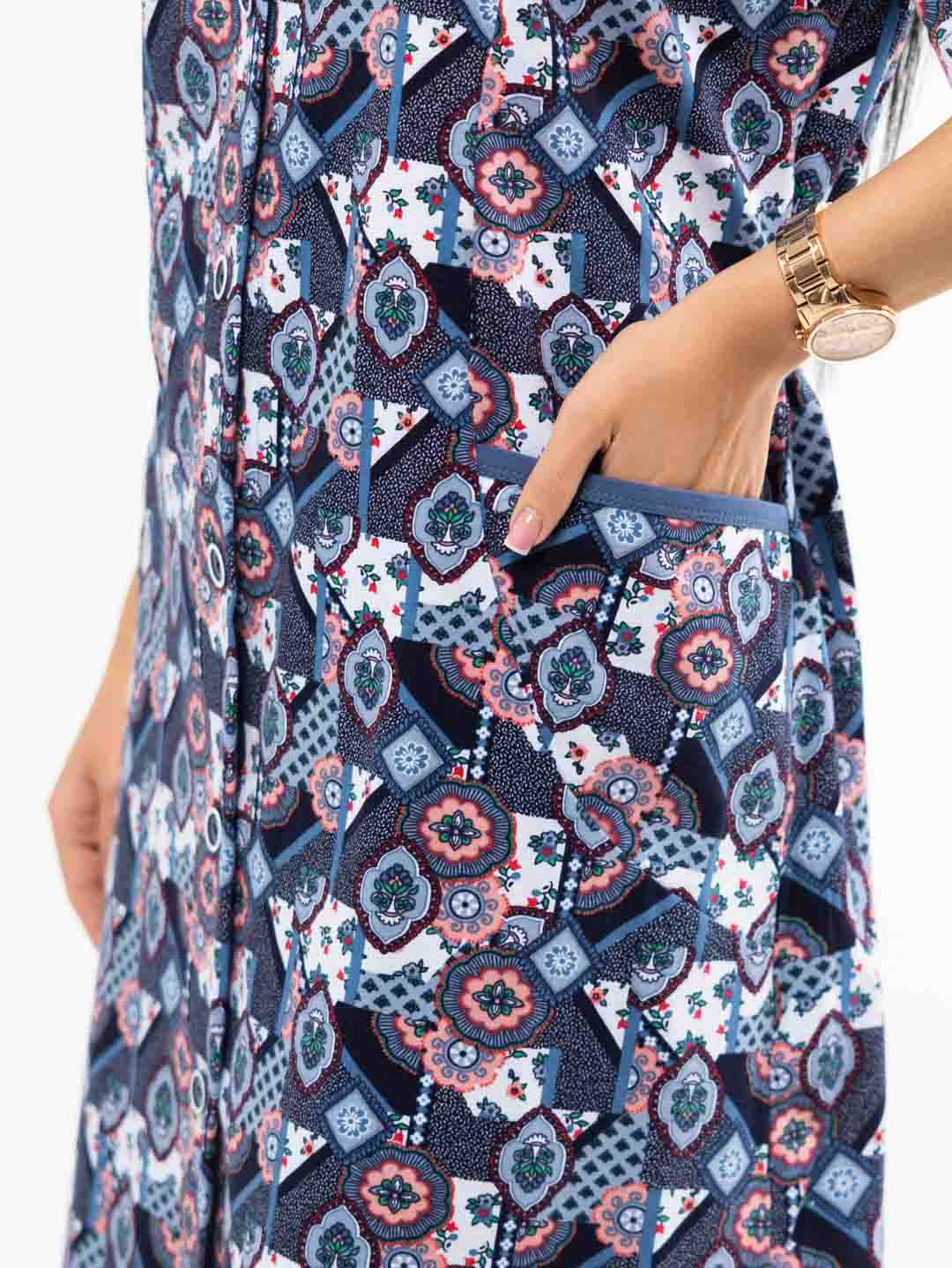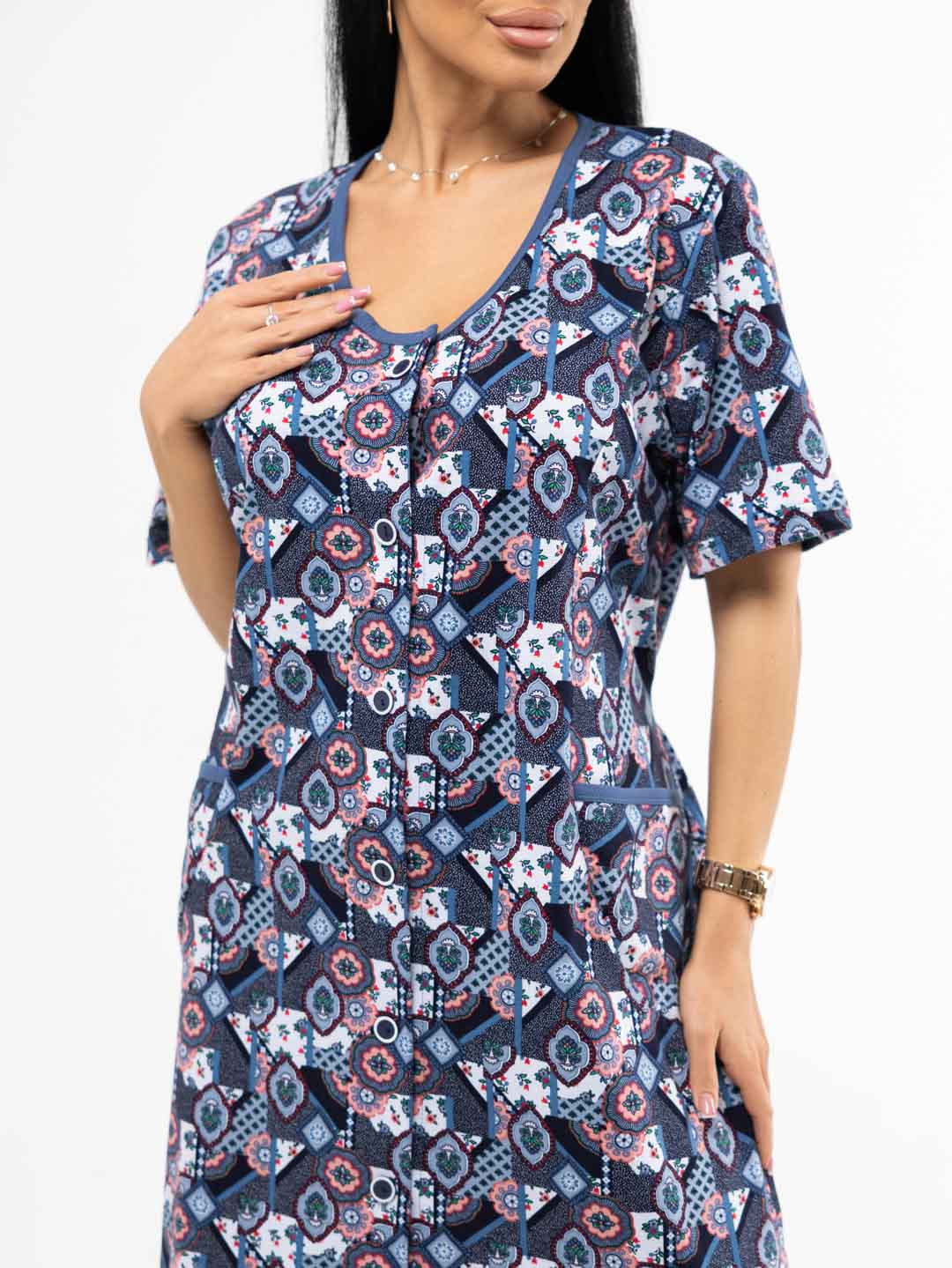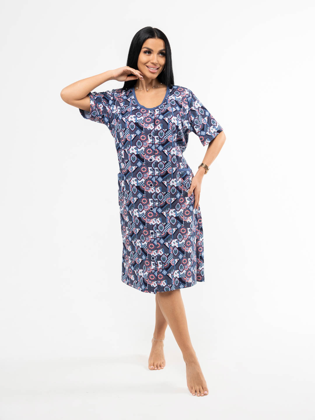 Халат женский из трикотажа, длиной до уровня колена. Рукав - втачной, длиной 1/2. Вырез горловины О-образный. Застежка на пуговицы.