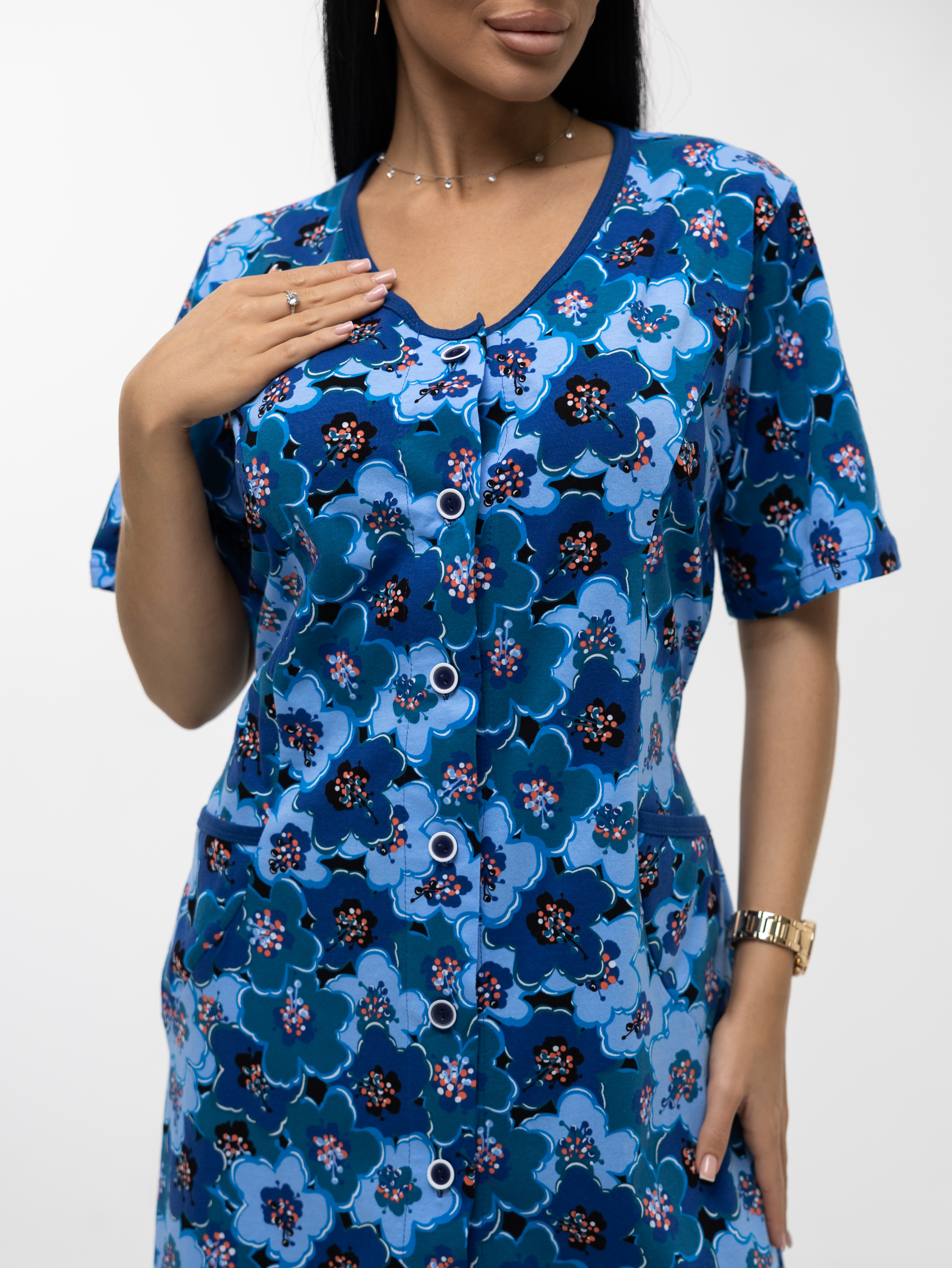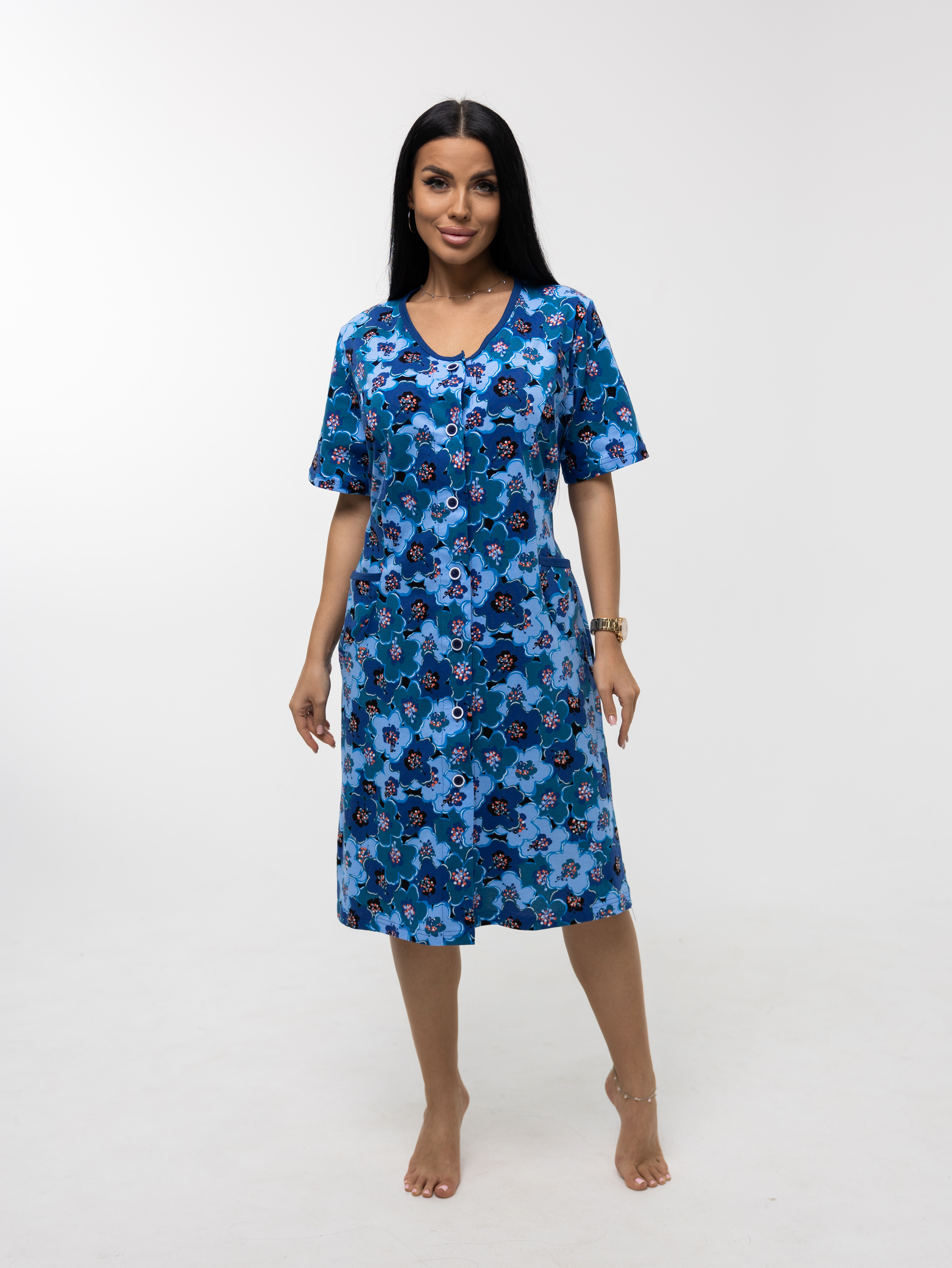 Халат женский из трикотажа, длиной до уровня колена. Рукав - втачной, длиной 1/2. Вырез горловины О-образный. Застежка на пуговицы.