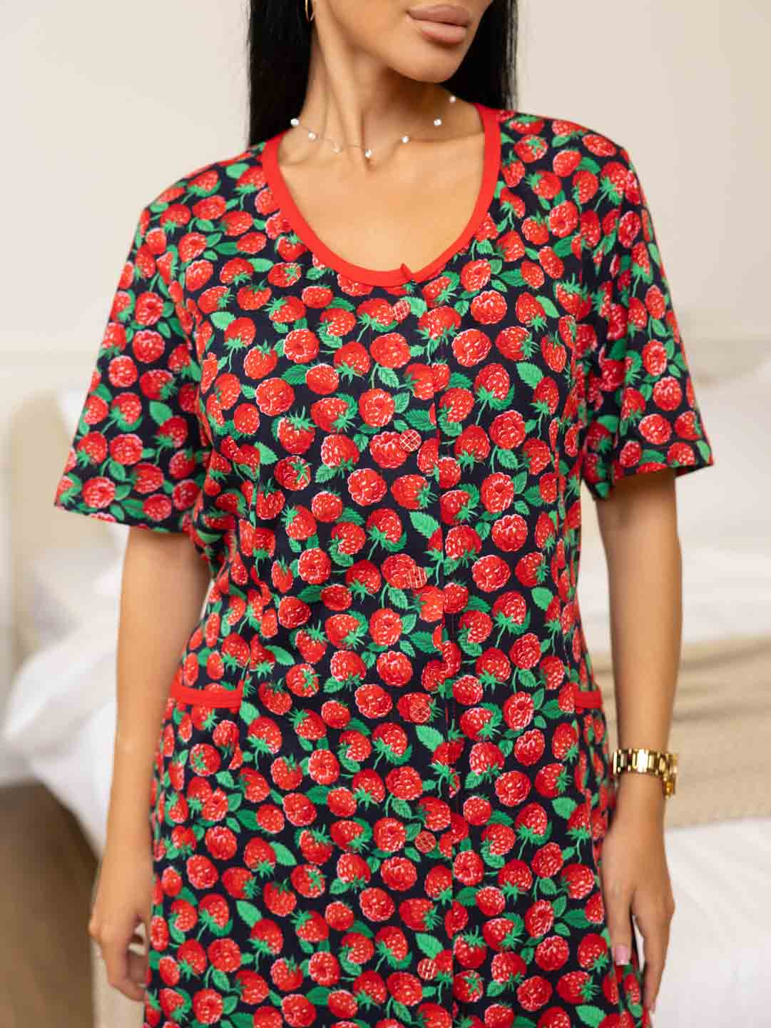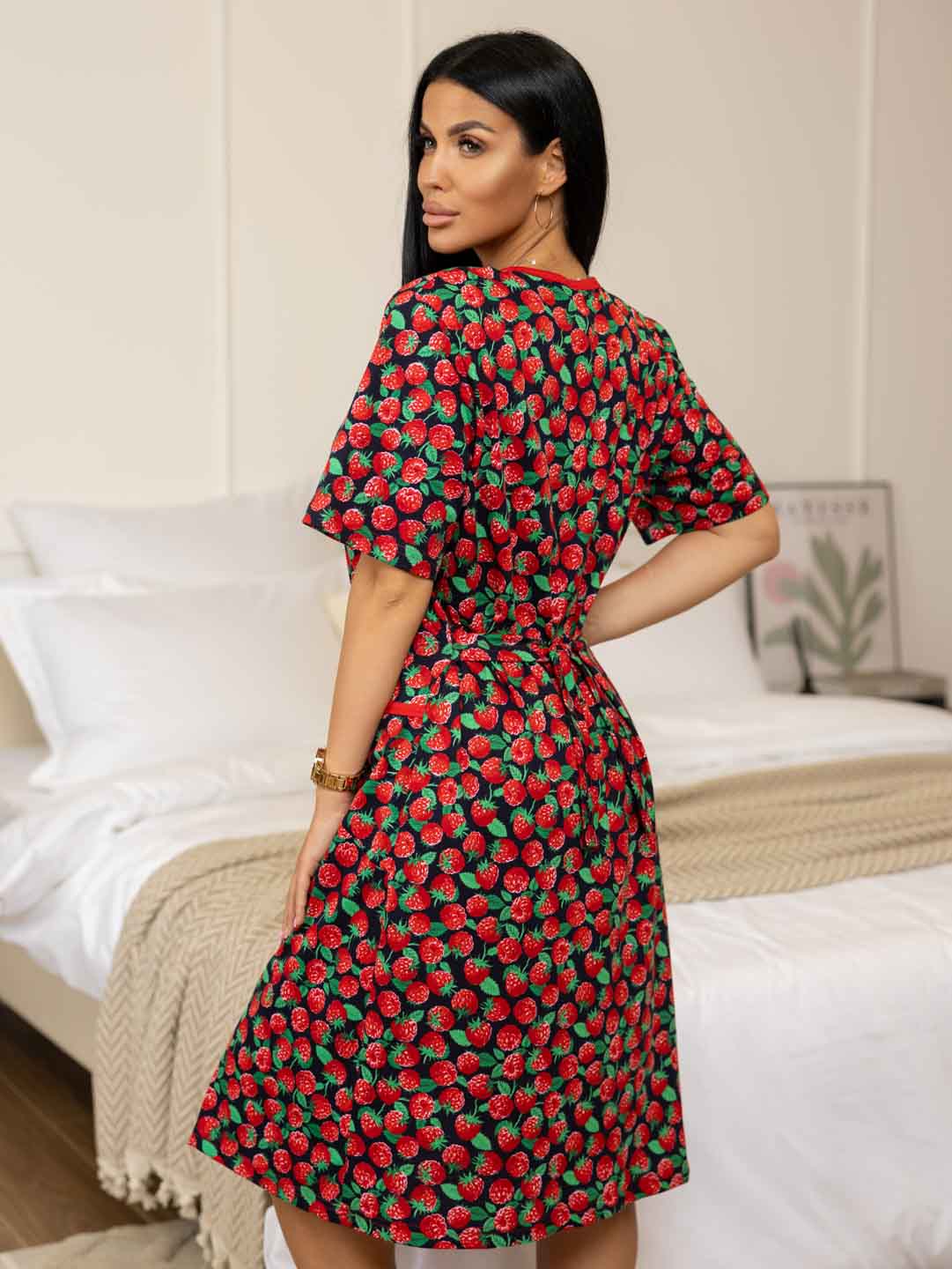 Халат женский из трикотажа, длиной до уровня колена. Рукав - втачной, длиной 1/2. Вырез горловины О-образный. Застежка на пуговицы.