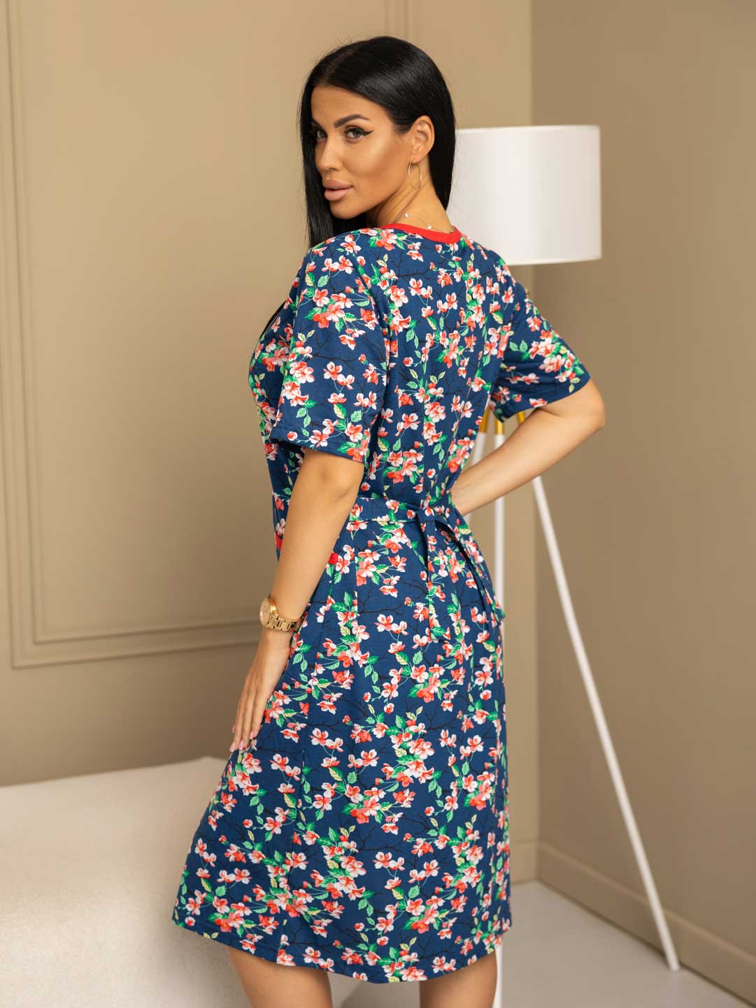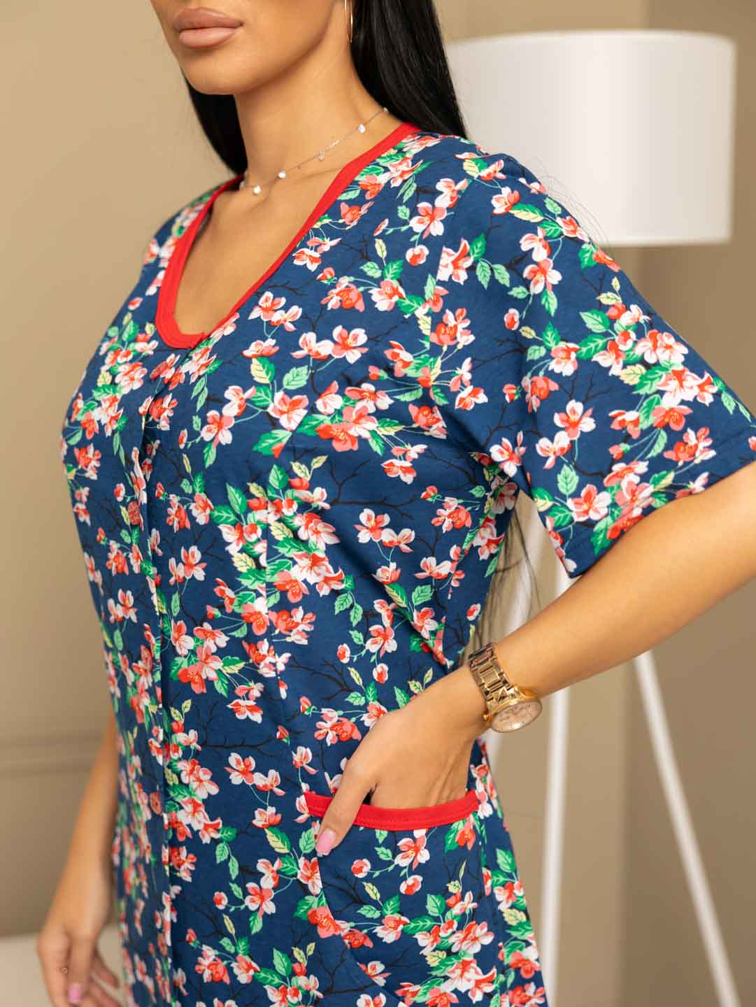 Халат женский из трикотажа, длиной до уровня колена. Рукав - втачной, длиной 1/2. Вырез горловины О-образный. Застежка на пуговицы.