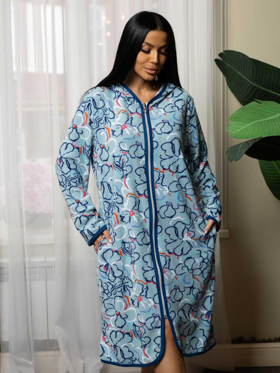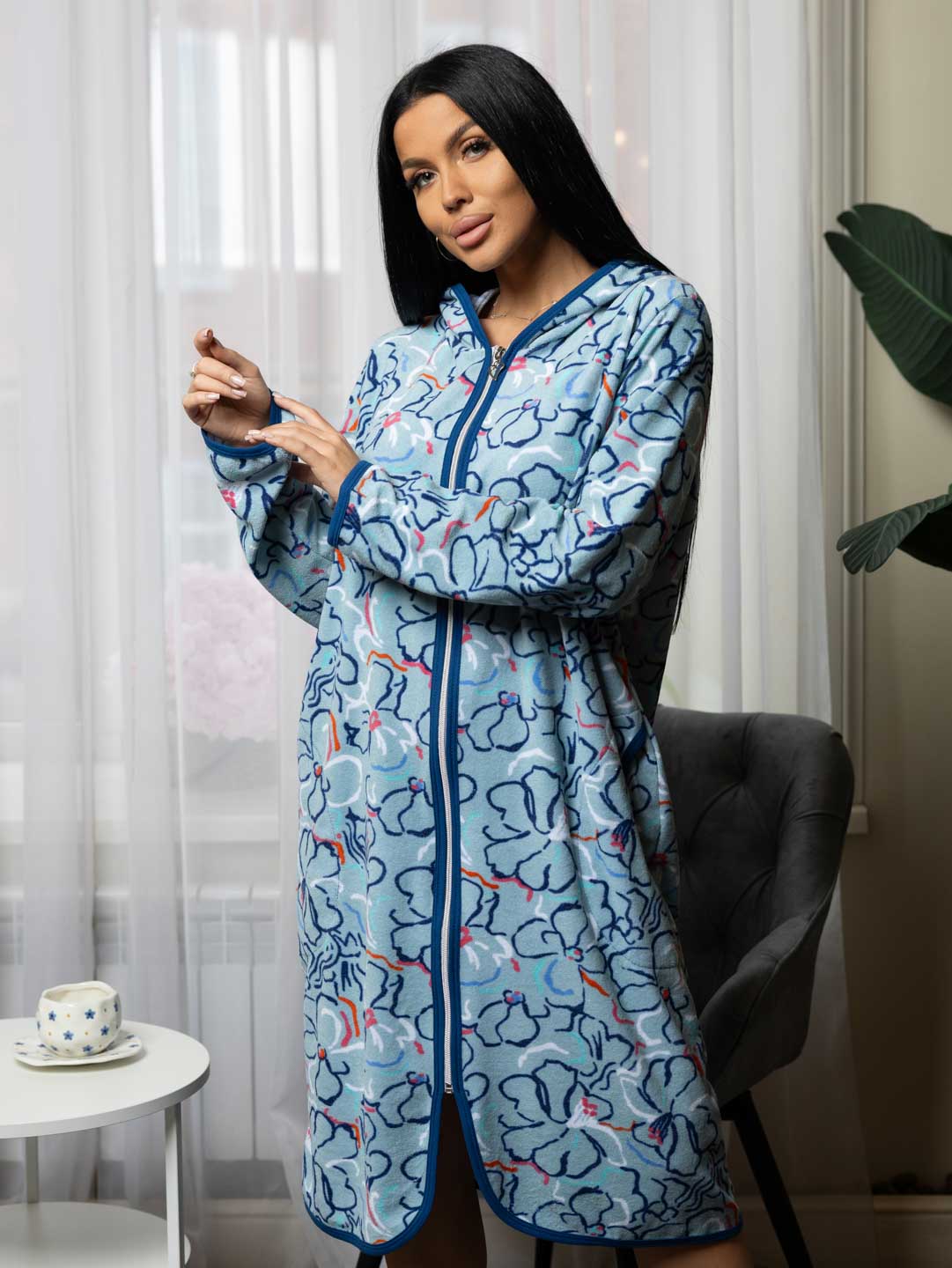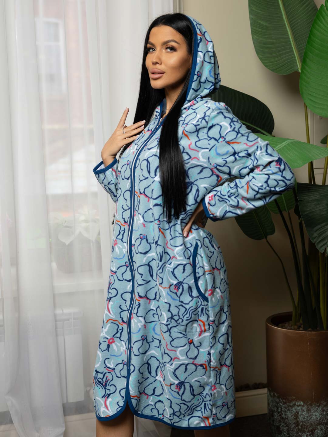 Теплый халат из турецкой махры на молнии с капюшоном, длиной до колена. Гармонично подобранные цвета, идеальная посадка по фигуре, оторочка контрастным кантом — все это создает шикарный образ и делает повседневный халатик стильным и нарядным.
