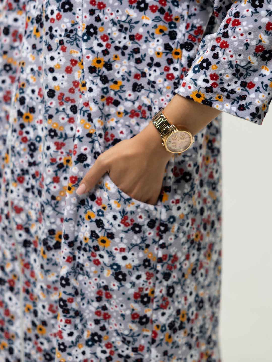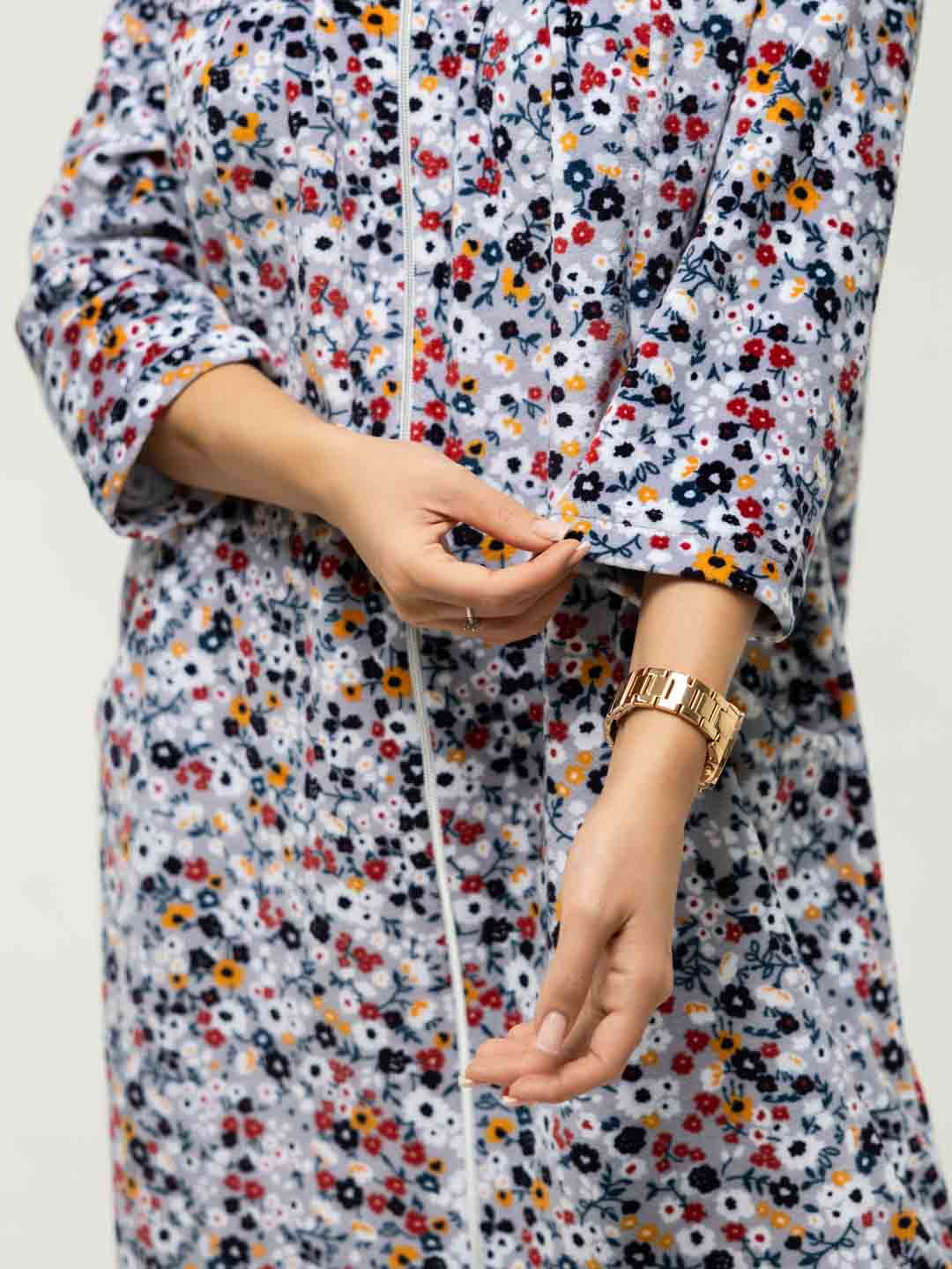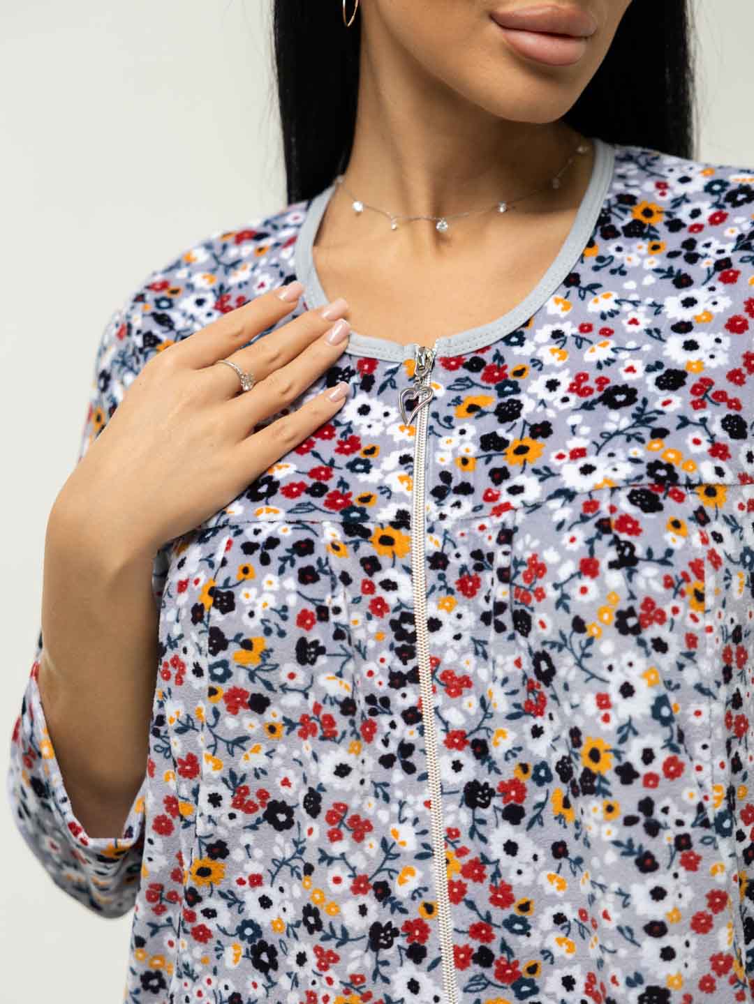 Домашний халат из турецкого велюра, на молнии с рукавом 3/4, отрезной кокеткой и складками по груди. Удобная посадка и большие карманы добавляют комфорта. Отлично подойдет для подарка близкому человеку.