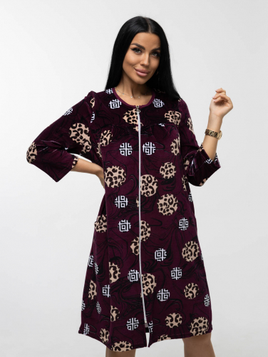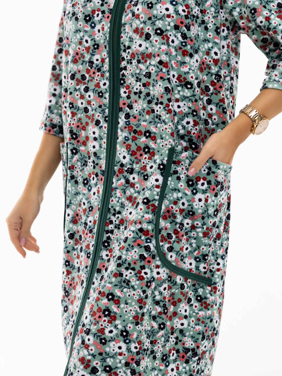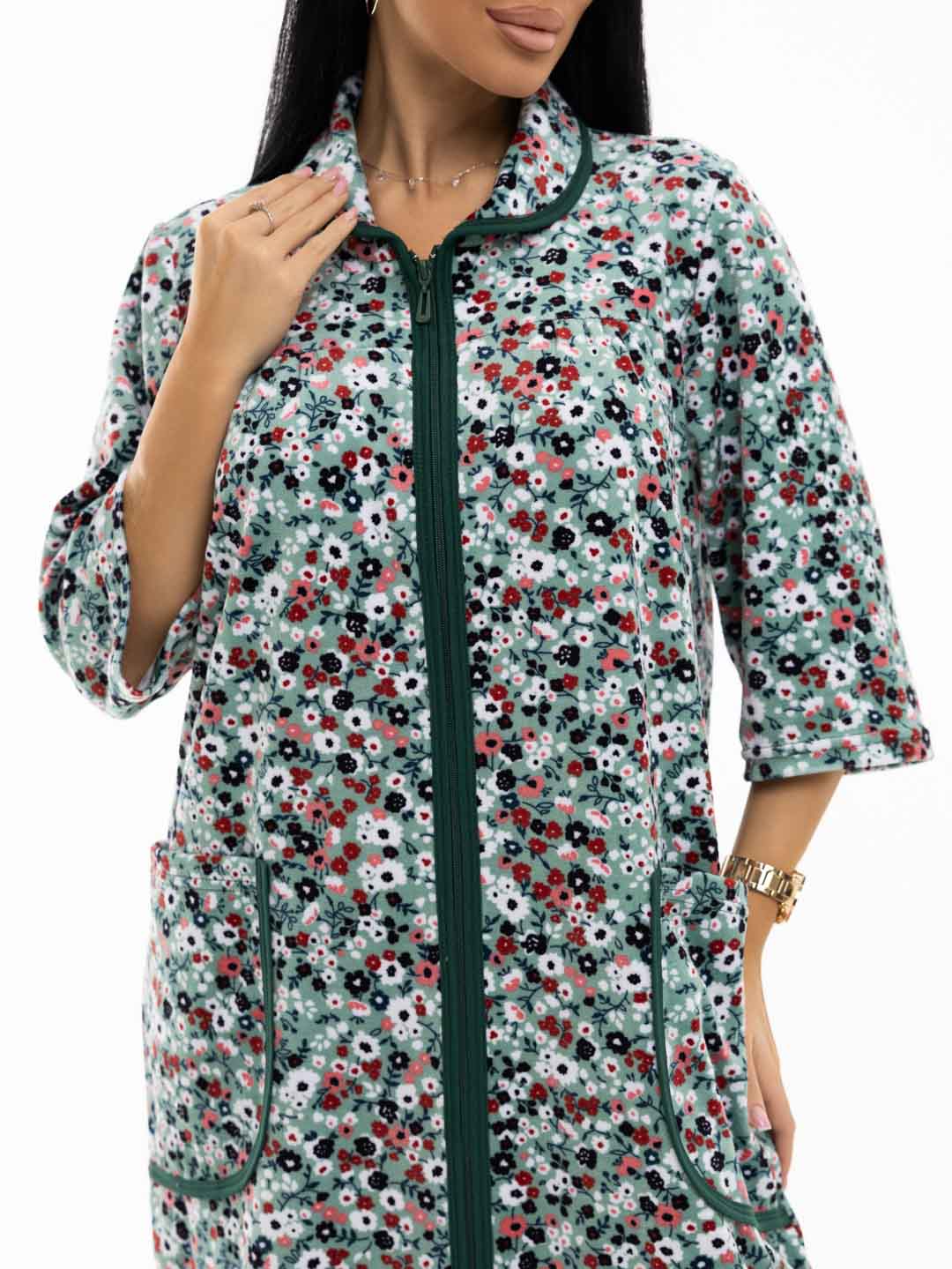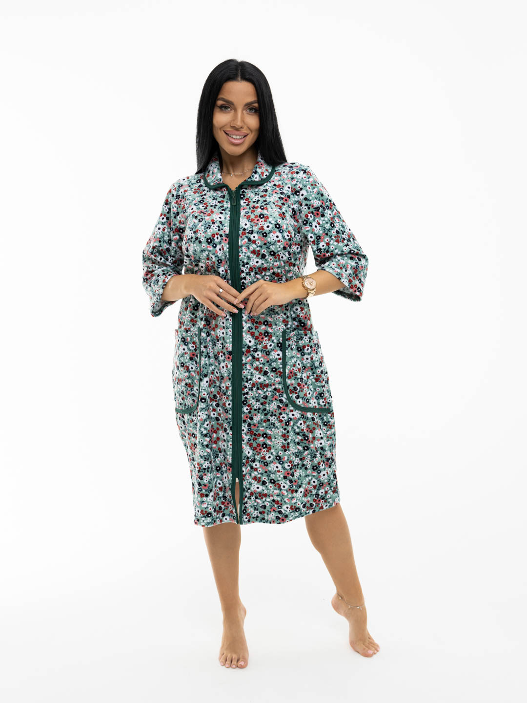Халат женский трикотажный, длиной ниже колена. Данная модель имеет отложный воротник и застежку на молнию. Рукав - втачной, длиной 3/4. Большие удобные накладные карманы.