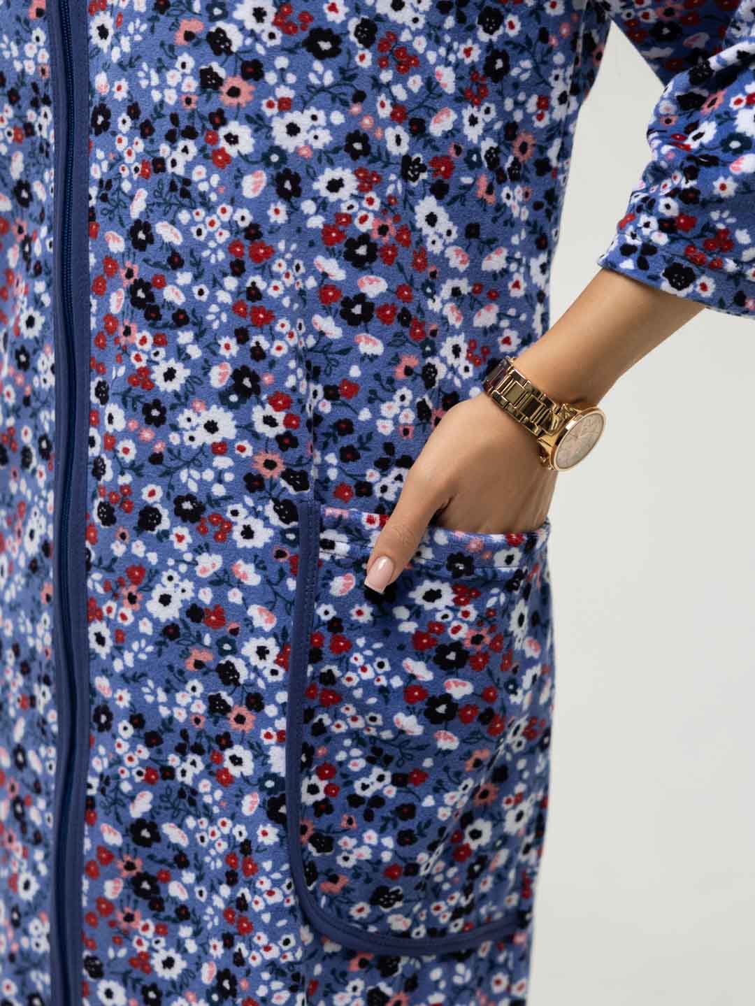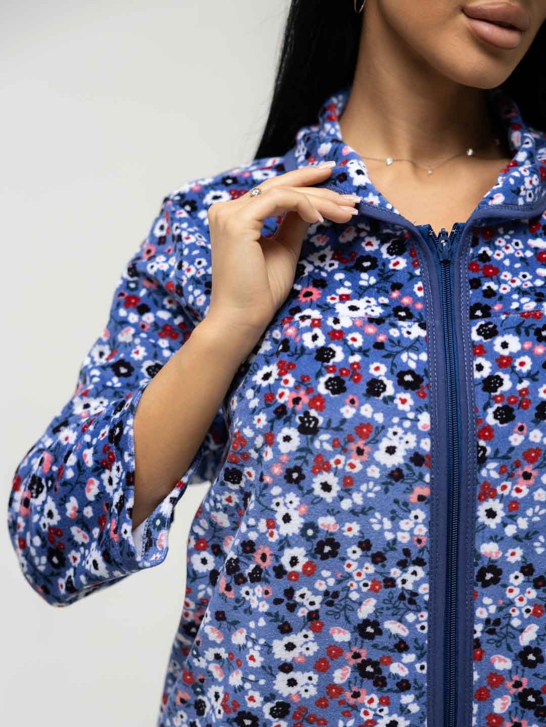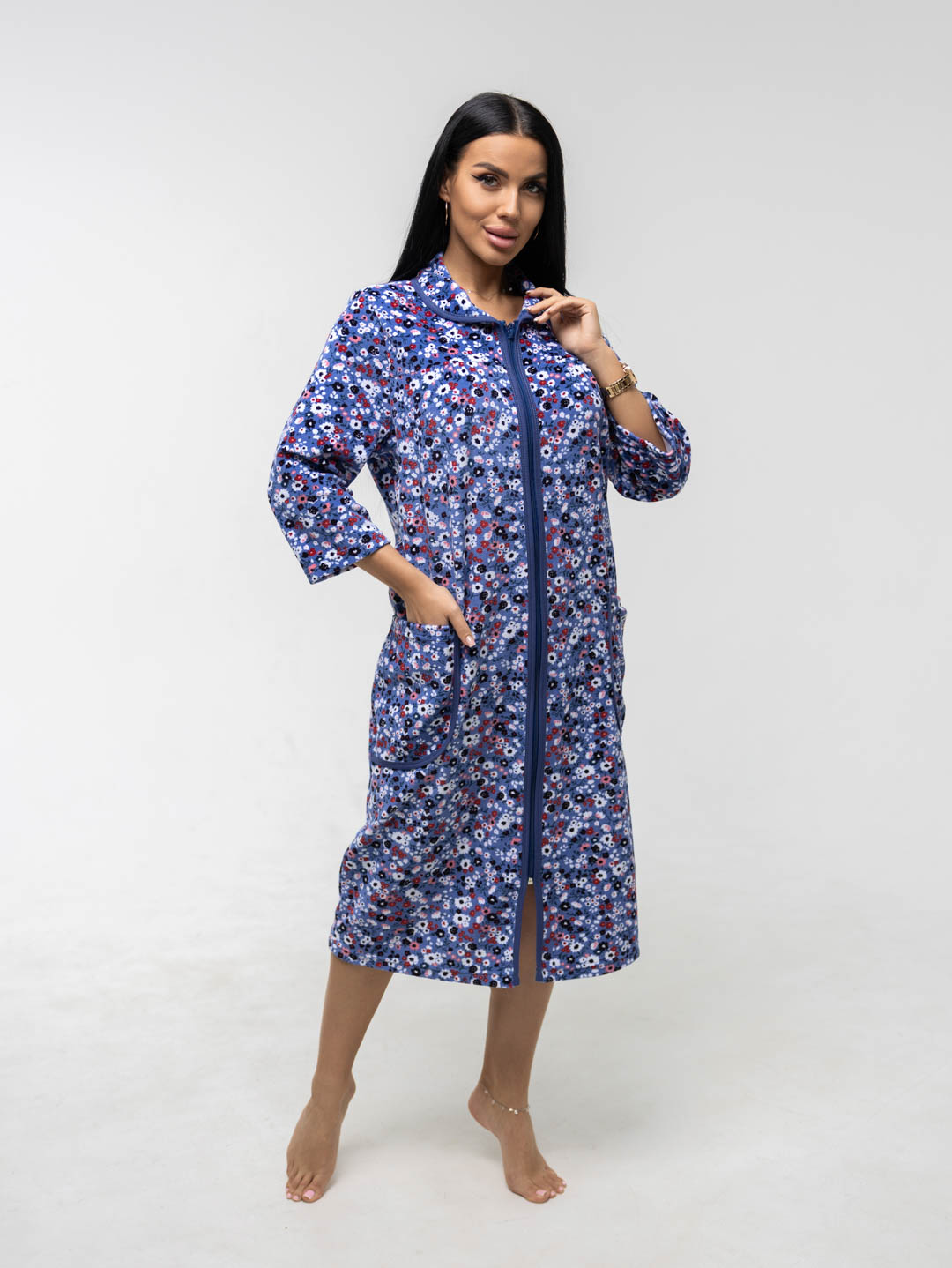 Халат женский трикотажный, длиной ниже колена. Данная модель имеет отложный воротник и застежку на молнию. Рукав - втачной, длиной 3/4. Большие удобные накладные карманы.