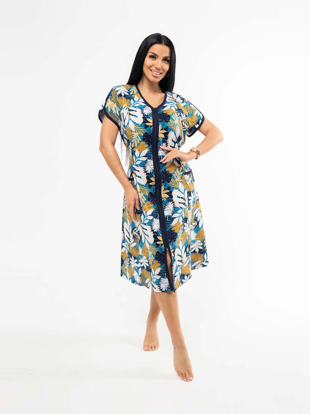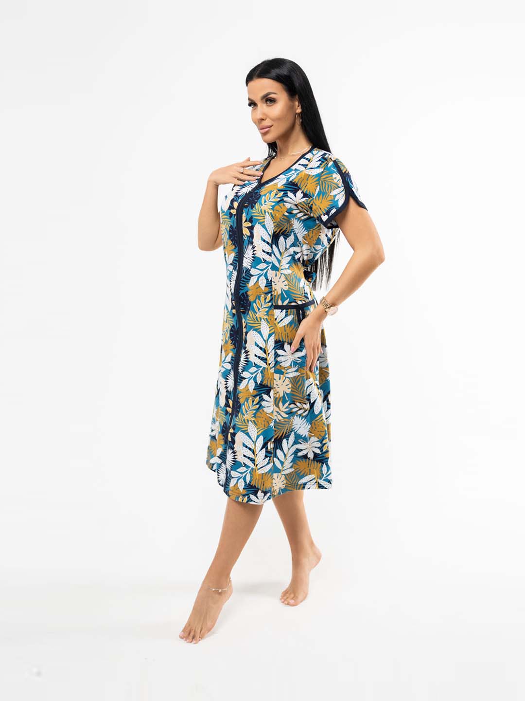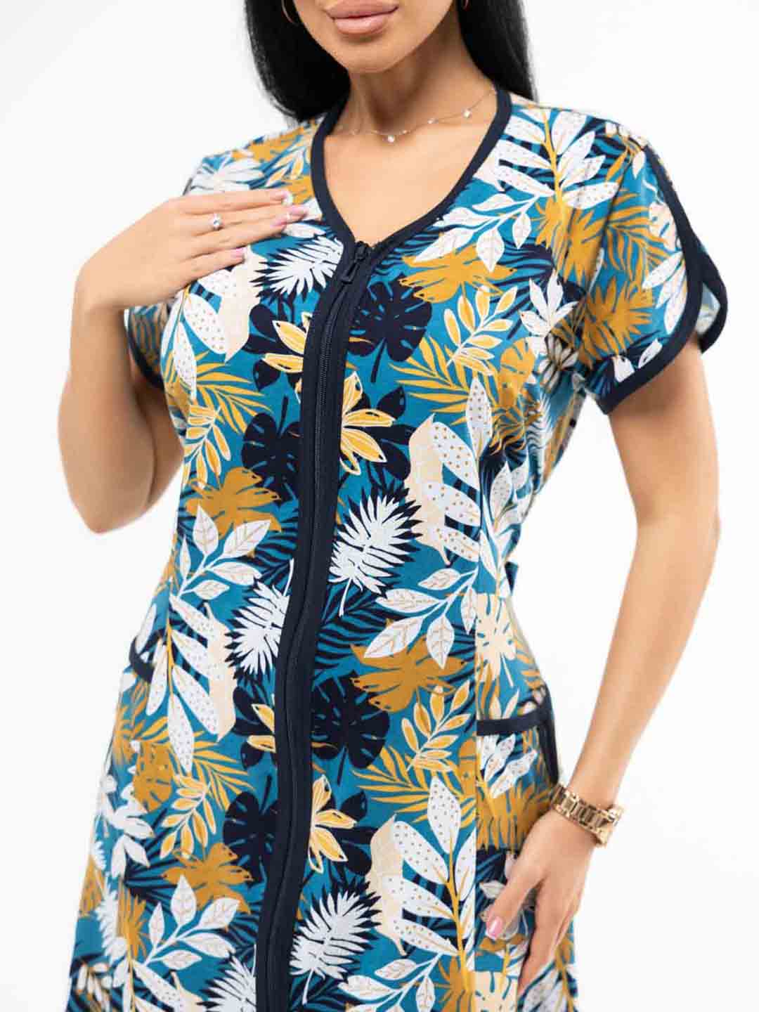 Женский домашний халат из хлопка, полуприлегающего силуэта с застежкой на молнию. Спереди на халате рельефные швы и два накладных кармана. Сзади пояс, обеспечивающий прилегание по спинке и создающий силуэт песочные часы.