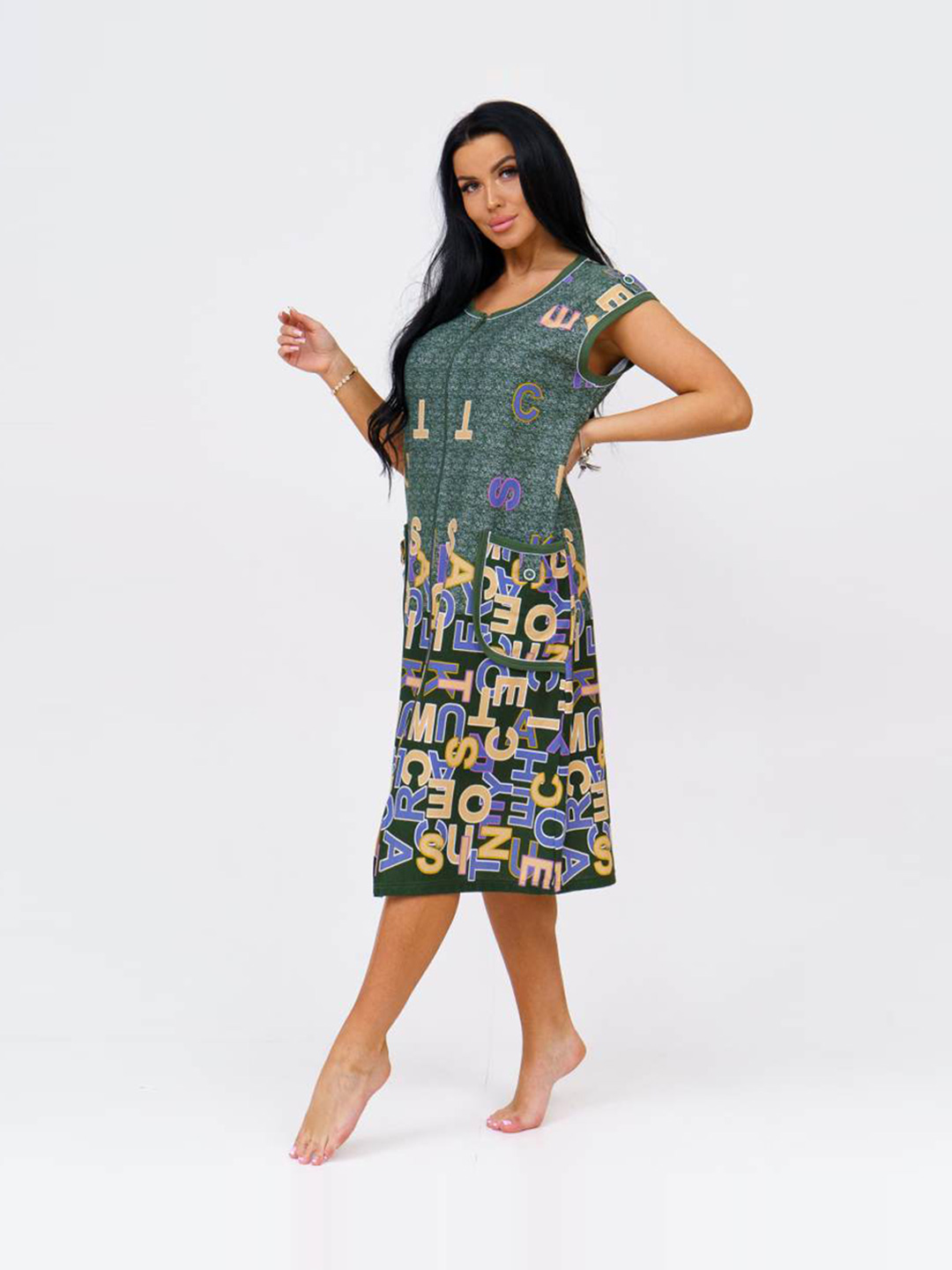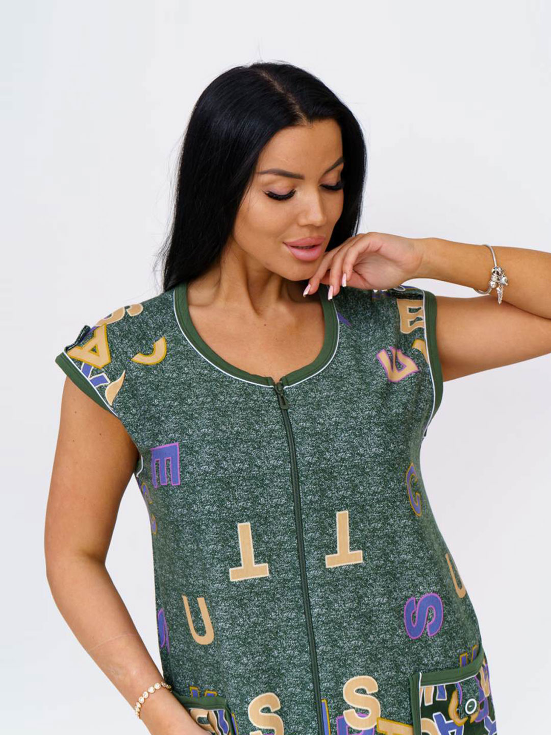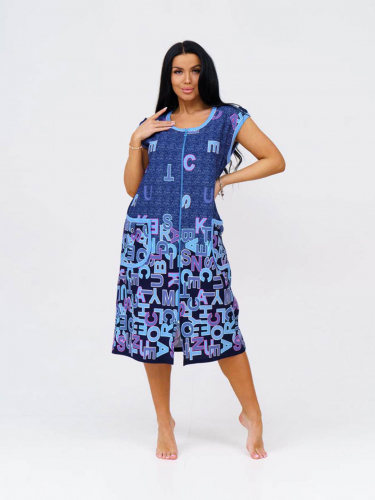 Халат женский из трикотажного полотна - кулирка, прямого силуэта с застёжкой на молиню. Полочка с накладными карманами, со вставками по плечевым срезам. Проймы, горловина и карманы обработаны окантовкой.