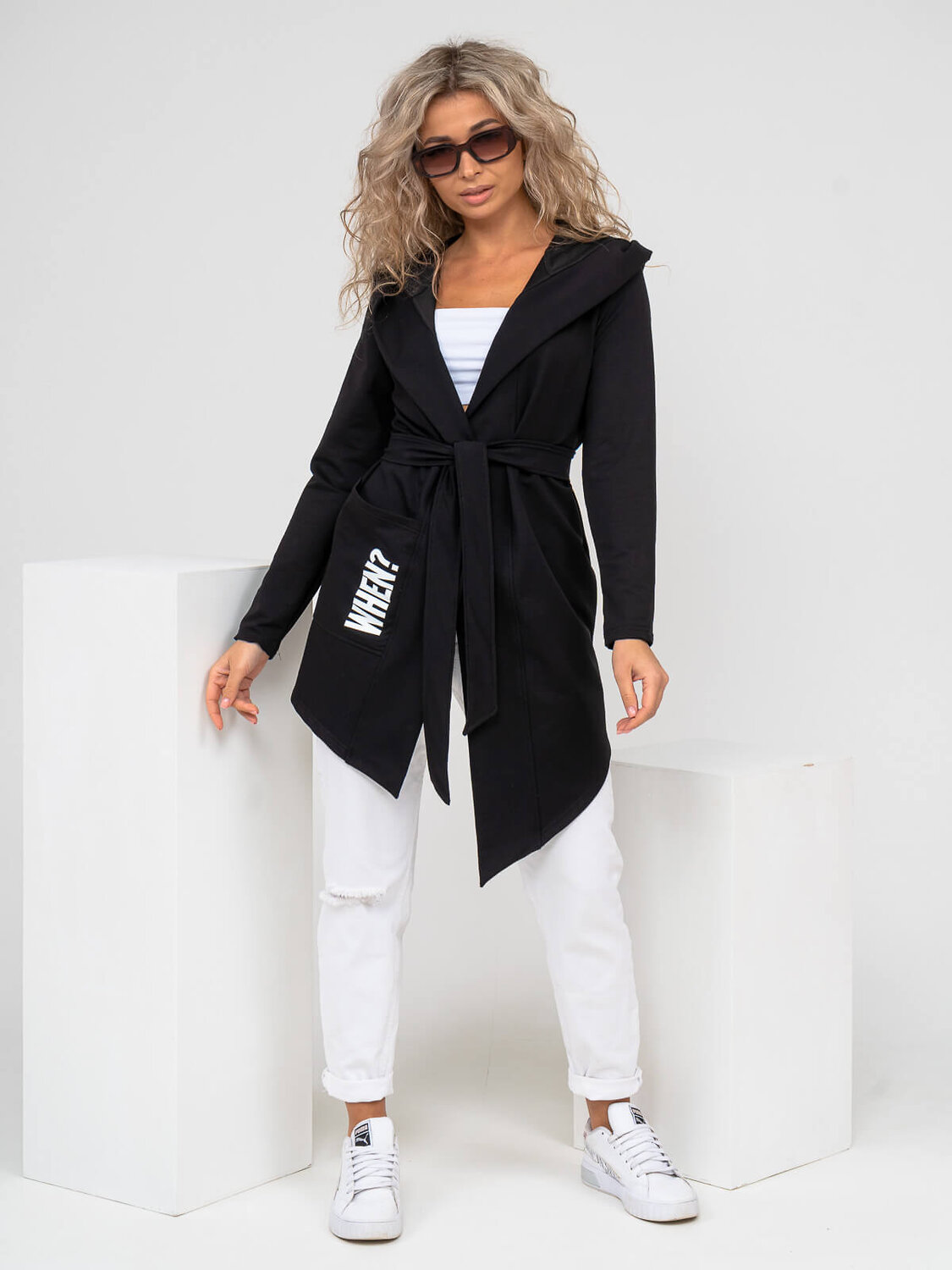 Кардиган женский с асимметричной линией низа, объемным капюшоном и карманом на правой стороне. Изделие укомплектовано поясом.