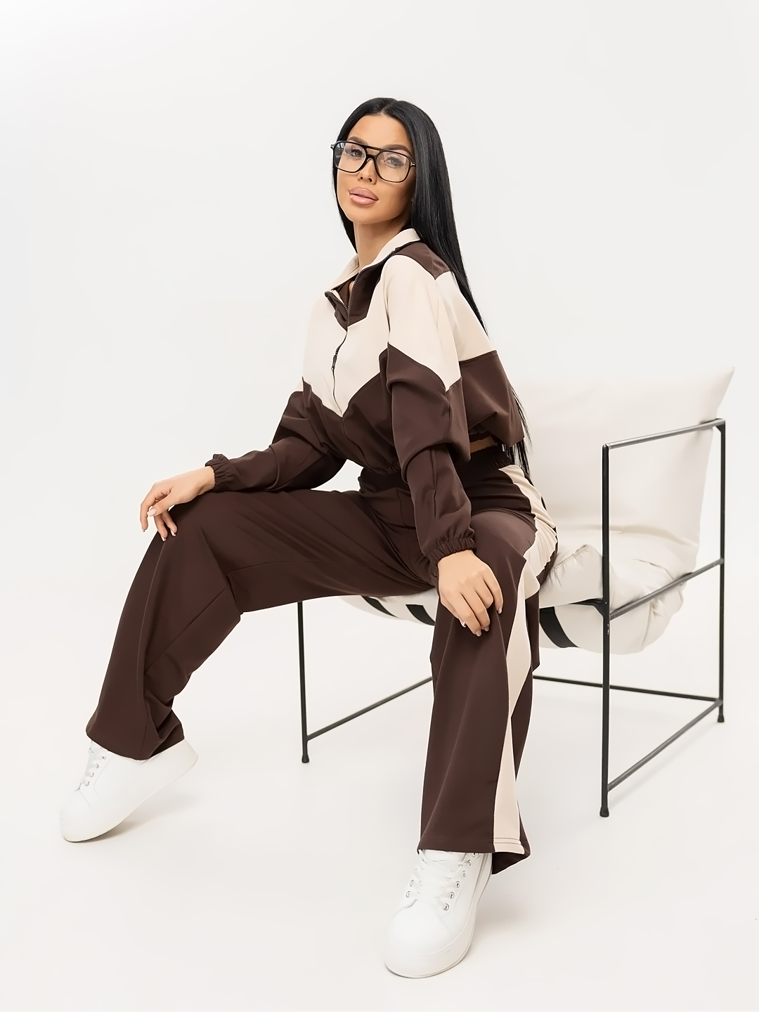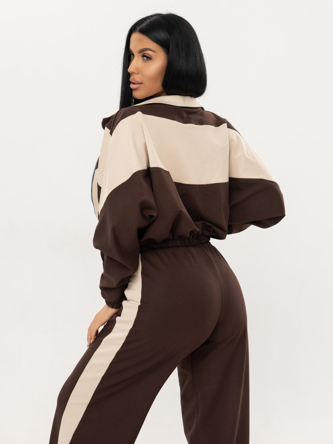 Женский спортивный костюм из футера двунитки. Укороченная олимпийка с резинкой 2см по низу и по рукаву, V-образные вставки и воротник с внутренней стороны выполнены из футера компаньона, внутри место соединения воротника и основы обработано окантовкой, использована качественная фурнитура. Брюки с широкими лампасами и поясом на резинке, выполненным на поясной машине.