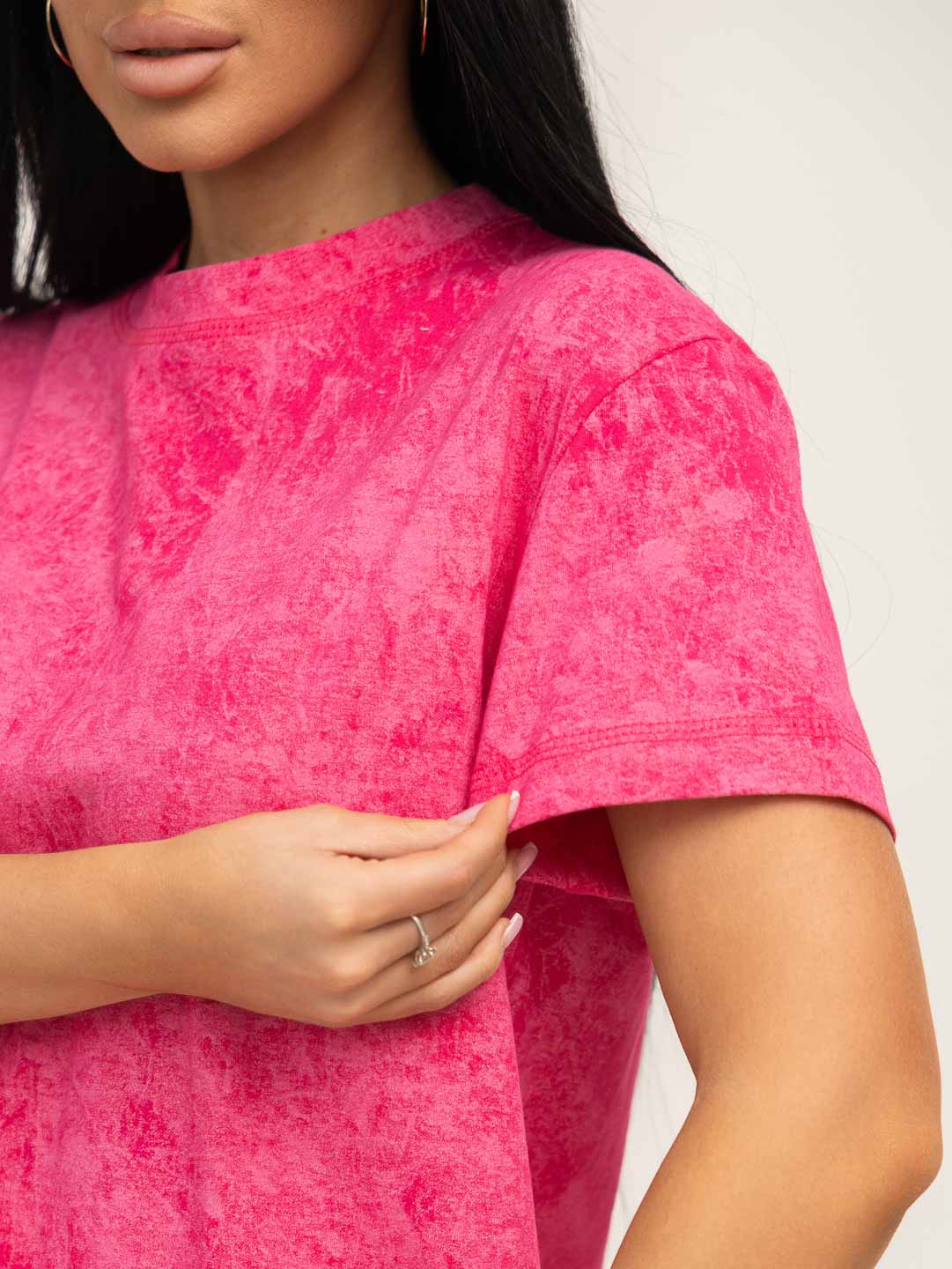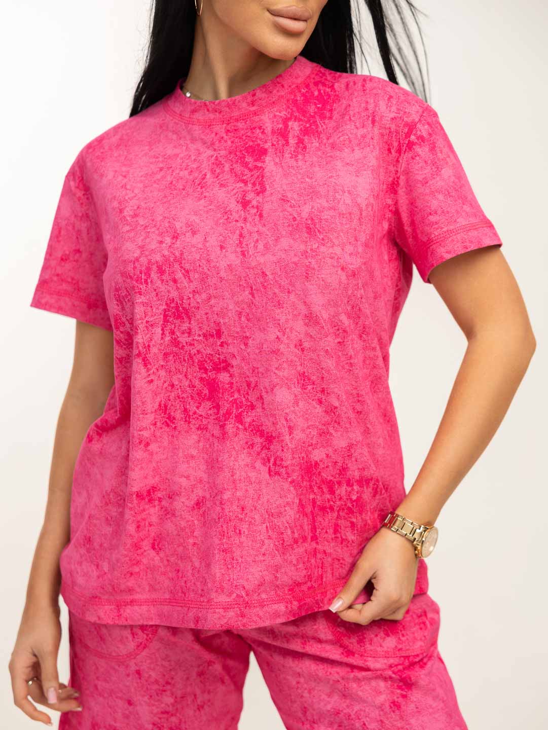 Костюм женский свободного силуэта, футболка и шорты. Футболка с коротким спущенным рукавом и округлой горловиной. Шорты с поясом на резинке, для удобной посадки и карманами с отрезным бочком. Яркий современный рисунок ткани в стиле - варенка. Легкий, удобный костюм из натурального хлопка, на каждый день.