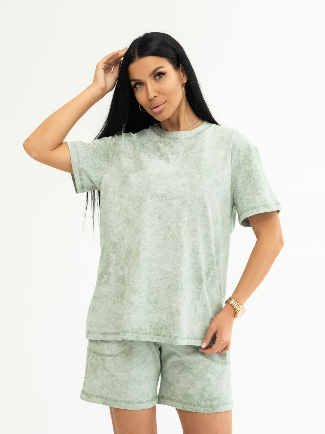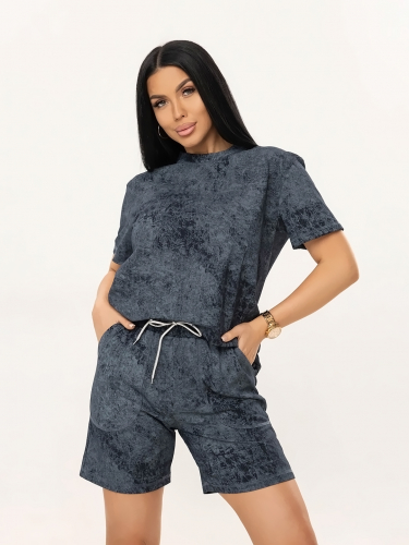 Костюм женский свободного силуэта, футболка и шорты. Футболка с коротким спущенным рукавом и округлой горловиной. Шорты с поясом на резинке, для удобной посадки и карманами с отрезным бочком. Яркий современный рисунок ткани в стиле - варенка. Легкий, удобный костюм из натурального хлопка, на каждый день.