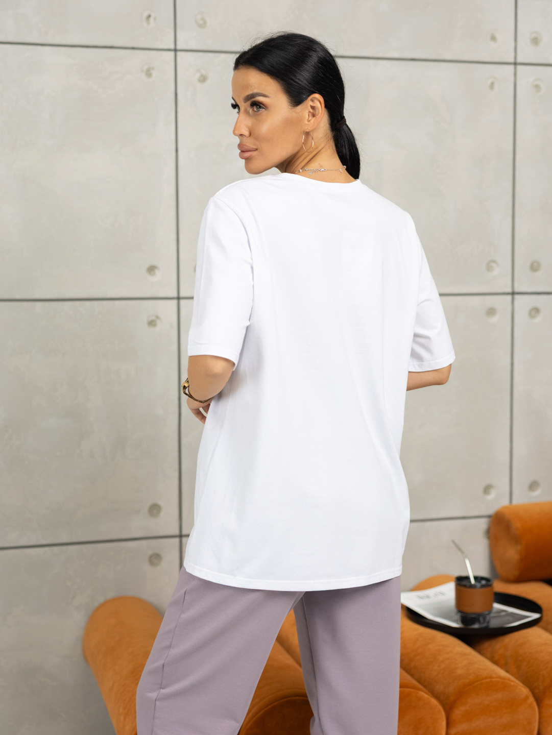 Костюм женский брюки и футболка. Футболка свободного силуэта с удлиненным втачным рукавом и округлой горловиной, на передней части печатный рисунок. Брюки с поясом на резинке, для надежной фиксации и карманами с отрезным бочком.