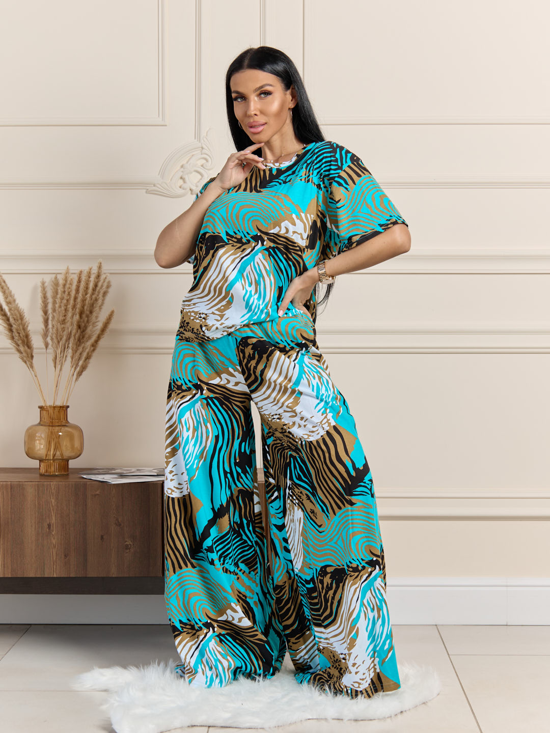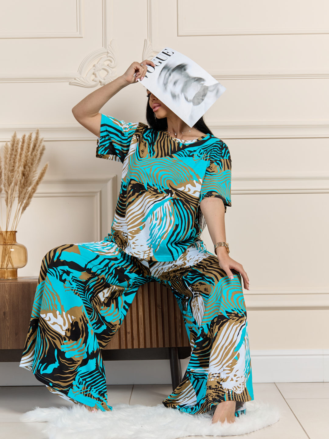 Элегентный домашний костюм из хлопка. Футболка с О-образной горловиной, спущенной линией плеча и коротким рукавом. Брюки-солнце с карманами и поясом на резинке.