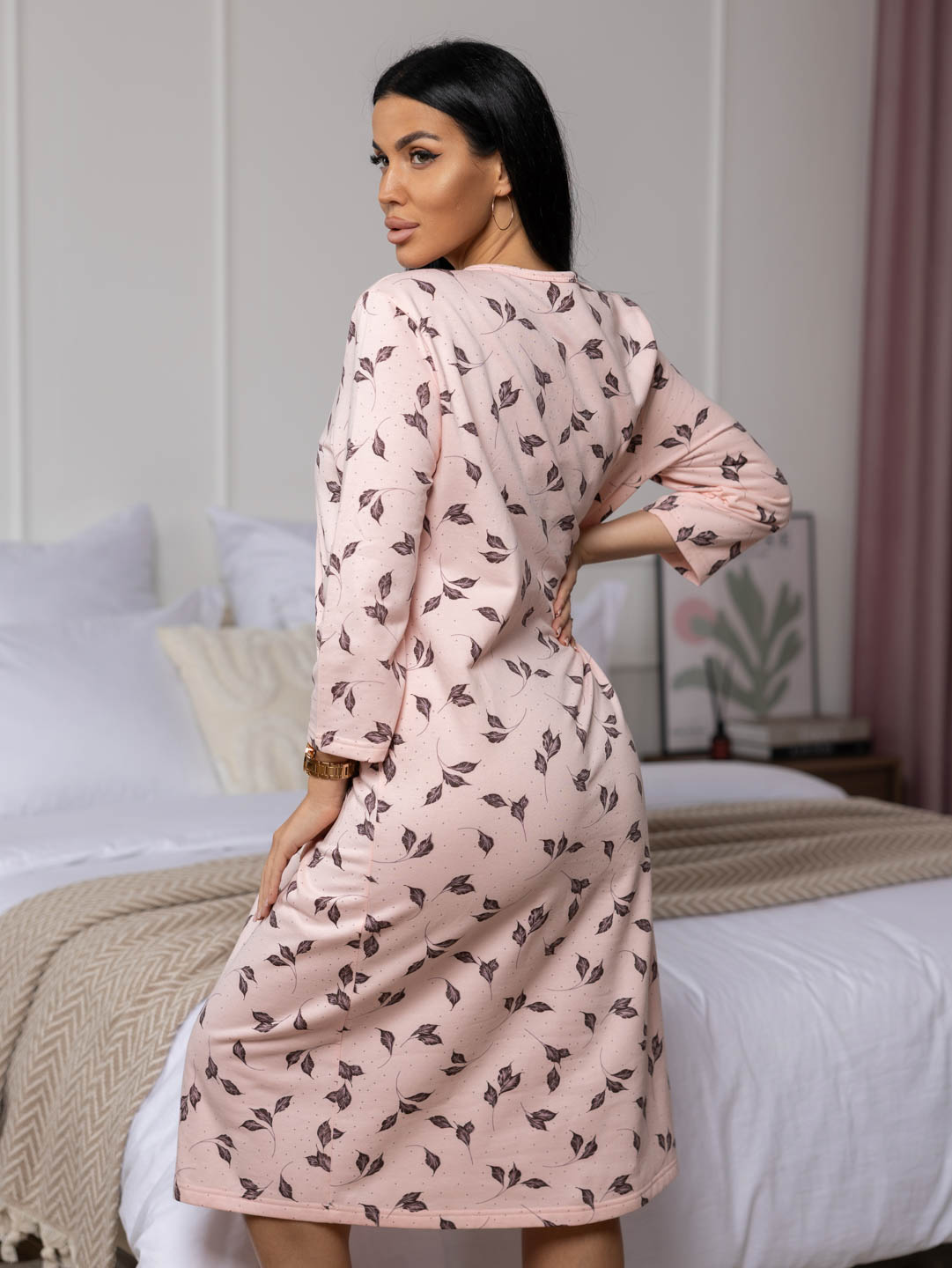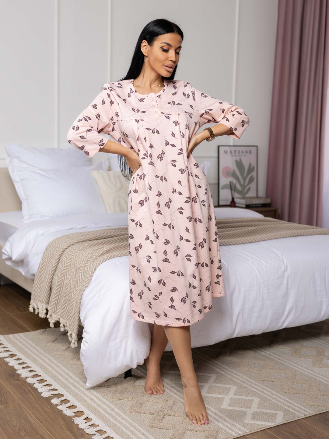 Женская ночная сорочка длиной ниже колена с рукавом 3/4 и округлой горловиной на пуговицах. Материал имеет притную к телу изнанку, благодаря которой вы не замерзните даже в самые морозные дни.