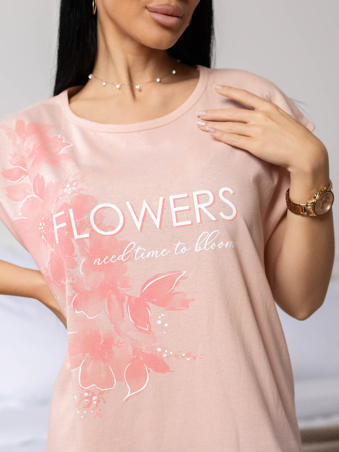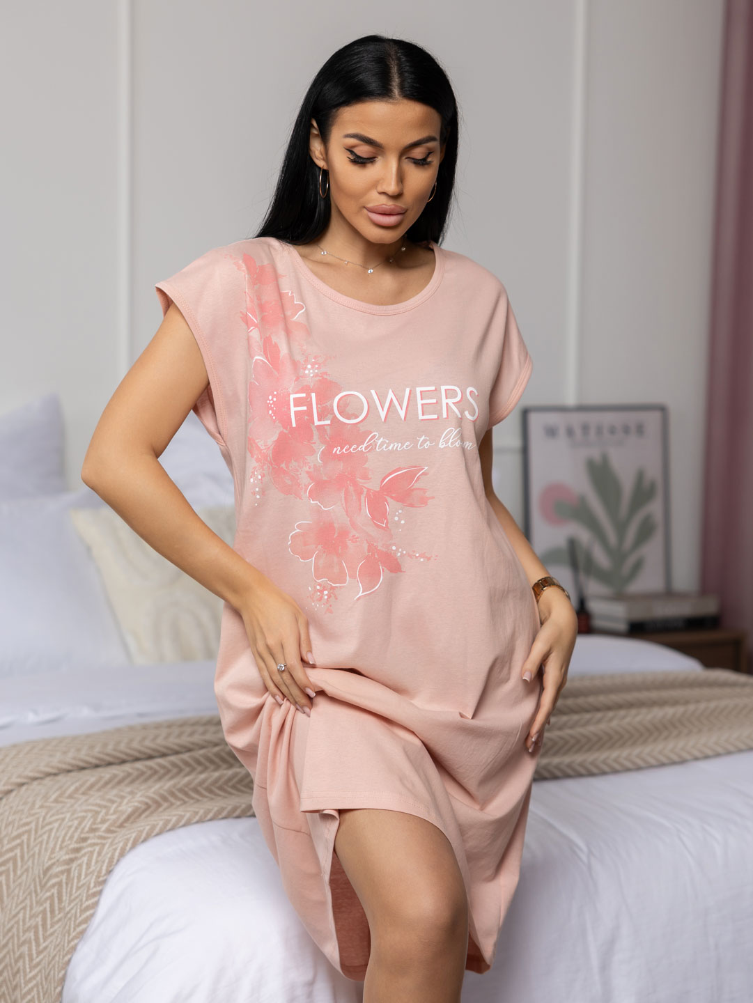 Ночная сорочка из хлопка с нежной печатью спереди, длиной до колена. Спущенная линия плеча и прямой силуэт не сковывают движения и дарят комфорт.