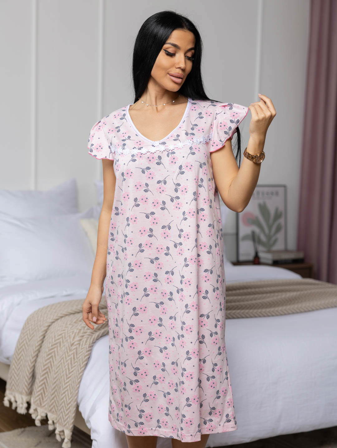 Женская ночная сорочка из хлопка, длиной ниже колена, с рукавом воланом и V-образной горловиной, украшена кружевом. Материал приятный к телу, обеспечивает комфорт во время сна.
