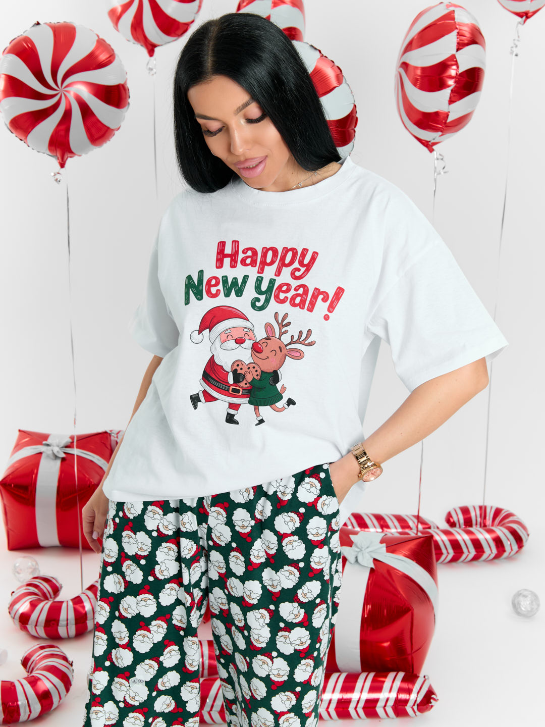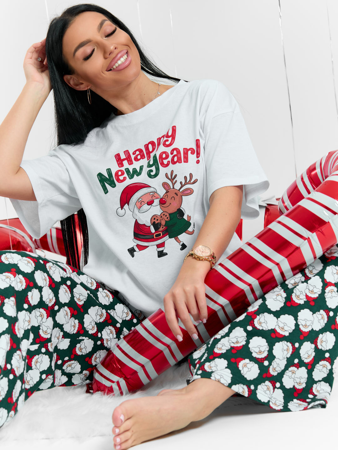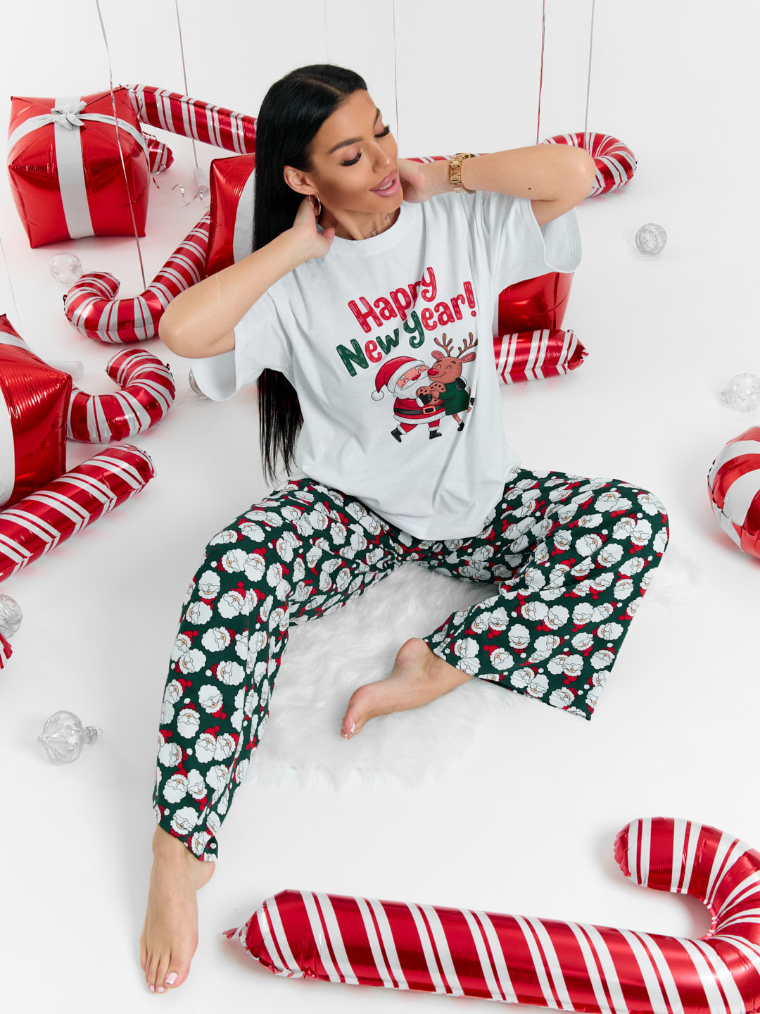 Этот очаровательный комплект станет незабываемым подарком для себя или близких на Новый год. Сочетание праздничного дизайна, комфорта и качества делает эту пижаму настоящим сокровищем для тех, кто ценит уют и стиль в домашней одежде. Создайте волшебную атмосферу праздника с нашей пижамой.