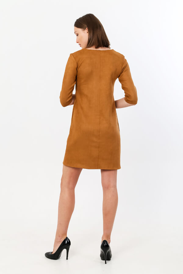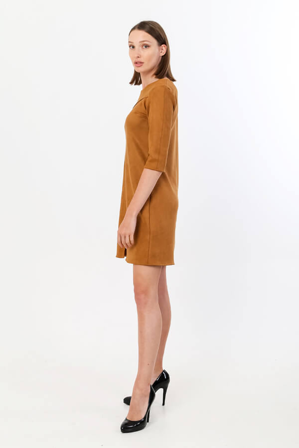 Платье женское из эко-замши с кокеткой на переде. Длина рукава до локтя. Длина платья выше уровня колена. Полочка и спинка со средним швом. Эта модель модного женского платья найдёт свое место в гардеробе активной современной девушки.
