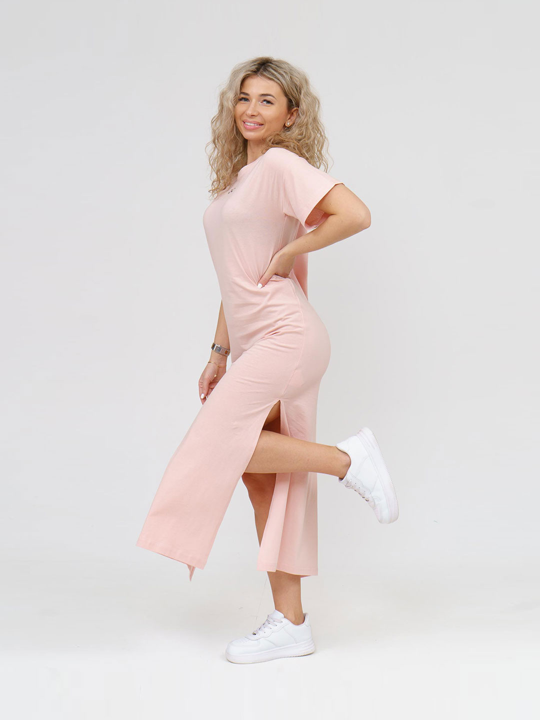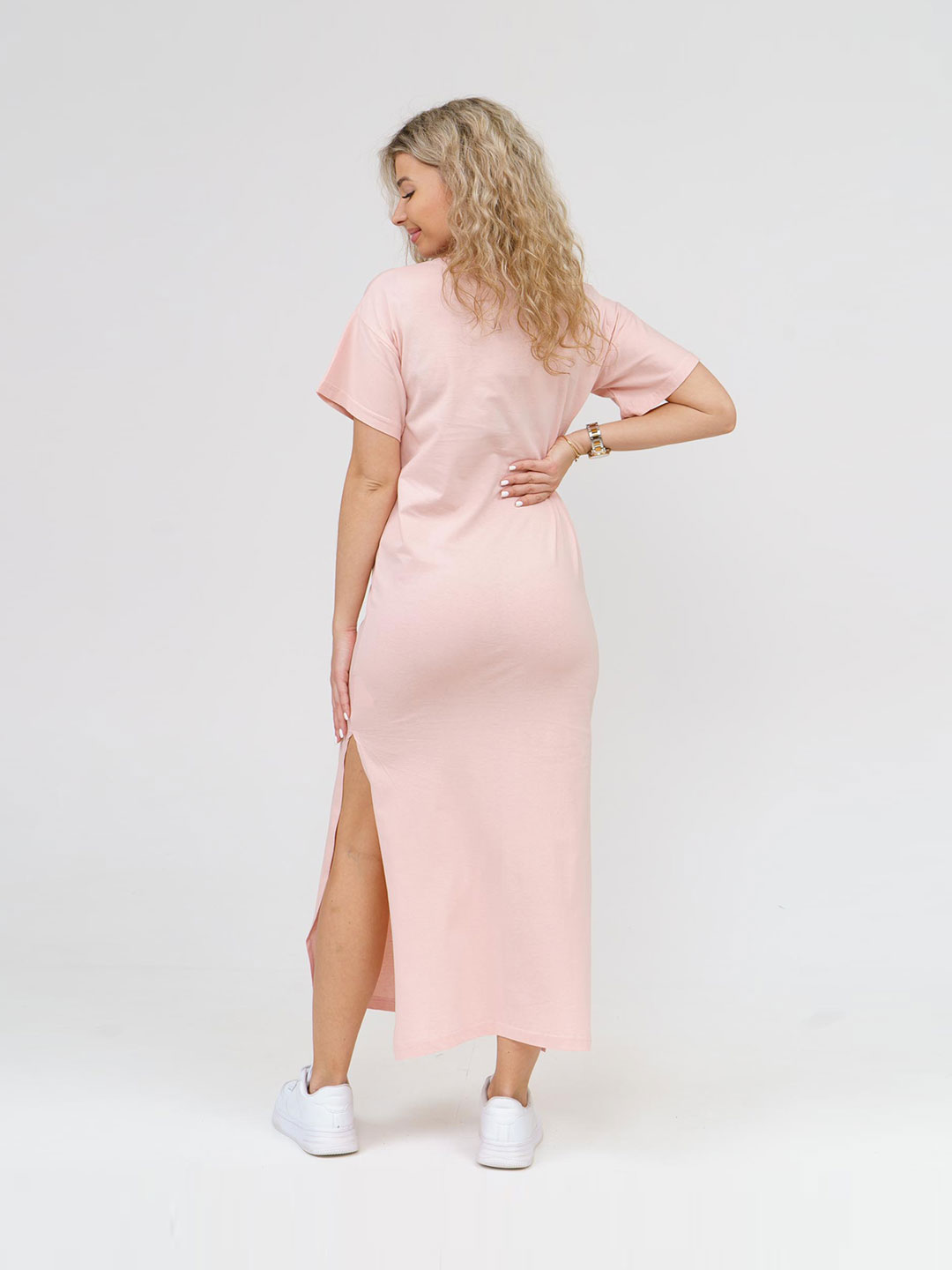 Однотонное платье-футболка с минималистичной печатью - это именно тот предмет гардероба, который может объединить в себе стиль и комфорт. Мягкий и легкий материал, свободный крой, короткие рукава и высокие разрезы по боковым швам позволяют с комфортом использовать платье в жаркую погоду. Такое платье футболка станет отличным выбором на каждый день и подойдет для любых целей, хорошо сочетаясь с самыми разными элементами гардероба.