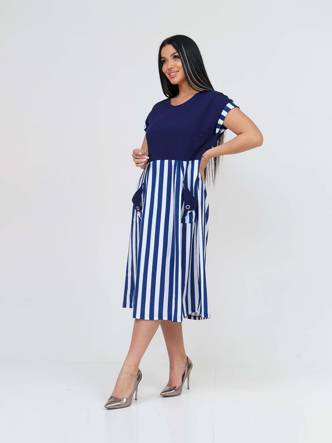 Платье женское трапециевидного силуэта с О-образной горловиной, кокетка на завышенной талии. Рукав цельнокроеный, короткий, манжета с пуговицей. На юбке складки на переде и спинке, накладные карманы с отворотами и пуговицей. Длина платья ниже колен.