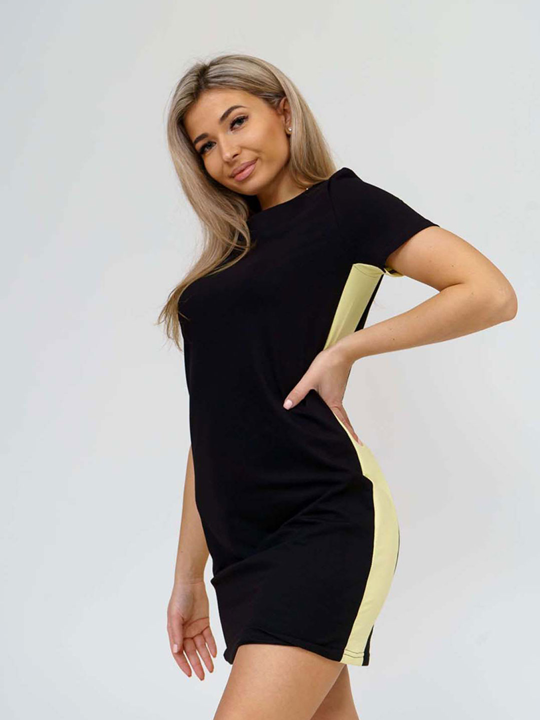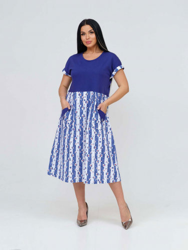 Стильное женское платье из трикотажного полотна, прямого силуэта, длиной выше колена. Вырез горловины О-образный. Рукав - втачной, спущенный. Легкое, удобное летнее платье на каждый день.