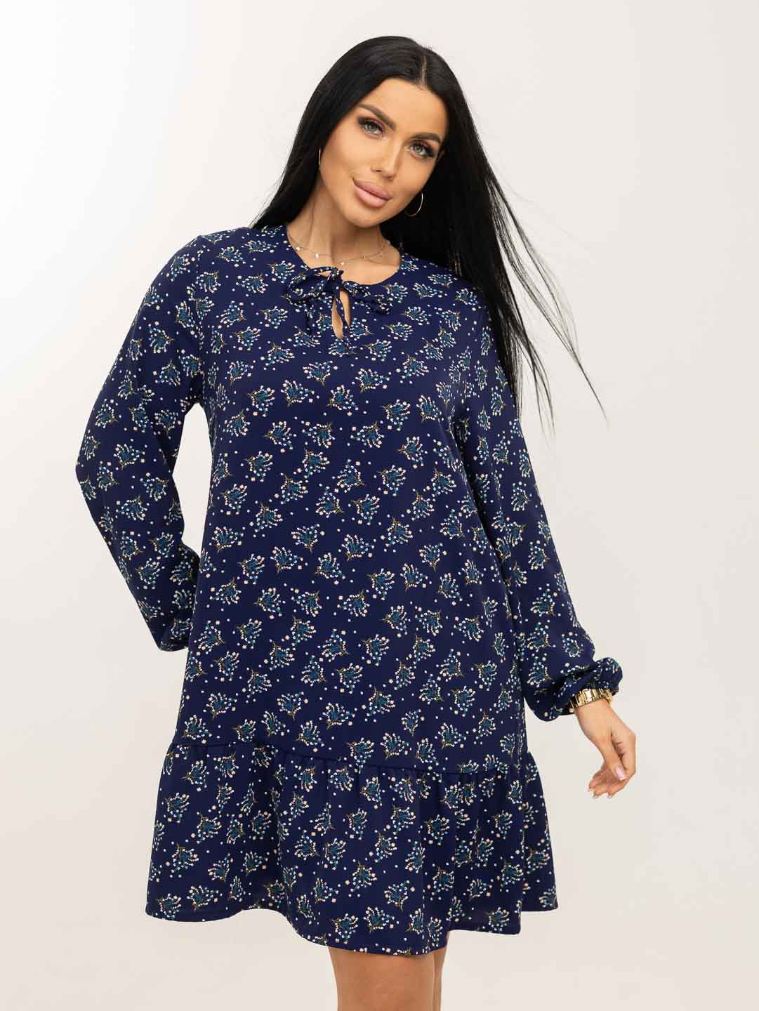 Женское платье из легкой ткани, свободного силуэта с воланом по низу изделия, длинным рукавом, округлой горловиной с завязками. Наше платье отлично будет смотреться как с кедами и сумкой кросс-боди, так и с туфлями на каблуке и широким ремнем.