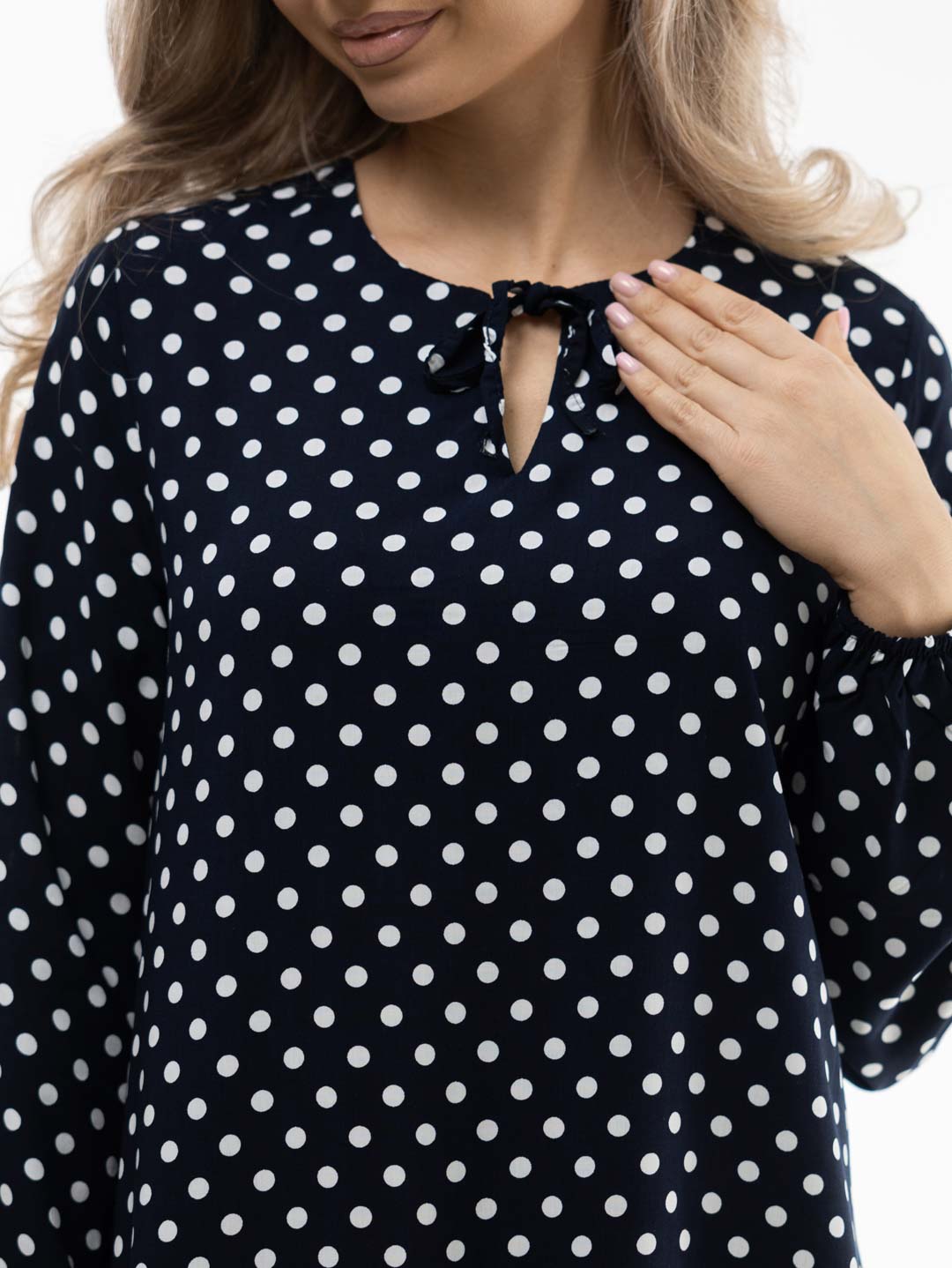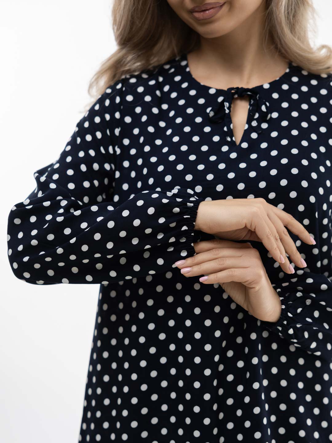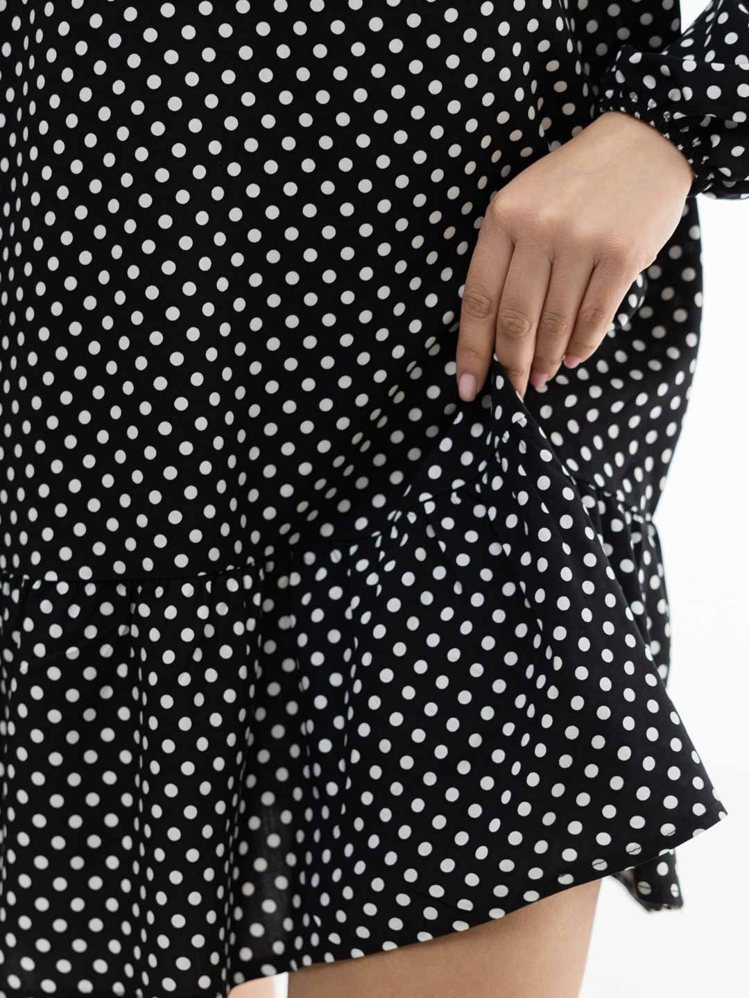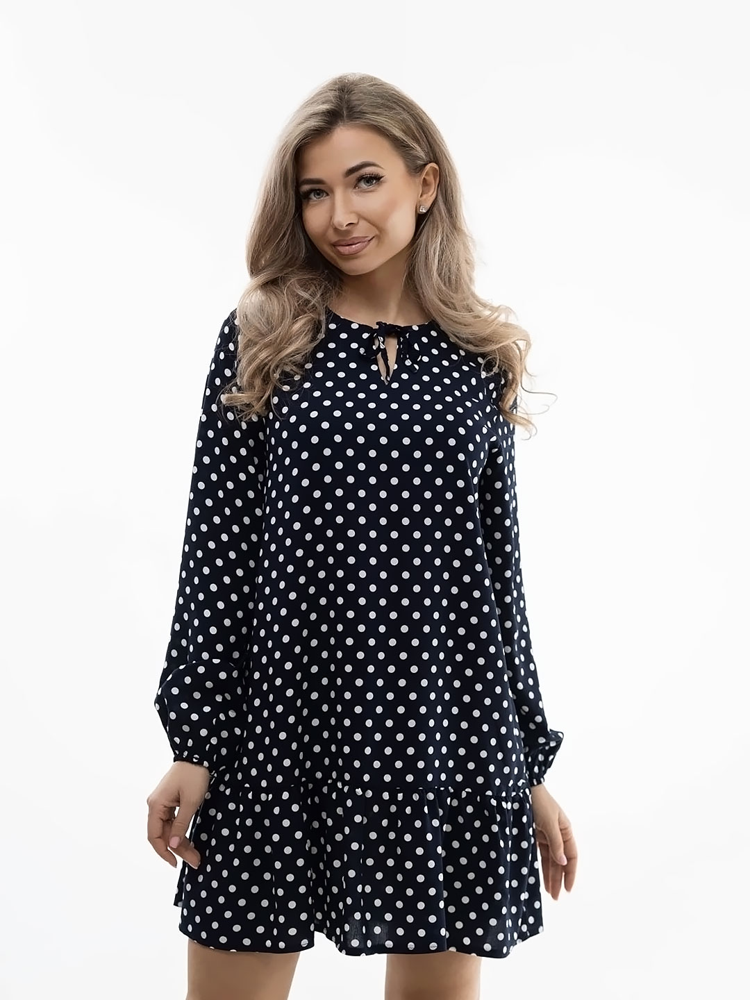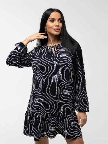 Женское платье из легкой ткани, свободного силуэта с воланом по низу изделия, длинным рукавом, округлой горловиной с завязками. Наше платье отлично будет смотреться как с кедами и сумкой кросс-боди, так и с туфлями на каблуке и широким ремнем.