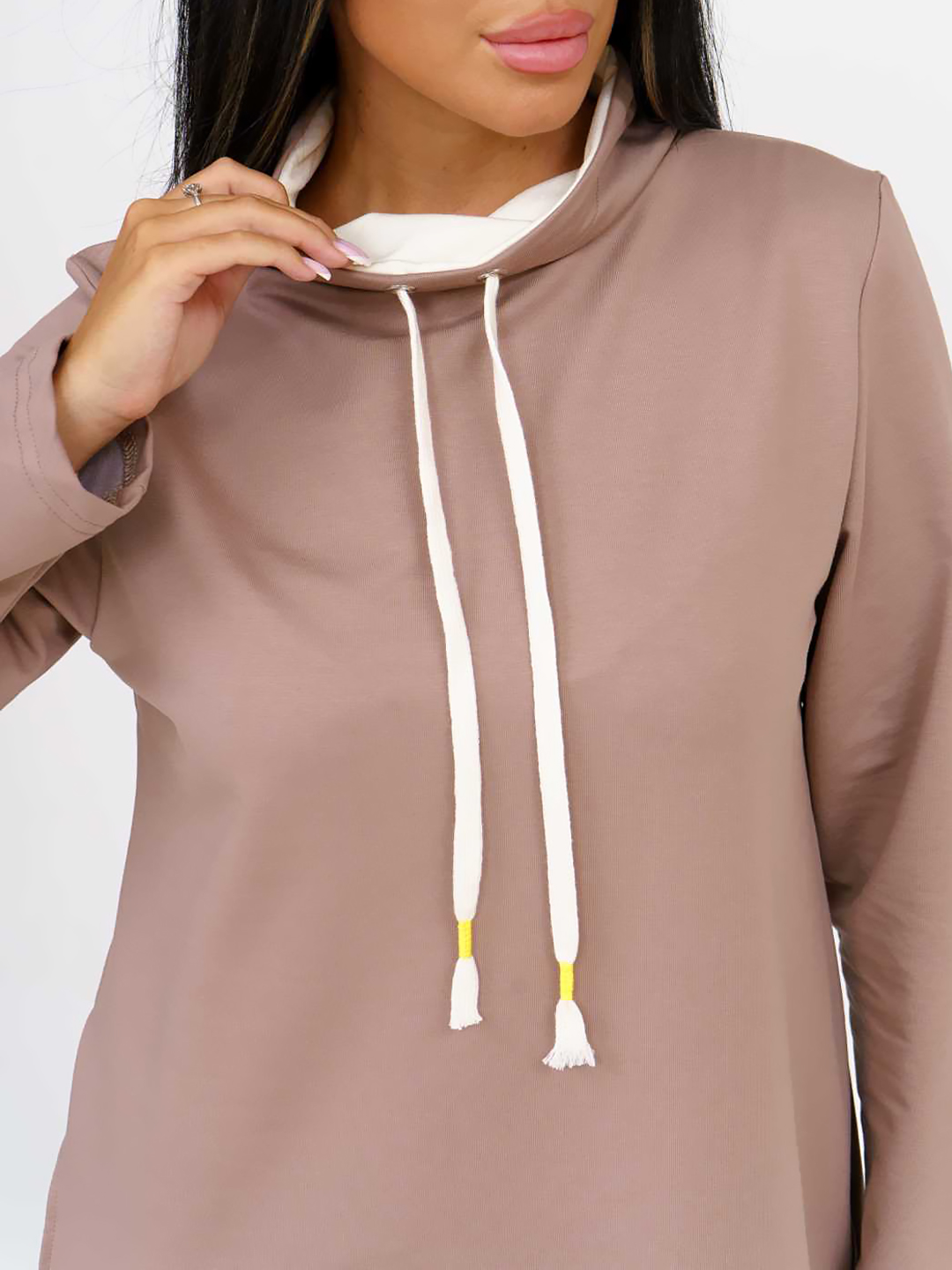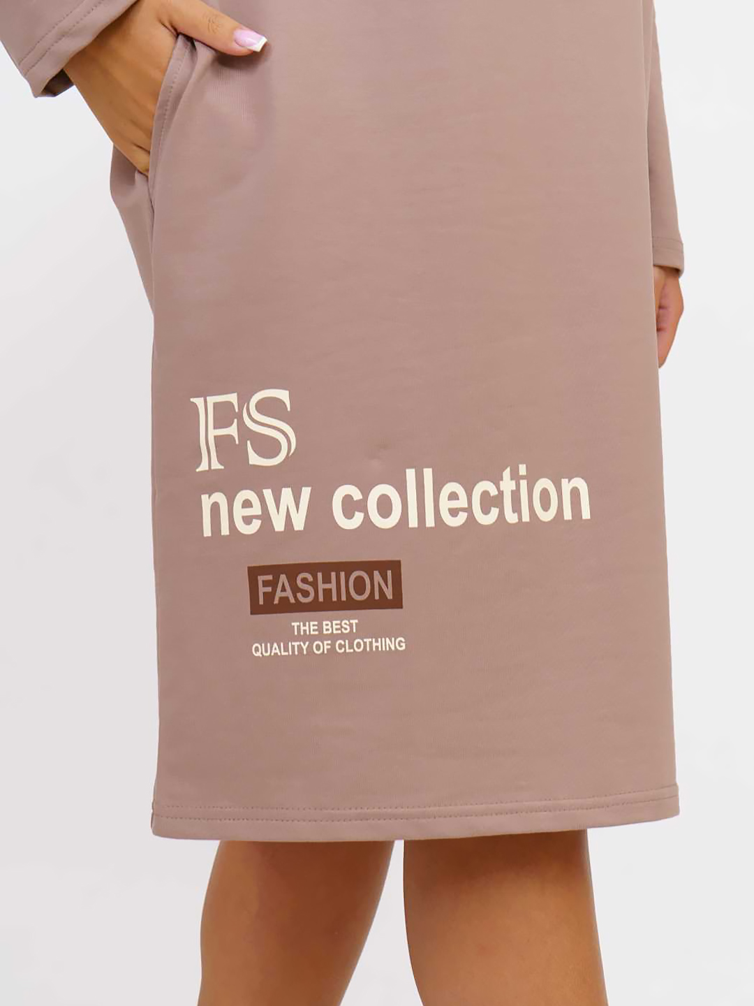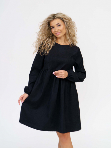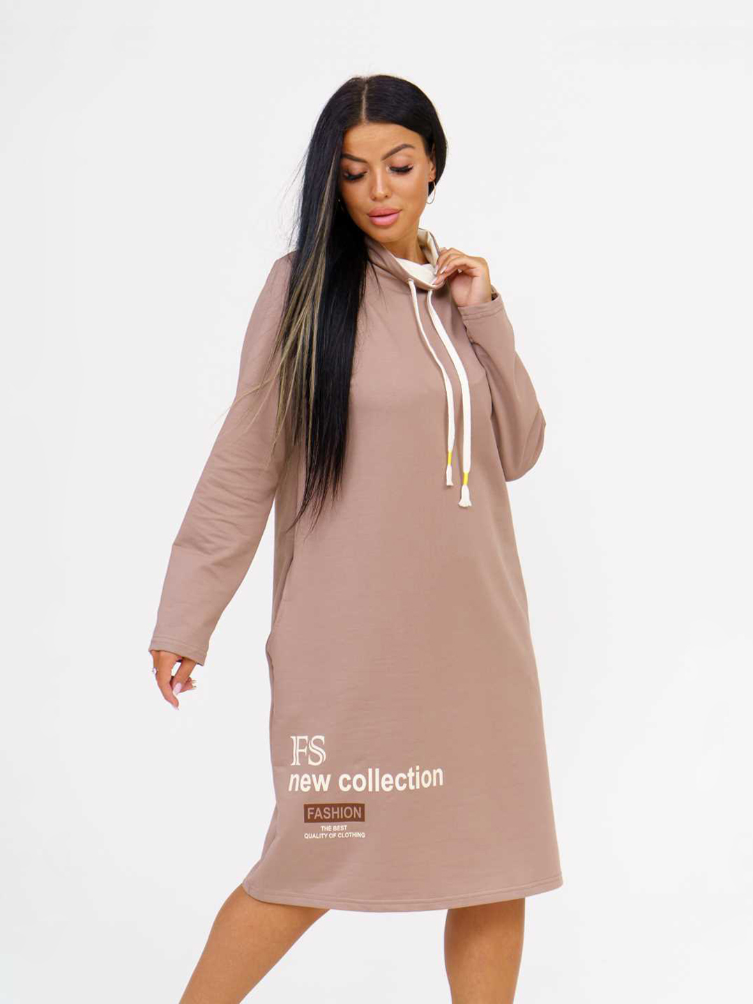 Платье женское полуприлегающего силуэта длинной чуть ниже колена. Рукав базового покроя, длинный. Воротник стойка с декоративной лентой, нижняя часть которого выполнена из отделочного материала. На полочке печатный рисунок. В боковых швах карманы.