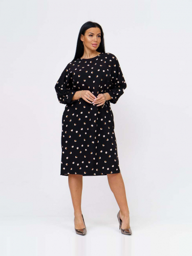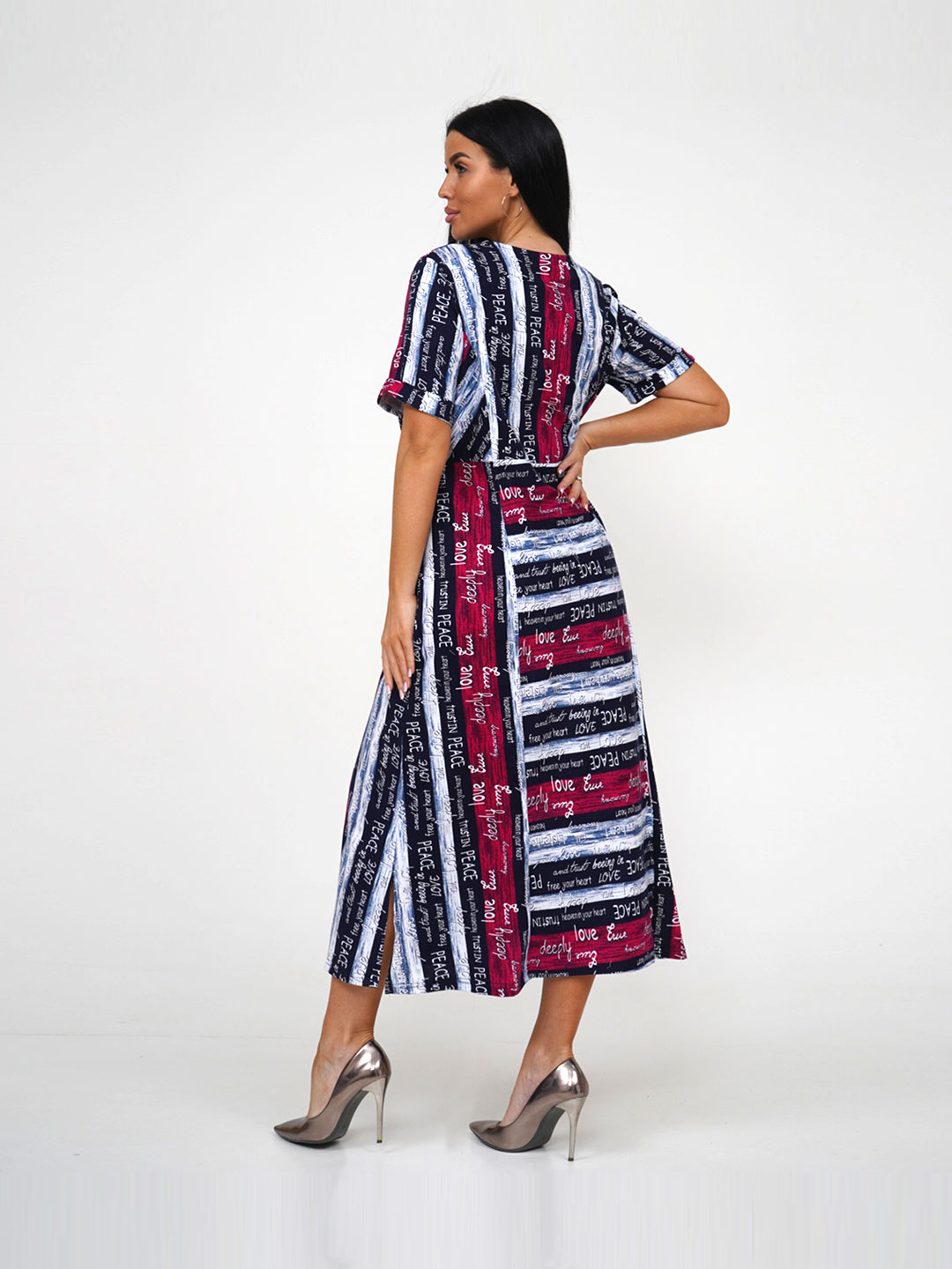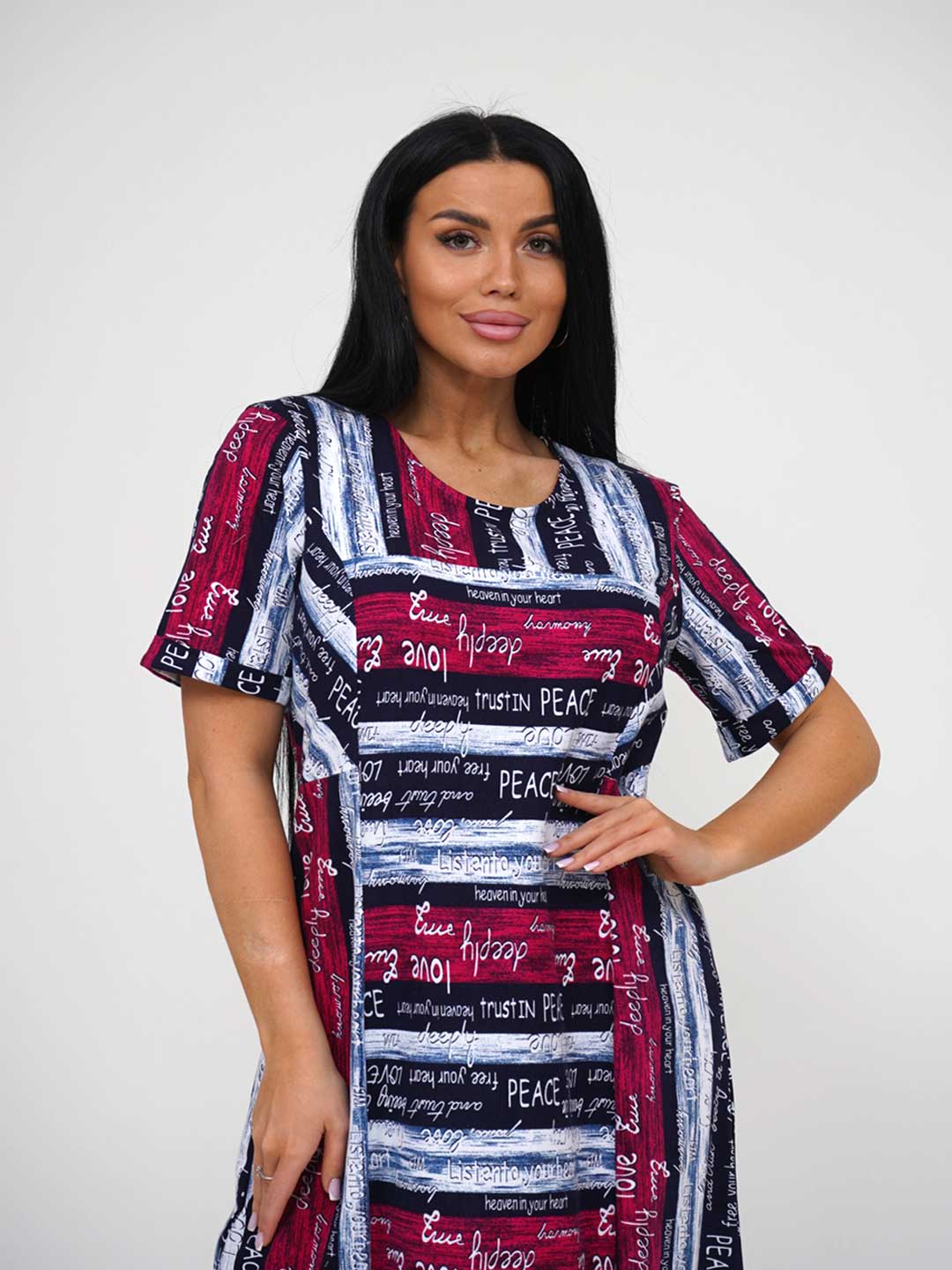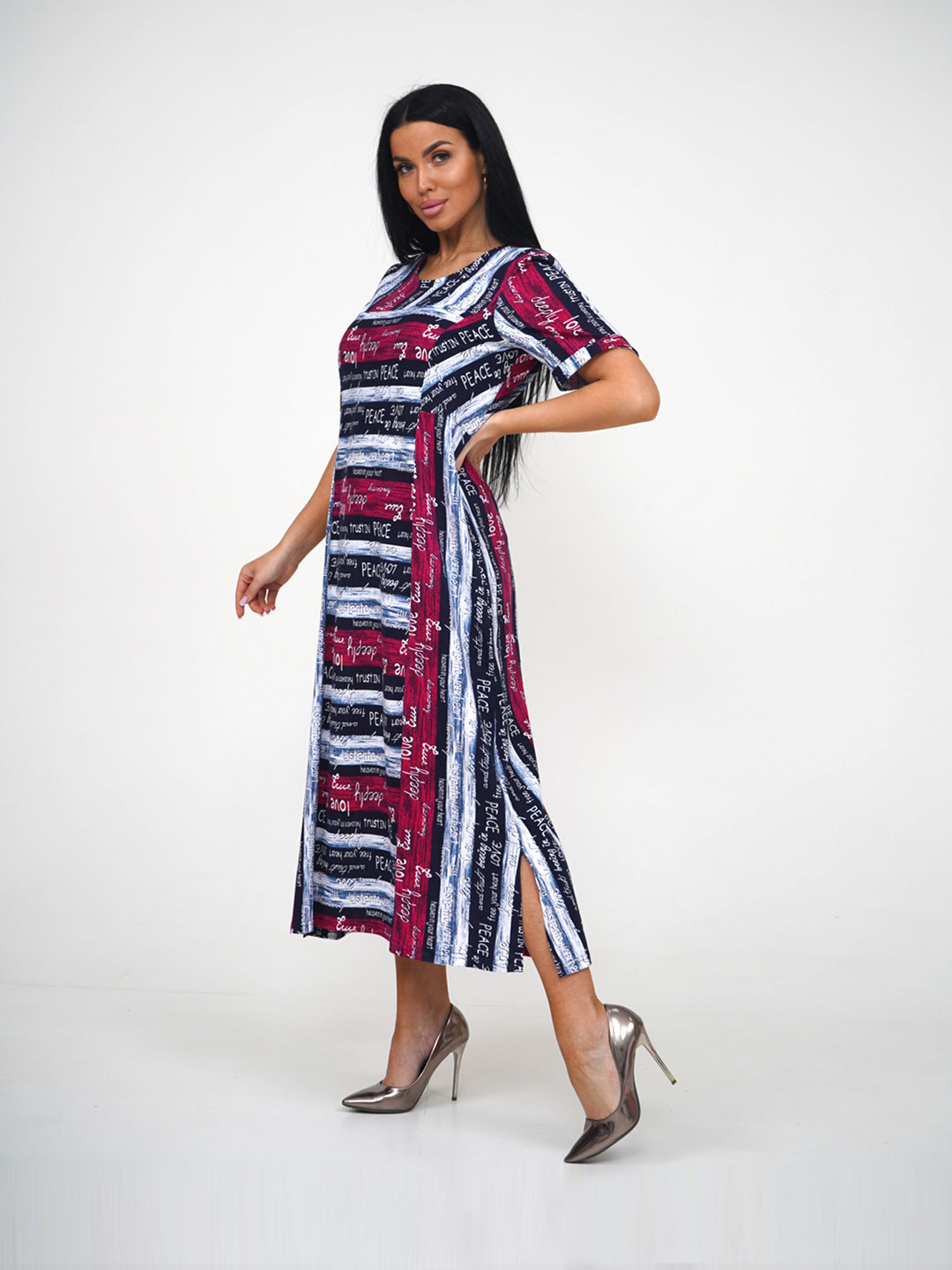 Женское трикотажное платье, длиной ниже уровня колена. Вырез горловины О-образный. Рукав - короткий. По низу фигурная вставка.