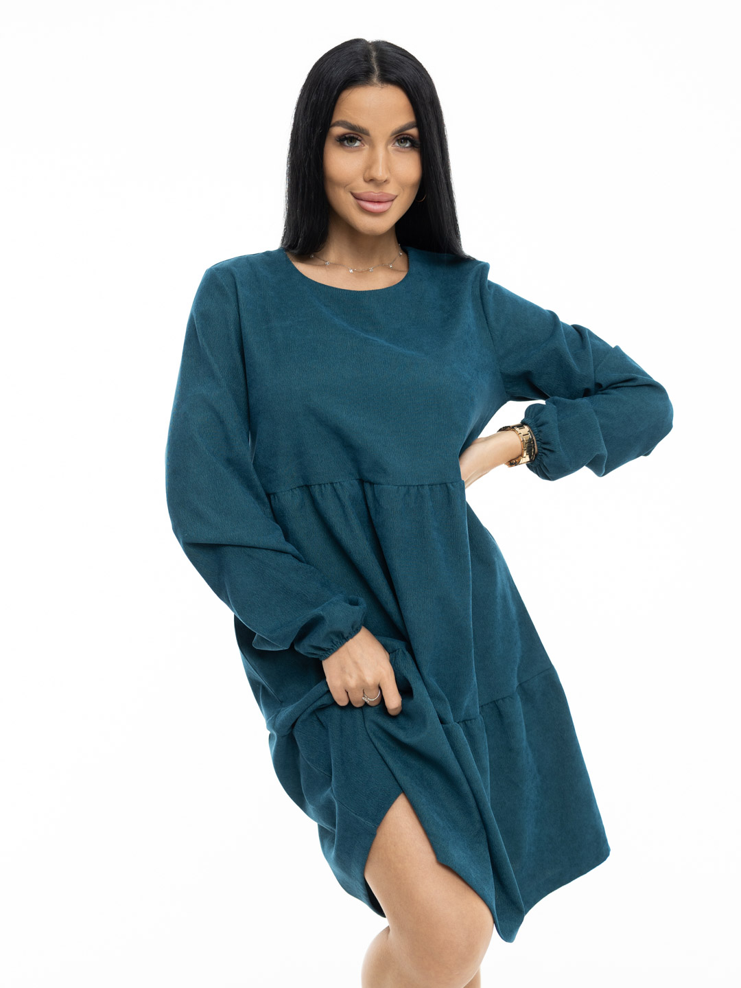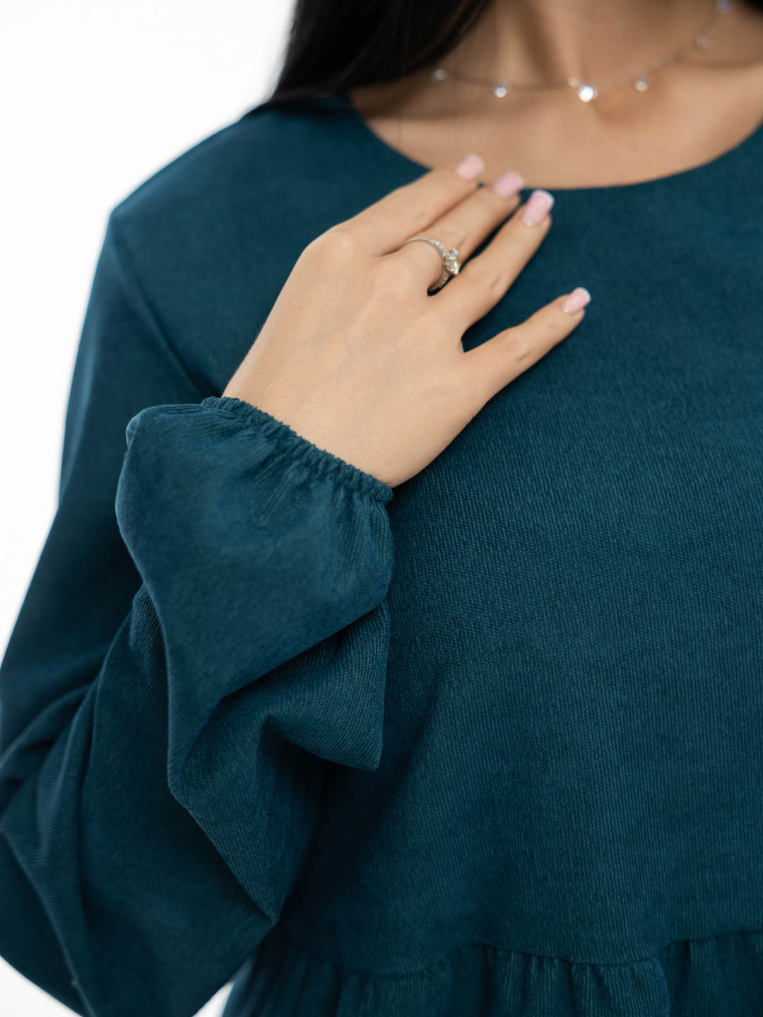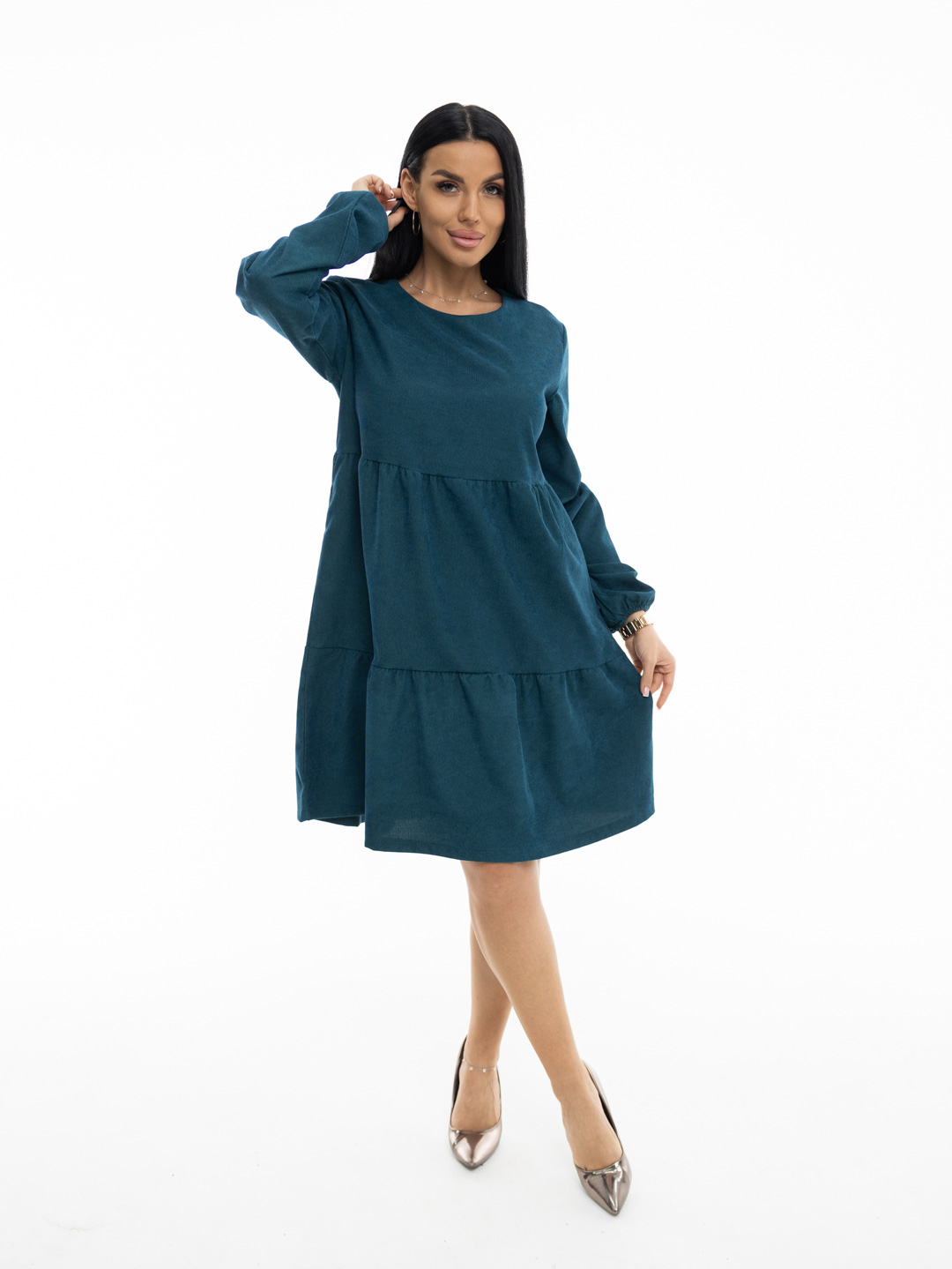 Вельветовое теплое платье благодаря идеальной посадке подойдет любому типу фигуры. Платье трапециевидной формы с воланами, О-образной горловиной, длинным втачным рукавом на резинке. Платье отлично подойдет на каждый день, в нем вы будете чувствовать себя комфортно. Дополните образ брошью, высокими сапогами, шубкой и вы будете неотразимы.