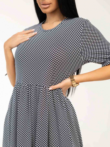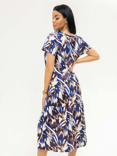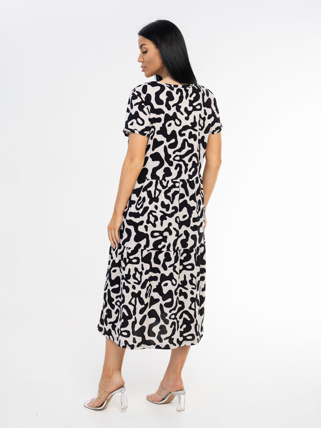 Женское платье из хлопка длины миди, с ярусной юбкой, О-образной горловиной, декоративной планкой и коротким рукавом. Линия талии завышенная, во втором ярусе находятся карманы.