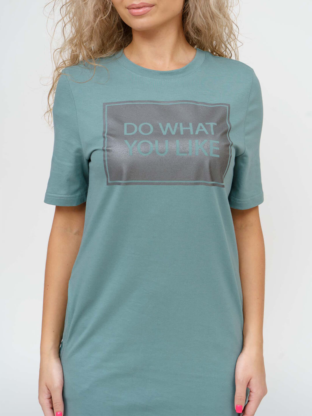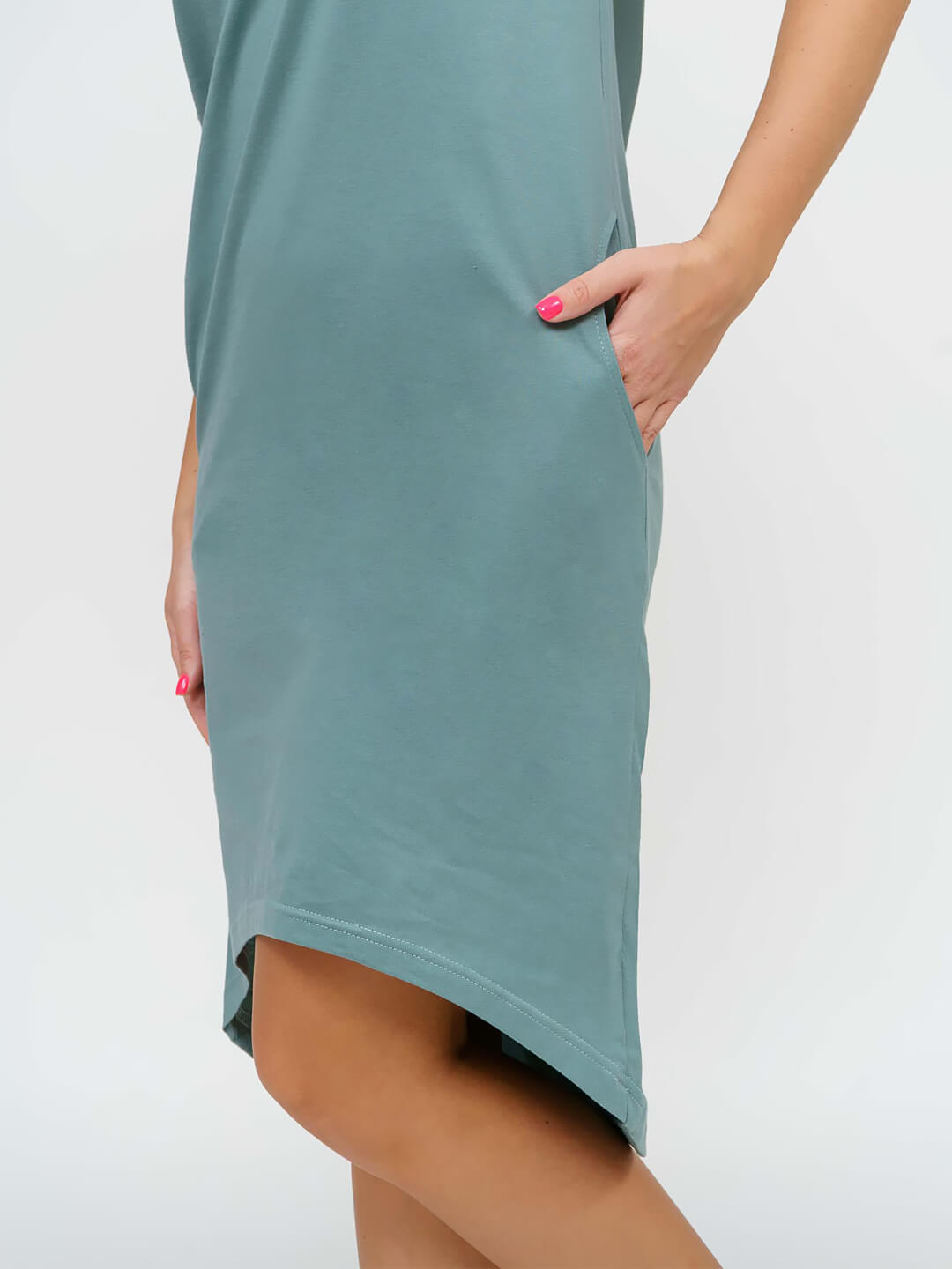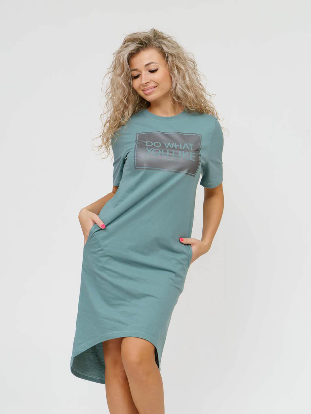Платье свободной силуэтной формы с О-образной горловиной, коротким втачным рукавом, карманами в боковых швах и ассимметричной линий низа. На полочке печатный рисунок.