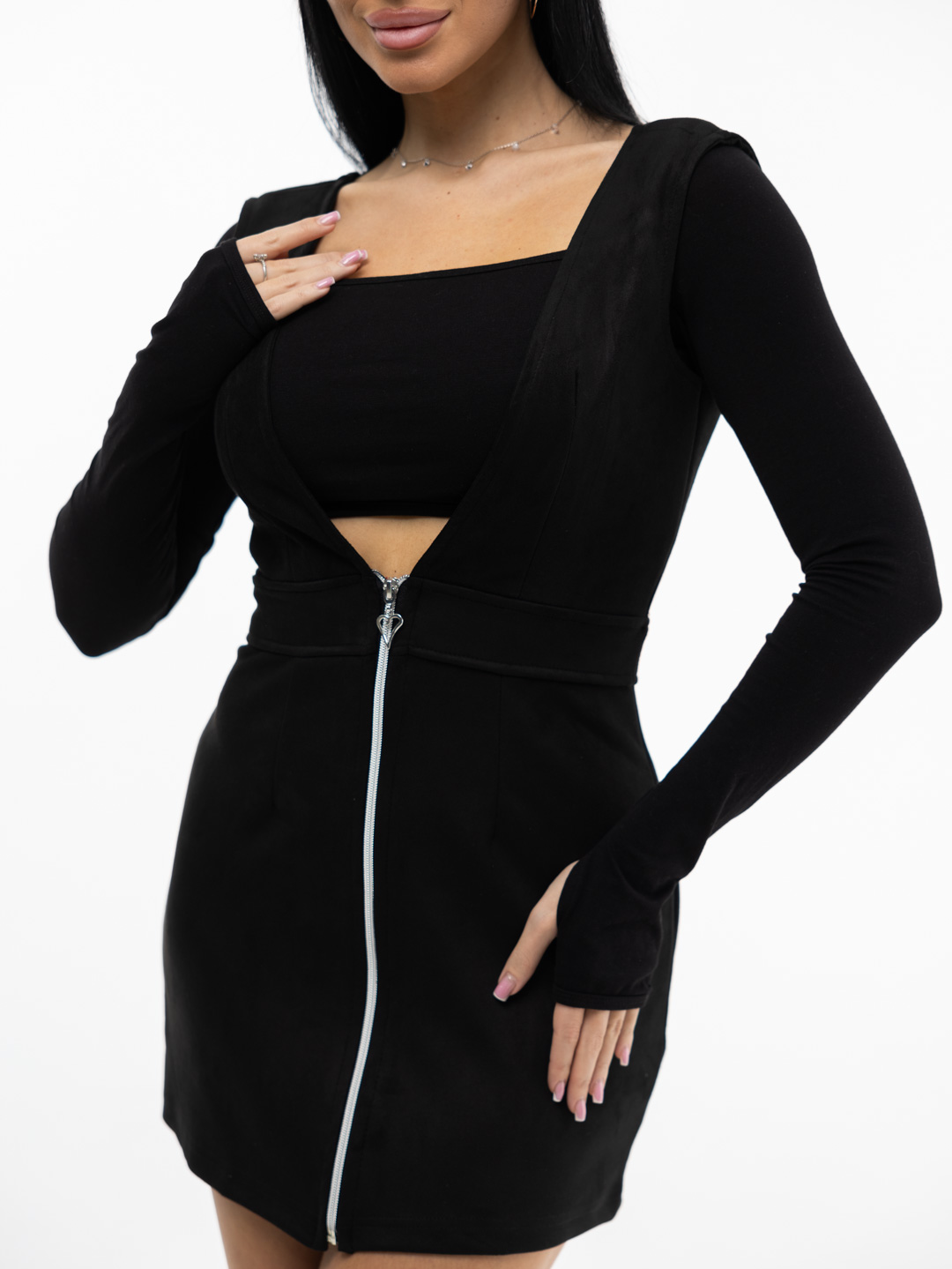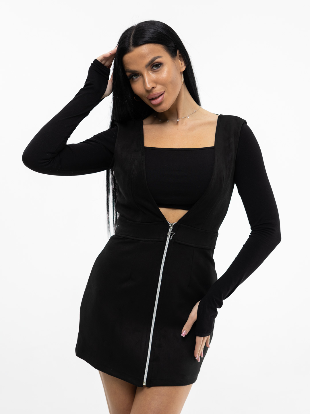 Женский замшевый сарафан с V-образным вырезом, длины мини. Отлично будет смотреться с водолазкой, рубашкой или топом. Идеально дополнит базовый гардероб, с ним Вы сможете составить много новых образов.