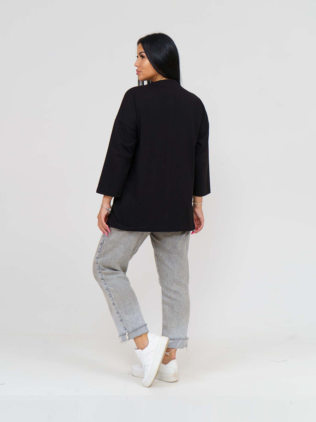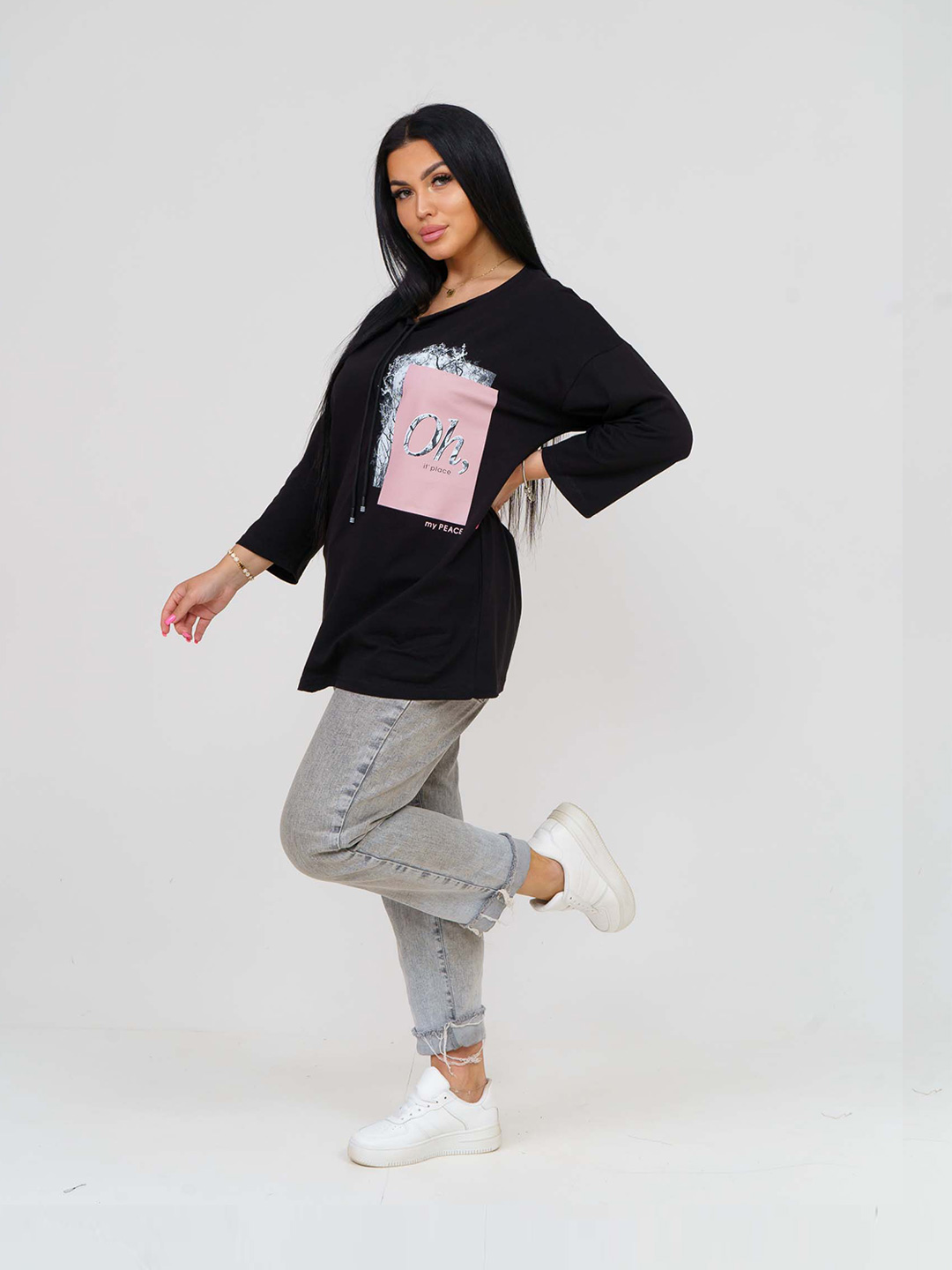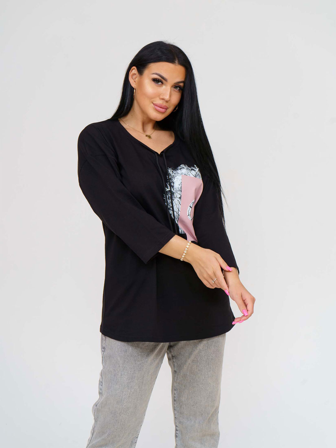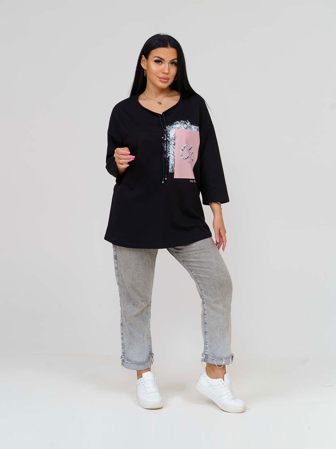 Туника женская, свободного силуэта, длиной чуть ниже уровня бедер, выполненная из качественного трикотажного полотна - кулирка. Вырез горловины V - образный, с регулировкой на шнурке. Рукав - спущенный, длиной 3/4. На передней части стильный принт. Удобная и практичная модель, на каждый день.