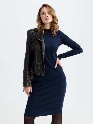 Платье женское прилегающего силуэта – «Футляр», из однотонного трикотажного х/б полотна с выработкой «рубчик». Изделие базового покроя, с длинным втачным рукавом на манжете и воротником – стойкой, длиной ниже линии колена. Платье прекрасно впишется, как в классический, так и спортивный стиль девушки-модницы, желающей подчеркнуть стройность своей фигуры.
