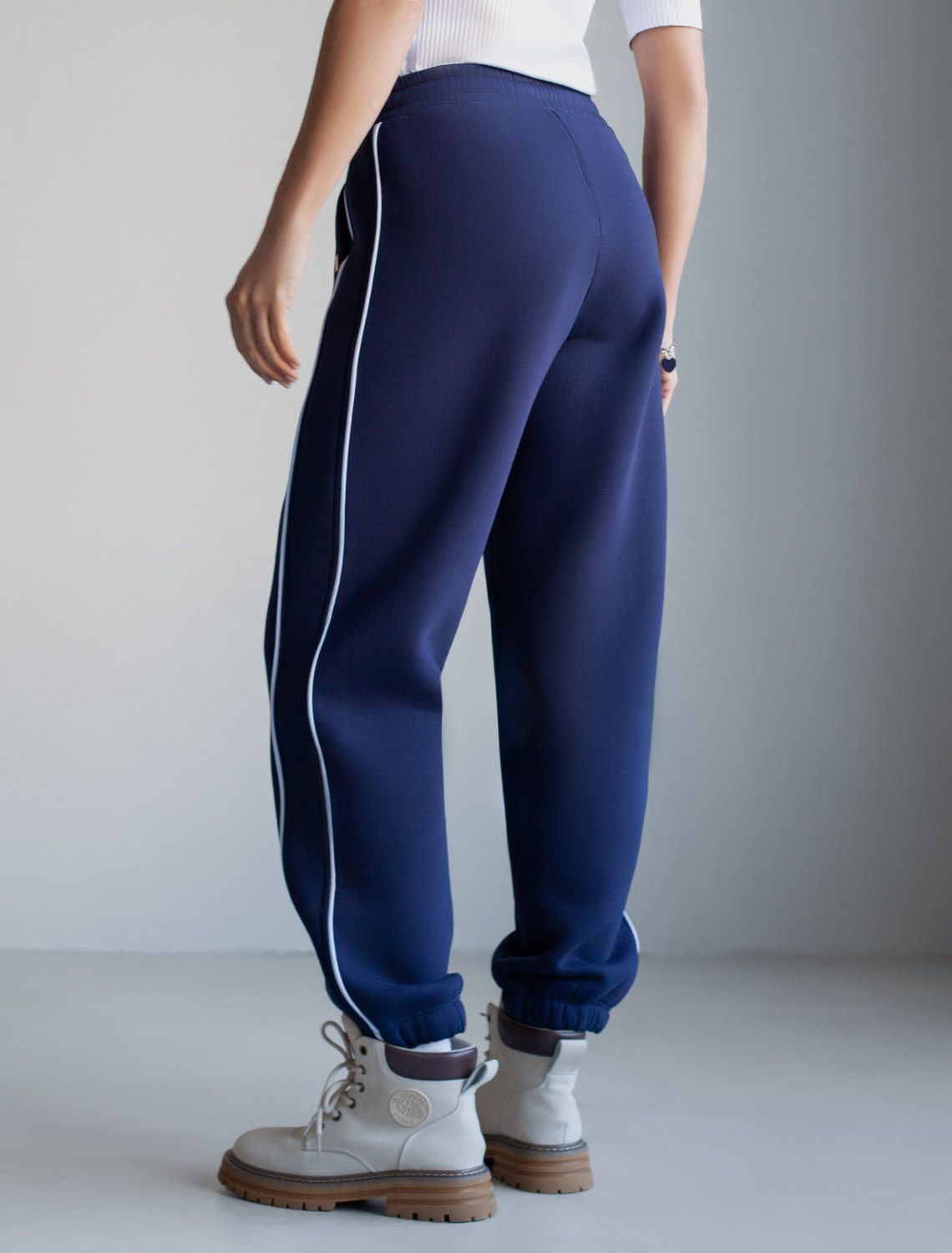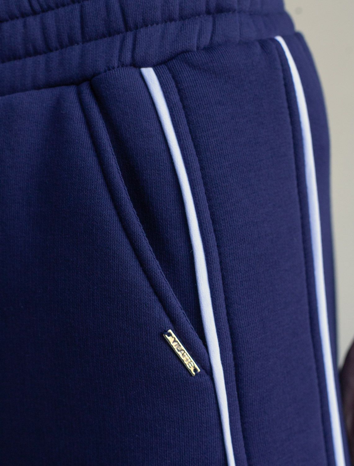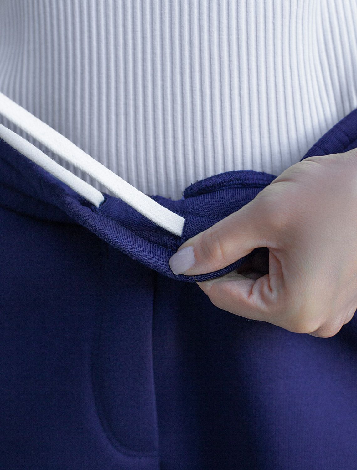 Теплые брюки джоггеры темно-синего цвета с эффектом меланж из эластичного футера трехнитки с начесом созданы для максимального комфорта в холодную погоду. Мягкий материал приятный к телу, хорошо держит форму, не вытягивается и не теряет форму даже при активной носке. Благодаря дышащим свойствам премиального футера, брюки подходят на любую погоду, обеспечивая оптимальный микроклимат и уют. Свободный крой и эластичный широкий пояс делает посадку удобной для разных типов фигуры и размеров, включая большие и маленькие. Контрастные тонкие лампасы добавляют актуальности образу. Благодаря особенностям трехниточного плетения и внутреннему слою с начесом, эти брюки отлично сохраняют тепло в холодные осенние и зимние дни, при этом в них вы будете выглядеть модно и современно. Сочетайте в комплекте с худи D49.142 D49.143